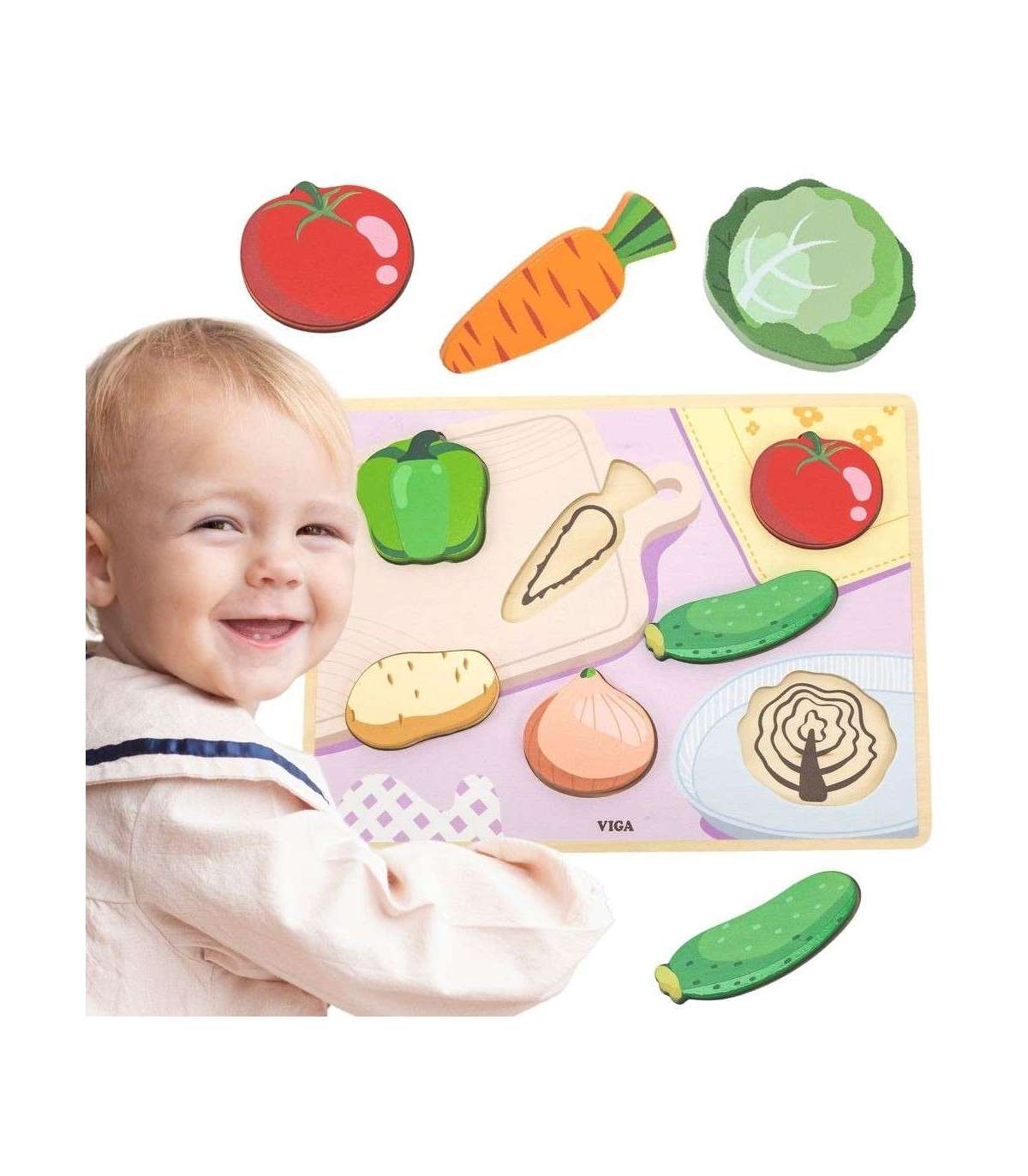 Puidust pusled brändilt VIGA köögiviljateemal. Komplektis on värviline alus ja 7 osa. Mäng seisneb köögiviljade plaatide sobitamises vastavatesse kohtadesse värvilisel alusel, kuhu lihtsustuse huvides on joonistatud puuduolevate osade pildid. Selline mäng aitab arendada käeliigutuste täpsust, parandada silma-käe koordinatsiooni ning treenida mälu, loogilist mõtlemist ja keskendumist. Tänu osade paksusele saab puslesid kasutada ka teiste mängude jaoks kujukestena.