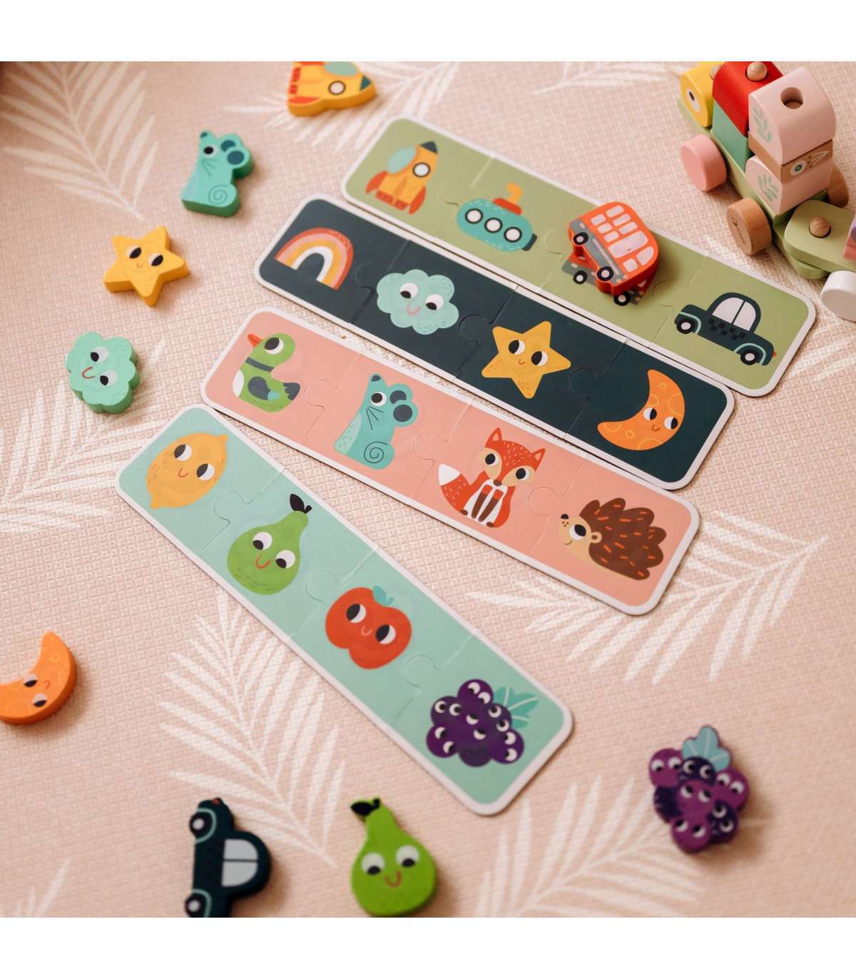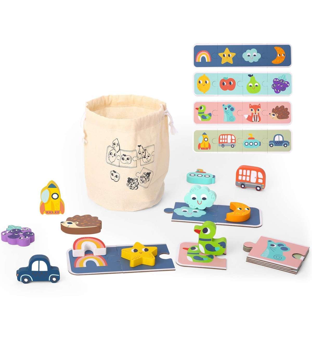 - Komplekt sisaldab 33 elementi – 16 puidust klotsi, 16 pildipuslet ja riidest kott