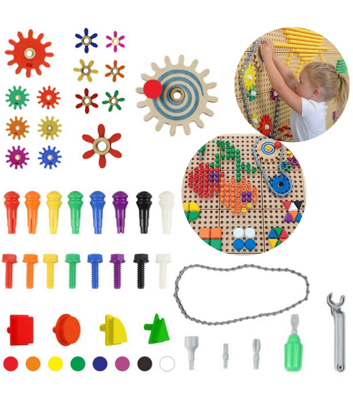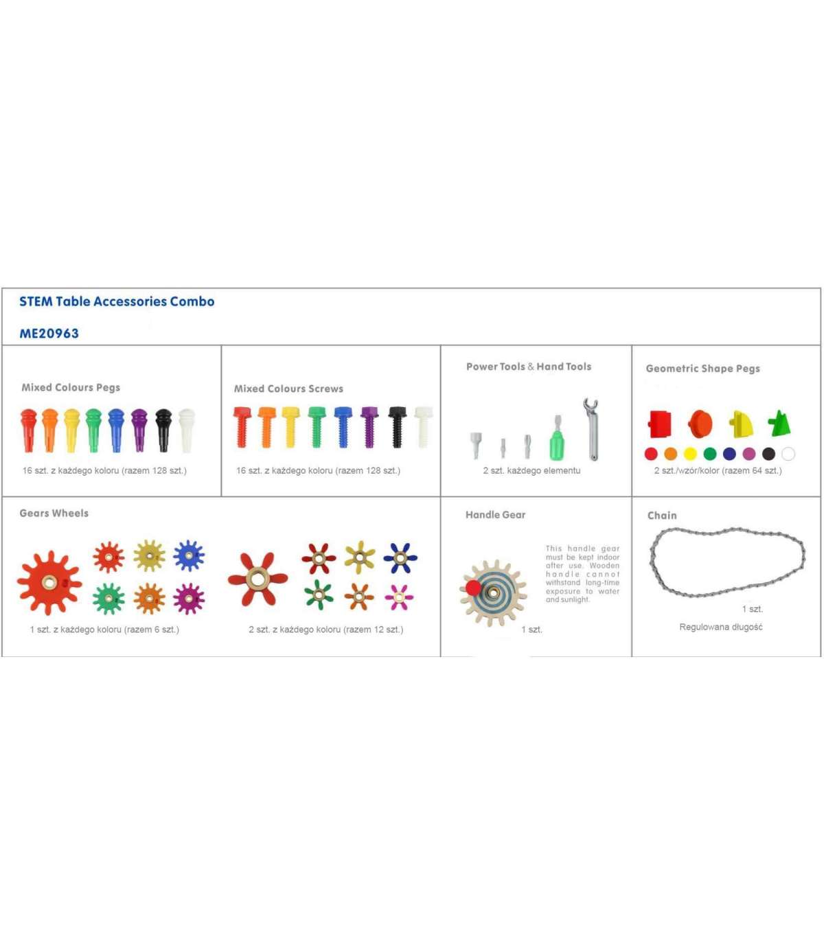 STEM-tarvikute komplekt tootjalt Masterkidz sisaldab põhilisi tarvikuid mängimiseks Masterkidz STEM-süsteemiga. Komplektis on 128 tüüblit, 128 kruvi, 64 geomeetrilist tüüblit, 2 tööriistakomplekti, 18 hammasratast, hammasratta hoidja ja kett. See komplekt on loodud loovaks mänguks ja teaduse tundmaõppimiseks läbi katsetamise ja konstrueerimise. Lapsed saavad neid tarvikuid kasutada erinevate mustrite ja konstruktsioonide loomiseks, mis arendab nende peenmotoorikat, loogilist mõtlemist ja arusaamist mehaanika ja inseneriteaduse põhimõtetest. See komplekt on täiuslik algus Masterkidz STEM-mänguks. See sobib nii seinaplaatide kui ka vabaltseisvate plaatidega; mängu alustamiseks on vaja üht neist.