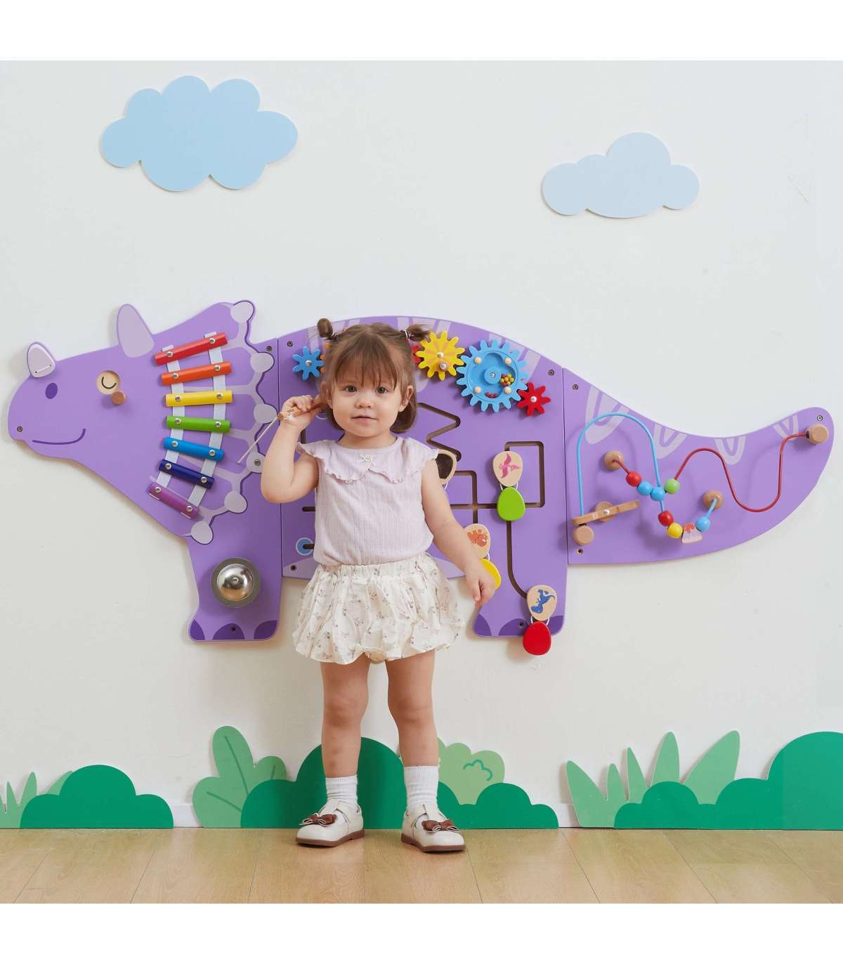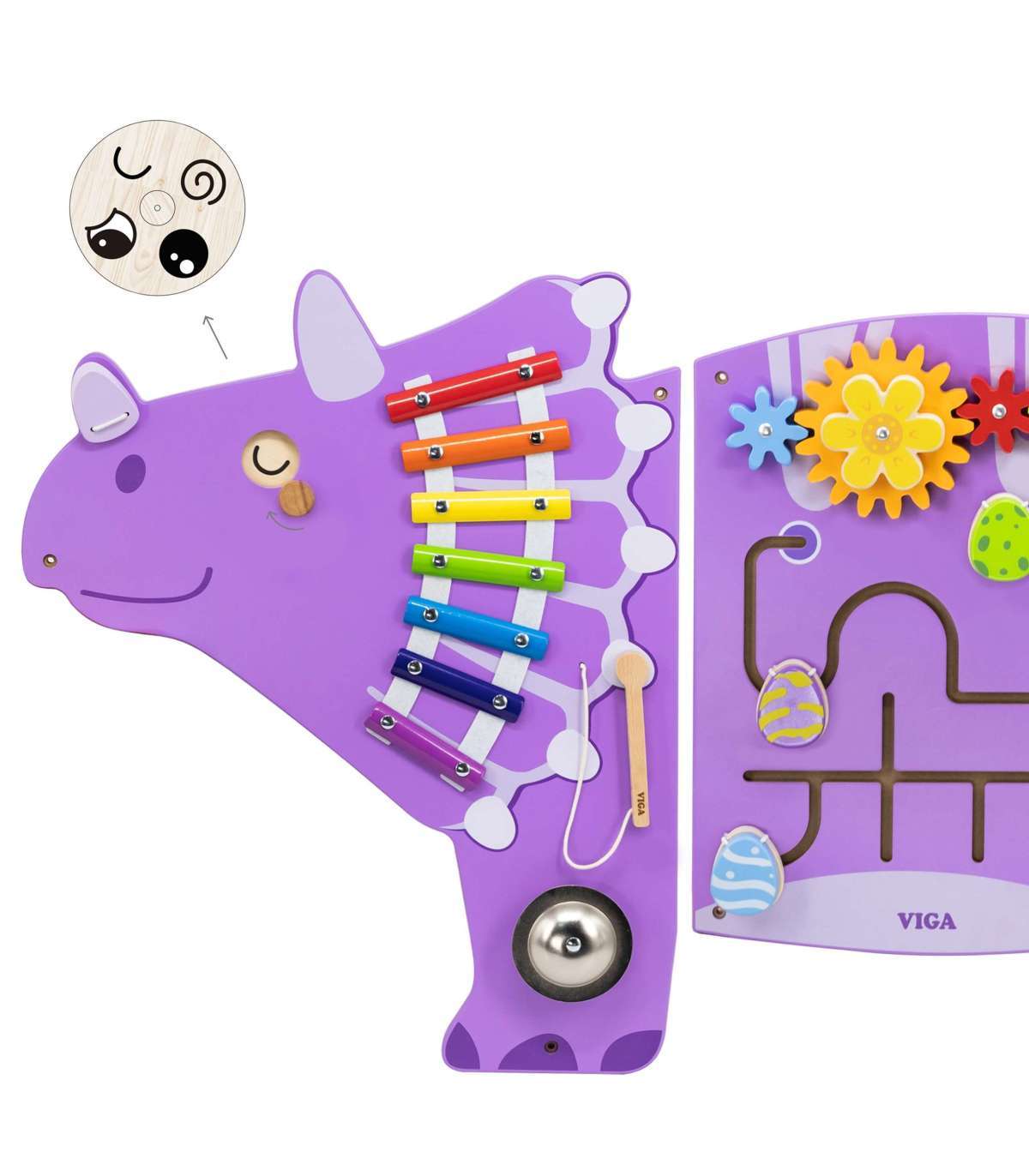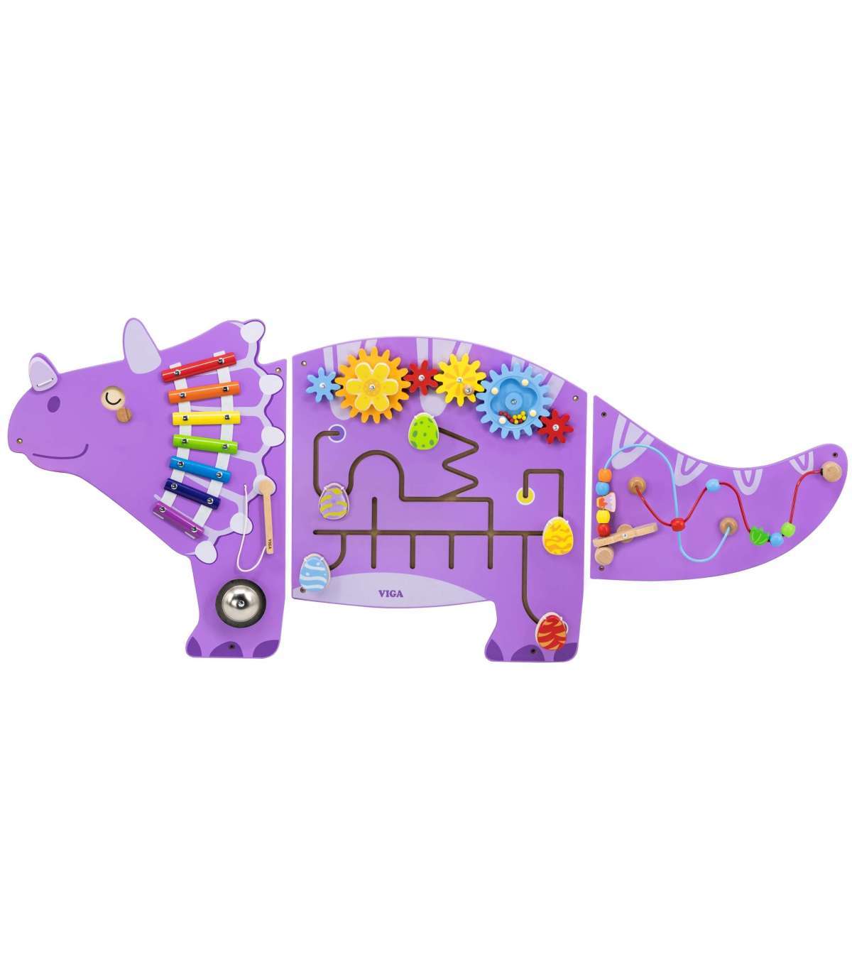 Värvikas Triceratopsi manipuleerimislaud brändilt Viga Toys on puidust, multifunktsionaalne seina mänguasi, mis pakub lastele tunde suurepärast mängu ja õppimist. Laud on mänguasi, millega saavad korraga mängida mitu last. Sellel on tegevusi nagu: hammasrattad, motoorne pärlirada koos pärliheitjaga, libisev labürint avanevate munadega, ksülofon, gong ja pöörlevad dinosauruse silmad. Geniaalne mänguasjade kombinatsioon koolidele, lasteaedadele, teaduskeskustele ja avalikele kohtadele.