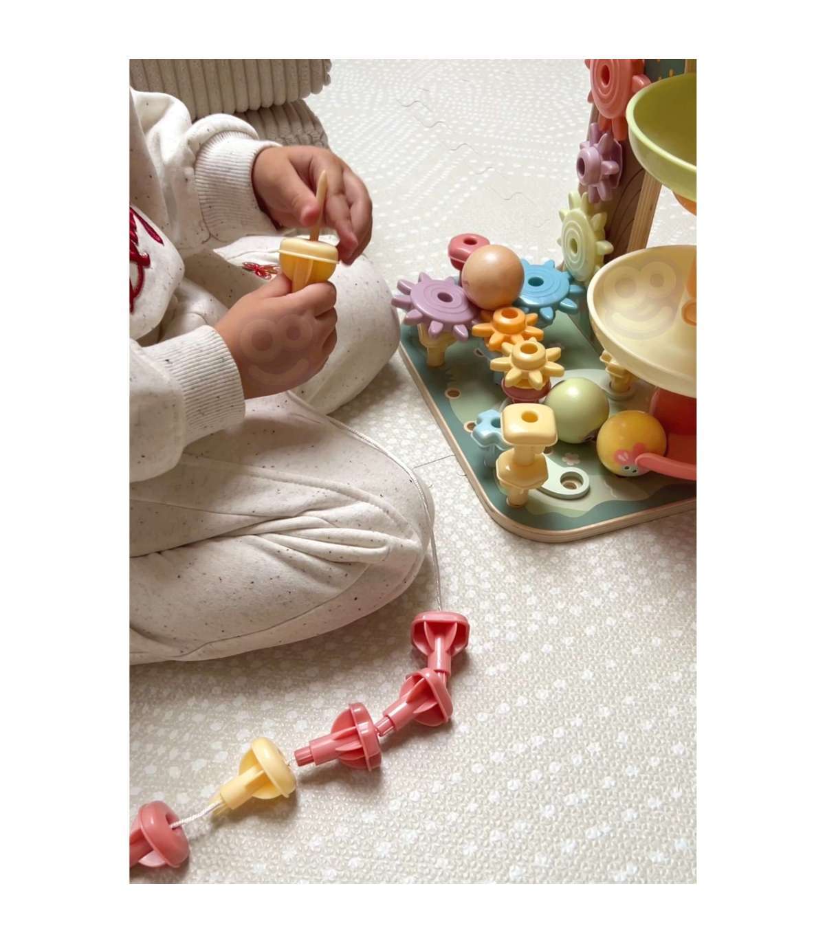- Peenmotoorikat — pallide, tihvtide ja nöörimise manipuleerimine aitab lapsel harjutada käte ja sõrmede liigutuste täpsust