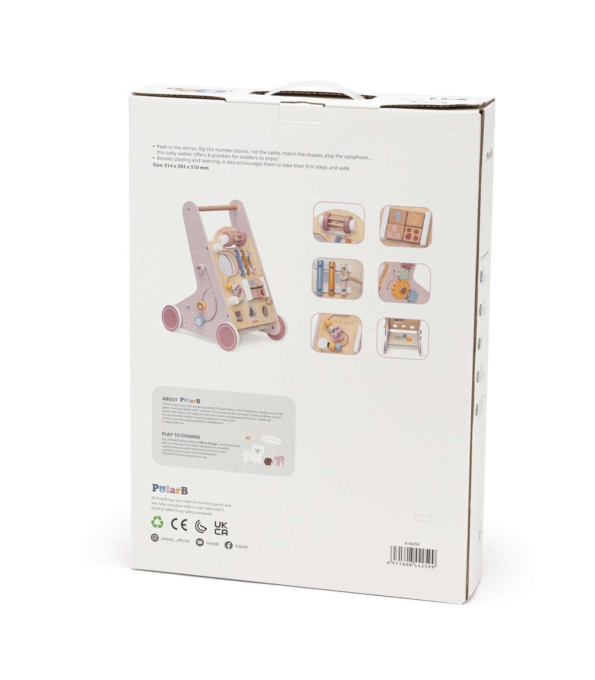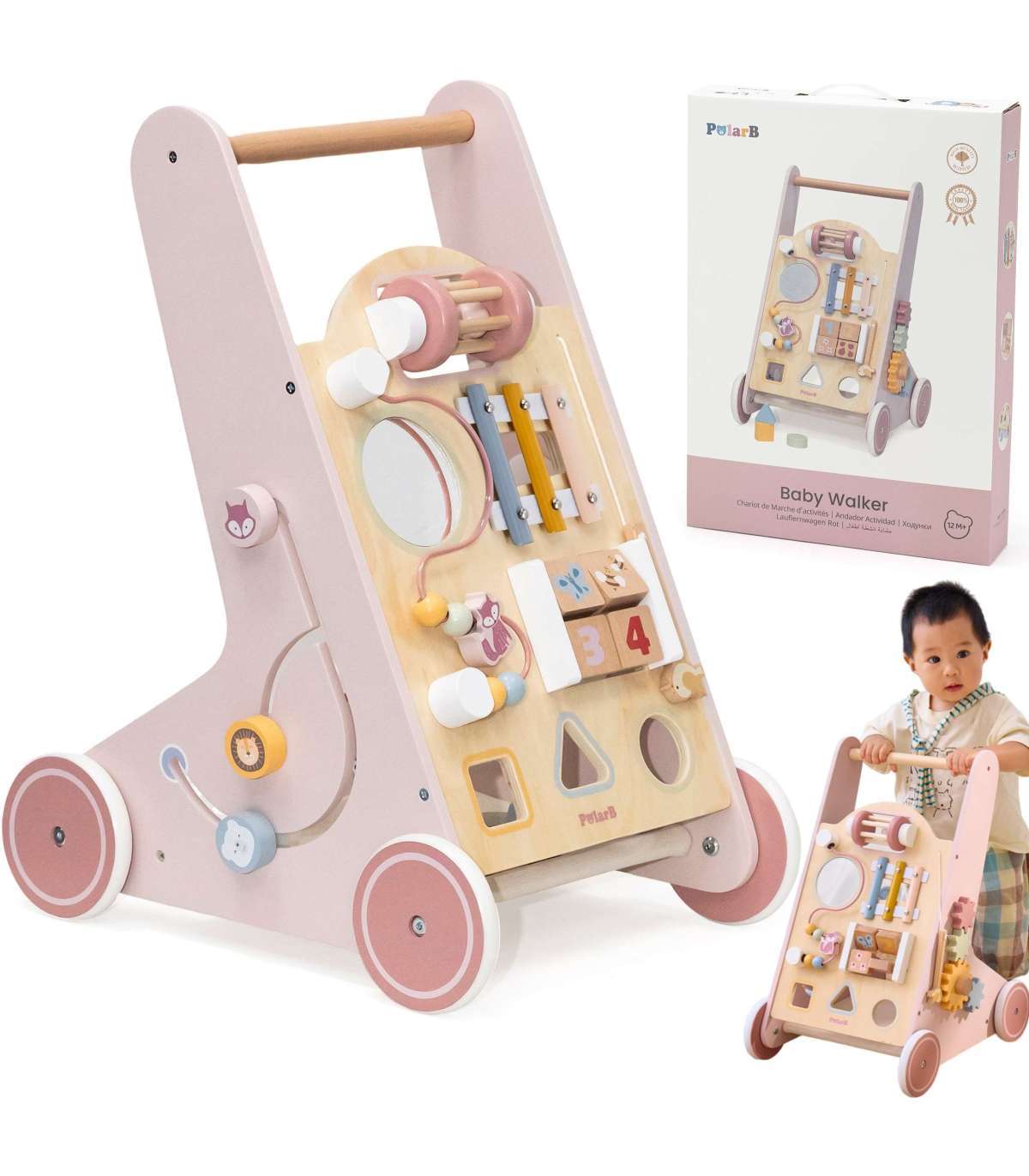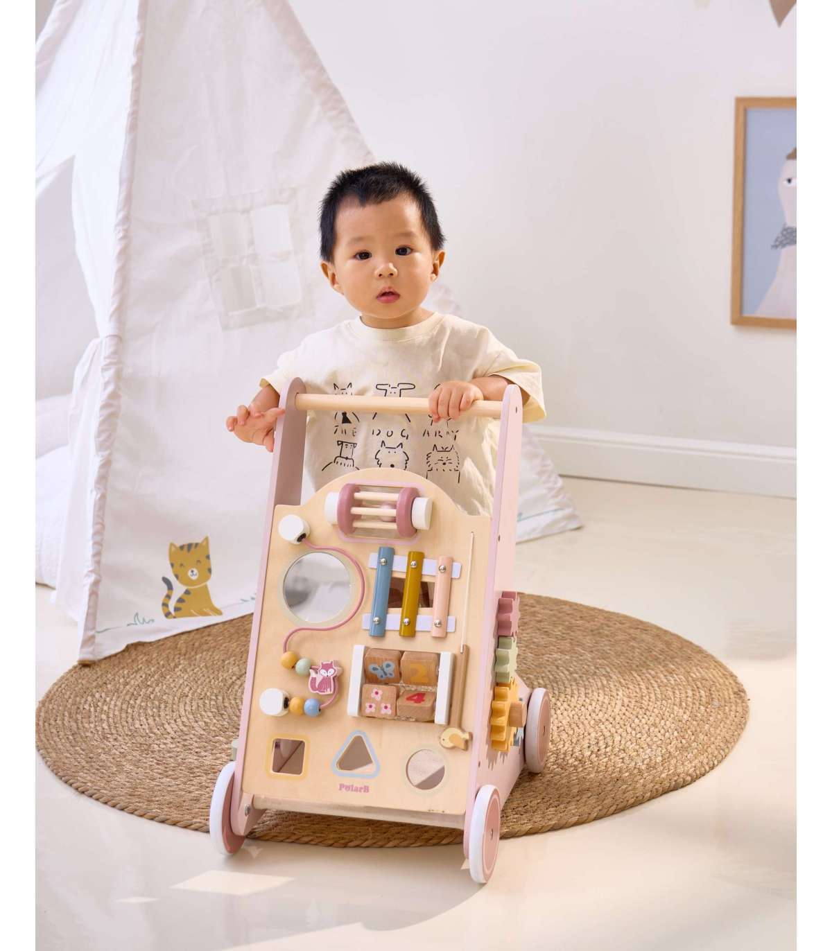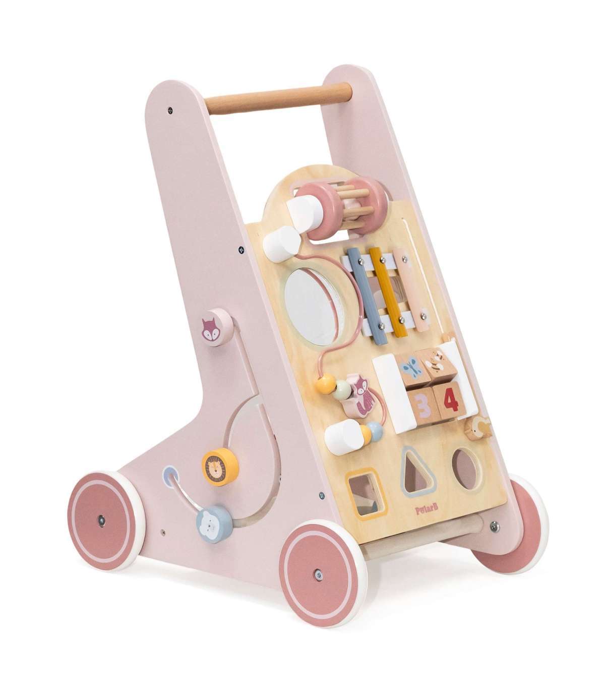 Różowy Chodzik dla Maluszków od marki PolarB to świetna zabawa i nauka w jednym! Oferuje interaktywne aktywności, takie jak podglądanie się w lusterku, obracanie klocków, turlanie grzechotki, dopasowywanie kształtów oraz granie na cymbałkach. Dzięki temu chodzik zachęca dzieci do stawiania pierwszych kroków, co jest kluczowym etapem w ich rozwoju. Dodatkowo, z tyłu znajduje się praktyczny schowek, idealny na ulubione zabawki.