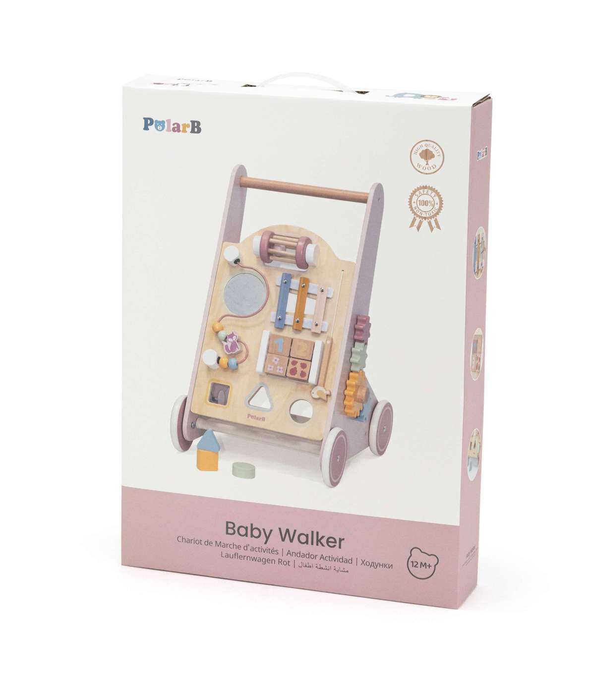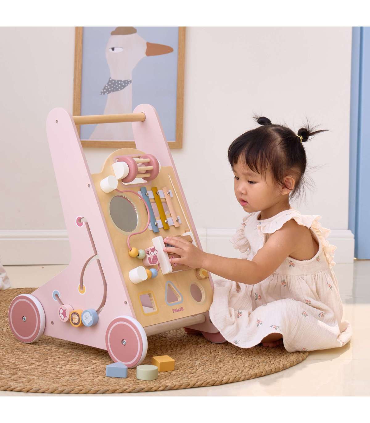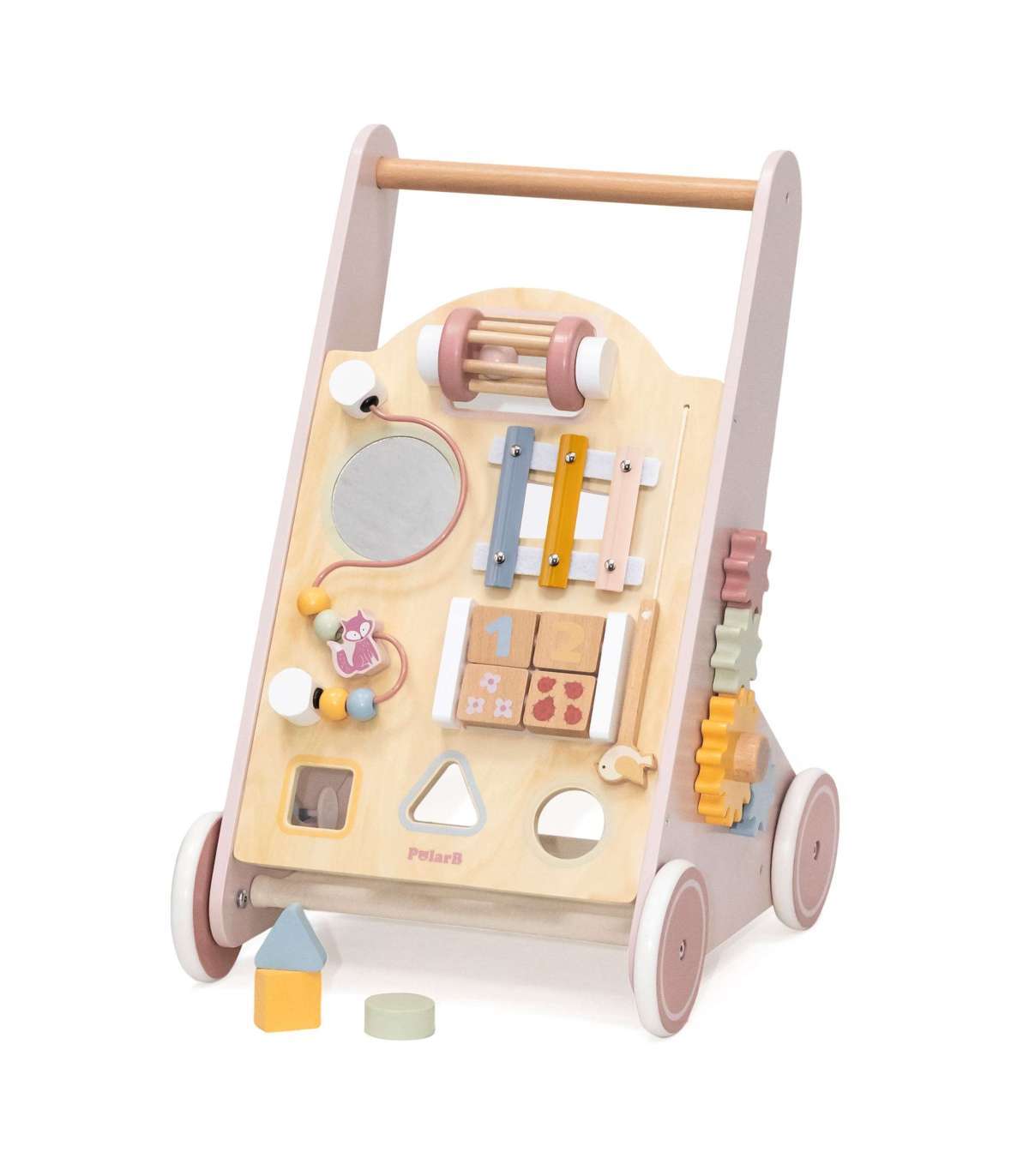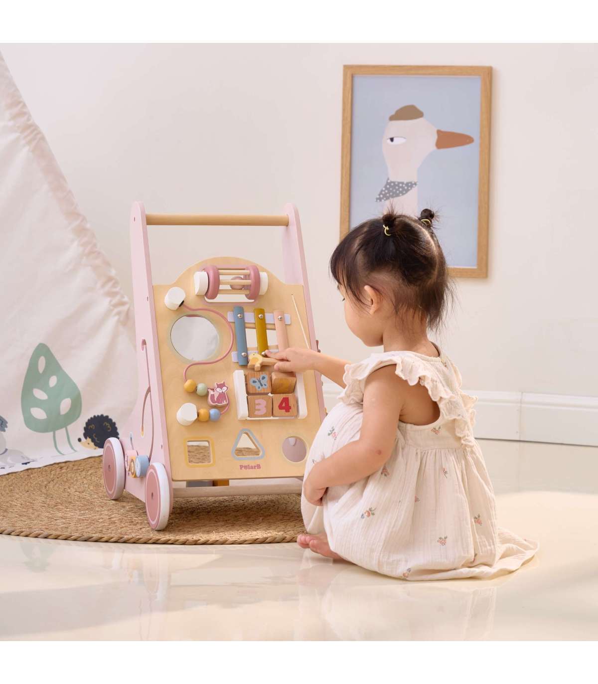 Różowy Chodzik dla Maluszków od marki PolarB to świetna zabawa i nauka w jednym! Oferuje interaktywne aktywności, takie jak podglądanie się w lusterku, obracanie klocków, turlanie grzechotki, dopasowywanie kształtów oraz granie na cymbałkach. Dzięki temu chodzik zachęca dzieci do stawiania pierwszych kroków, co jest kluczowym etapem w ich rozwoju. Dodatkowo, z tyłu znajduje się praktyczny schowek, idealny na ulubione zabawki.