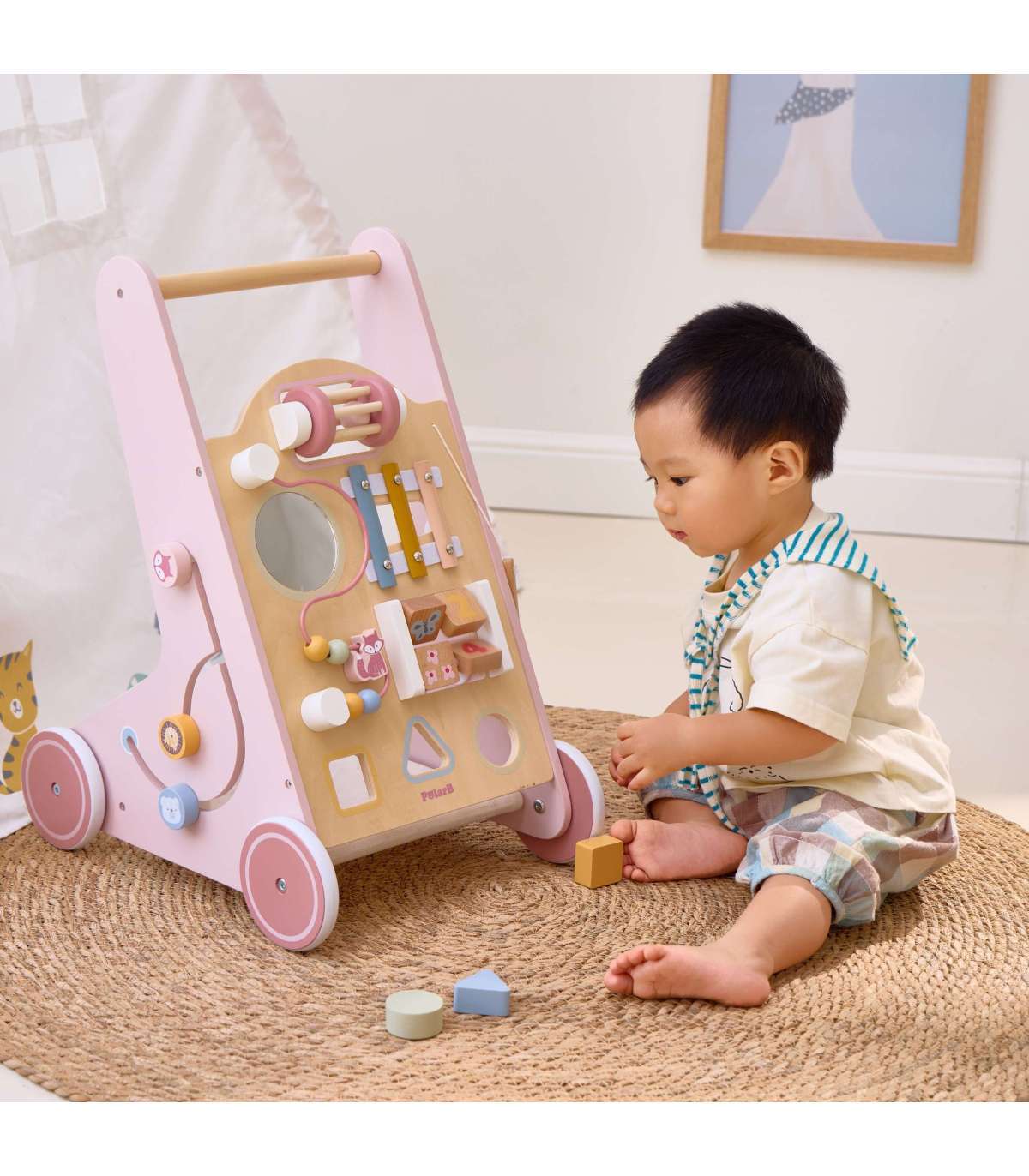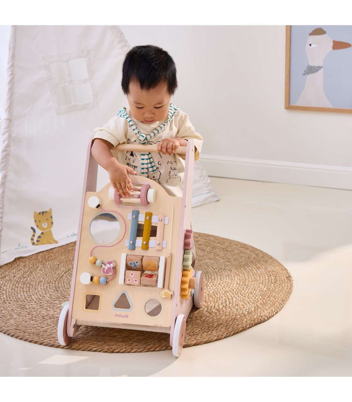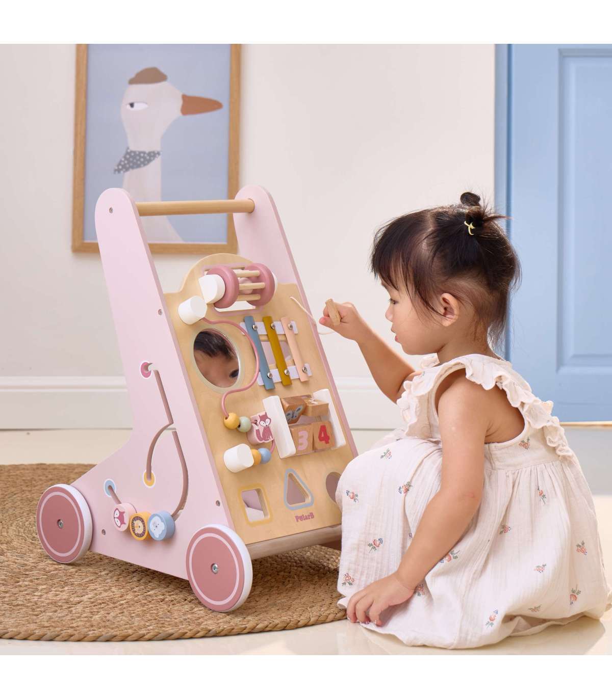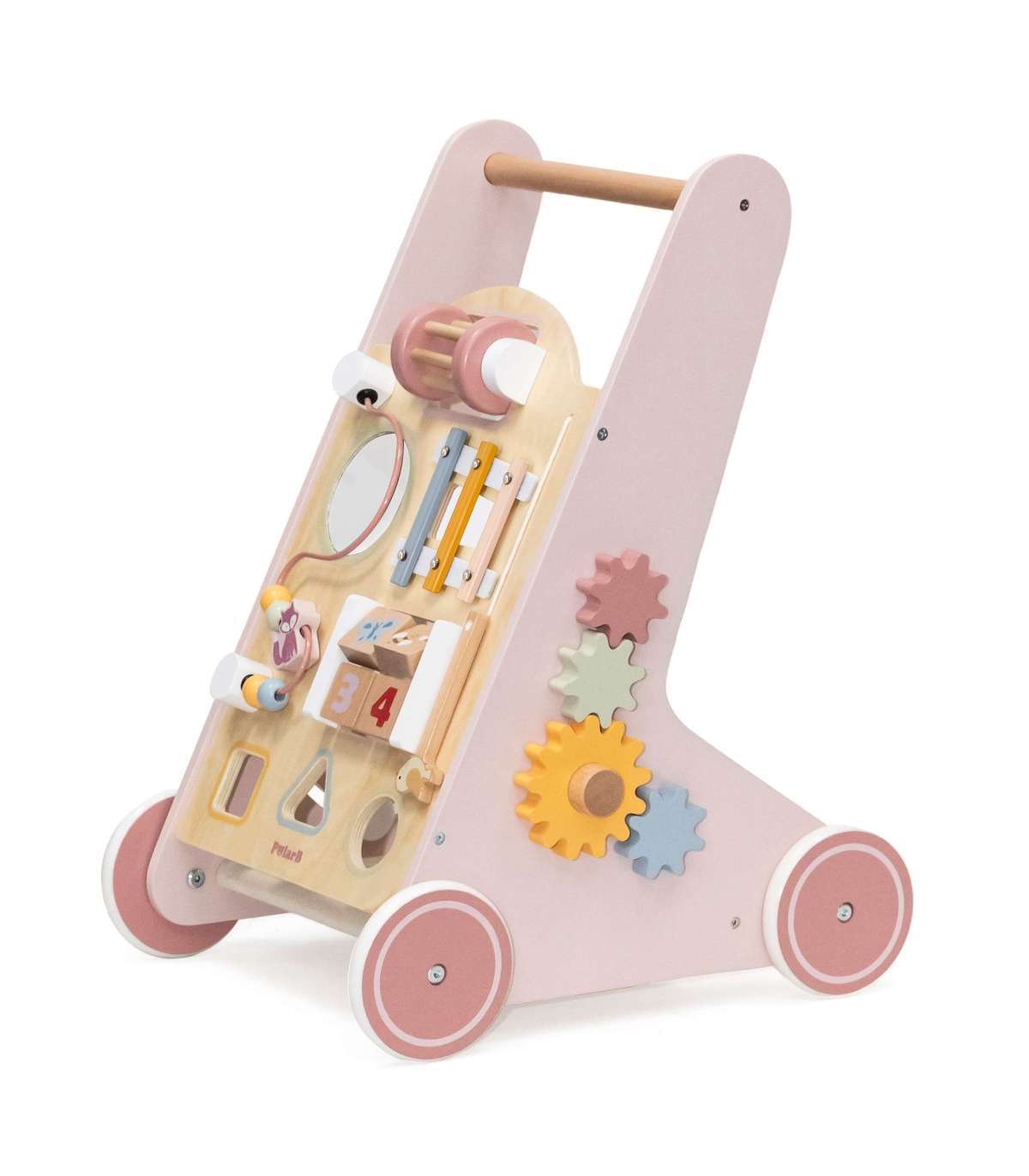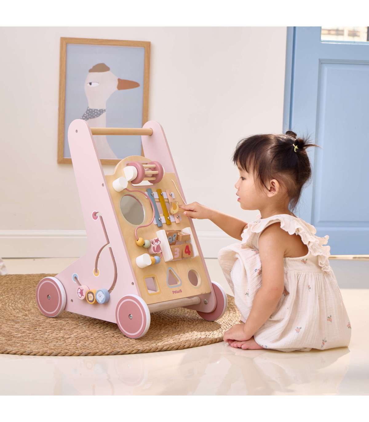 Różowy Chodzik dla Maluszków od marki PolarB to świetna zabawa i nauka w jednym! Oferuje interaktywne aktywności, takie jak podglądanie się w lusterku, obracanie klocków, turlanie grzechotki, dopasowywanie kształtów oraz granie na cymbałkach. Dzięki temu chodzik zachęca dzieci do stawiania pierwszych kroków, co jest kluczowym etapem w ich rozwoju. Dodatkowo, z tyłu znajduje się praktyczny schowek, idealny na ulubione zabawki.