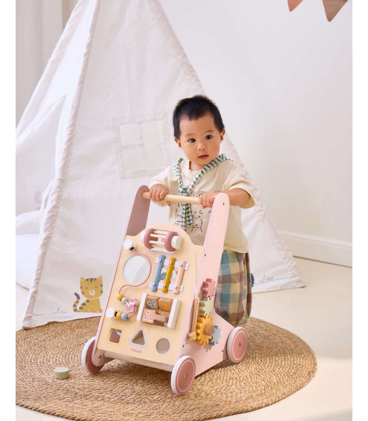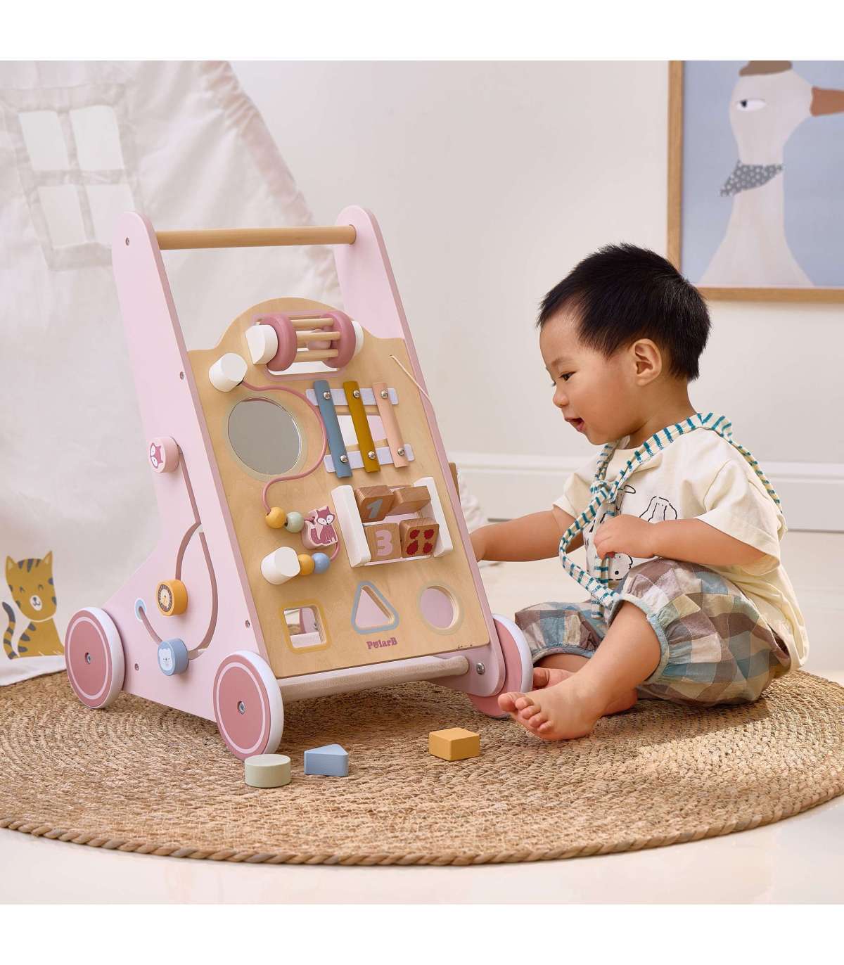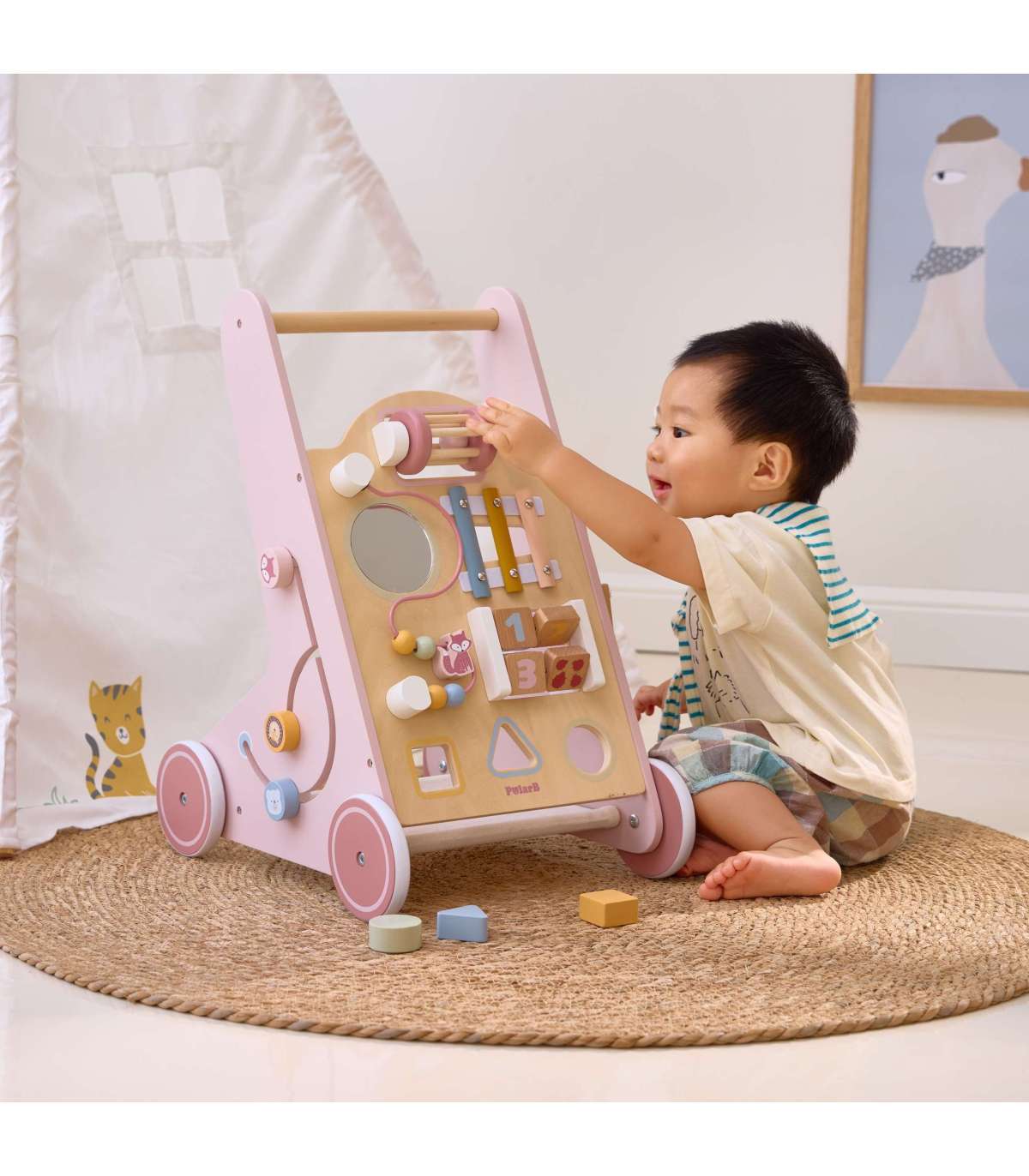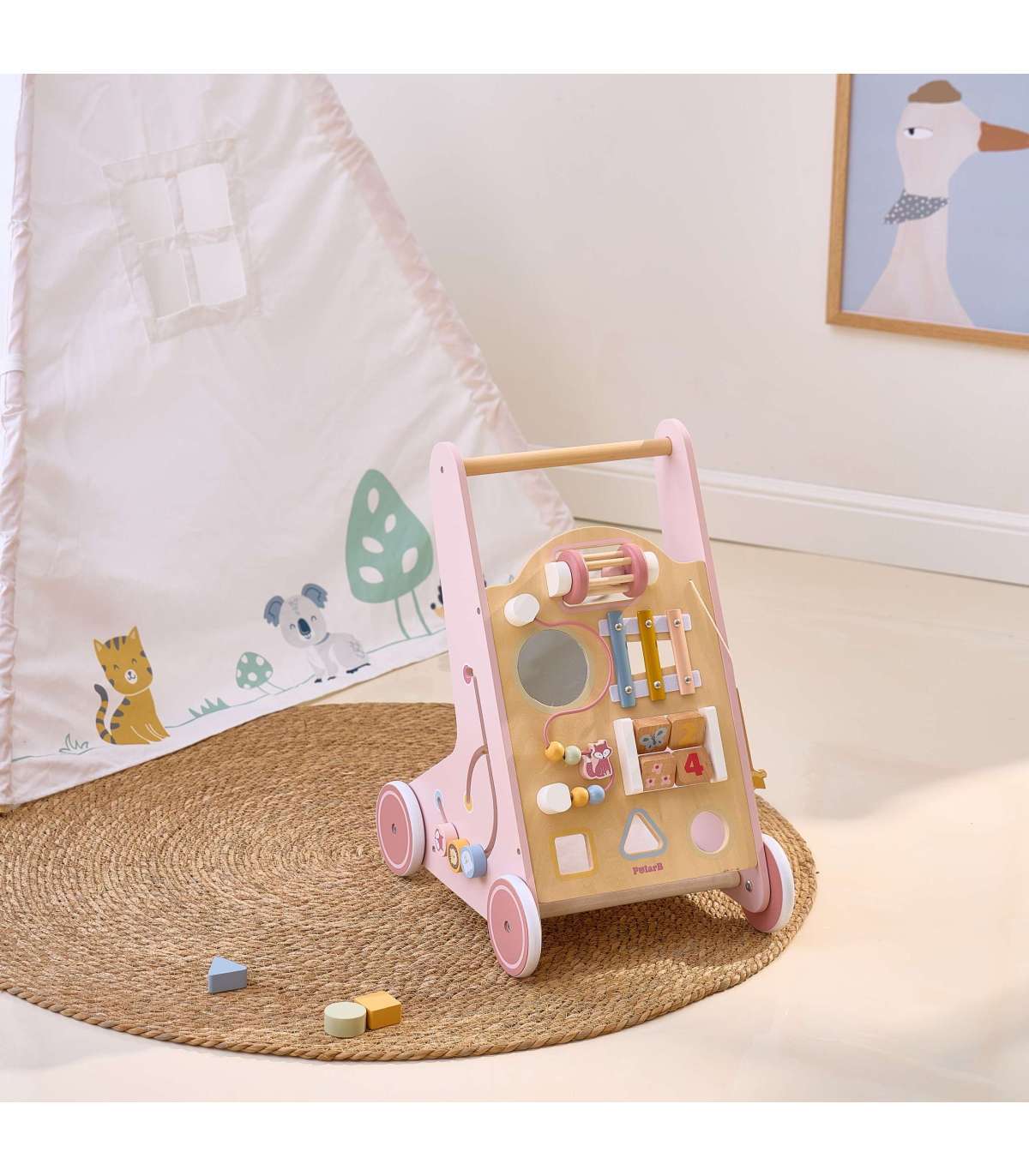 Różowy Chodzik dla Maluszków od marki PolarB to świetna zabawa i nauka w jednym! Oferuje interaktywne aktywności, takie jak podglądanie się w lusterku, obracanie klocków, turlanie grzechotki, dopasowywanie kształtów oraz granie na cymbałkach. Dzięki temu chodzik zachęca dzieci do stawiania pierwszych kroków, co jest kluczowym etapem w ich rozwoju. Dodatkowo, z tyłu znajduje się praktyczny schowek, idealny na ulubione zabawki.
