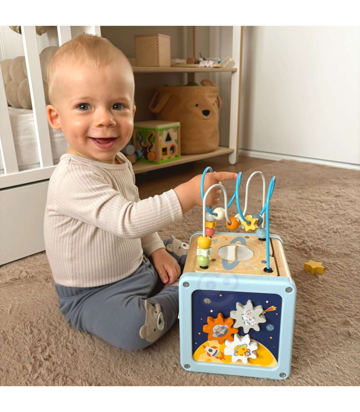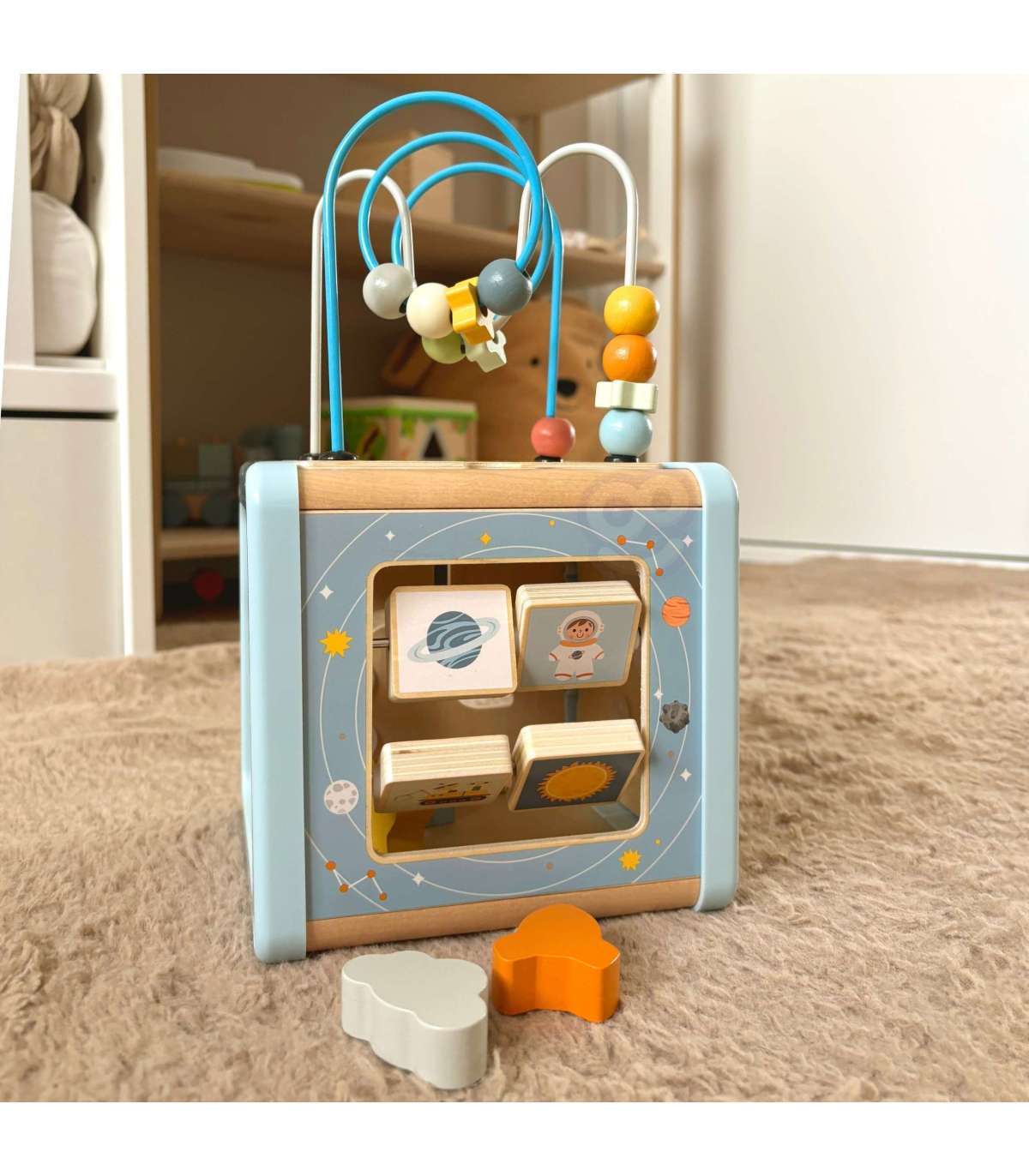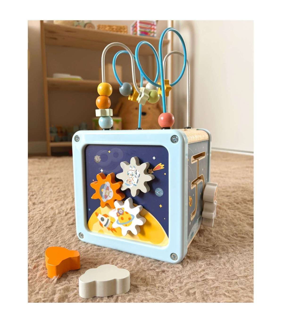 Puidust kosmose tegevuskuubik brändilt Tooky Toy on hariv, komplekt pehmetes pastelltoonides. Tegevuskuubik on mitmekülgne, pakkudes igal küljel erinevaid interaktiivseid paneele. Sellel on hammasrattad, kujundite sorteerimiseks mõeldud klotsid ja liugurid, mis mitte ainult ei ärata lapse uudishimu, vaid arendavad ka tema motoorseid oskusi. Helmeste labürint on suurepärane vahend silm-käe koordinatsiooni parandamiseks lastel. Labürindi osa saab kuubiku sisse peita, muutes hoiustamise lihtsamaks.