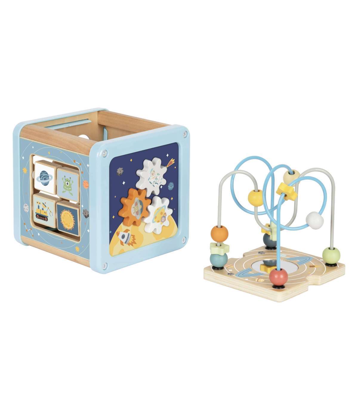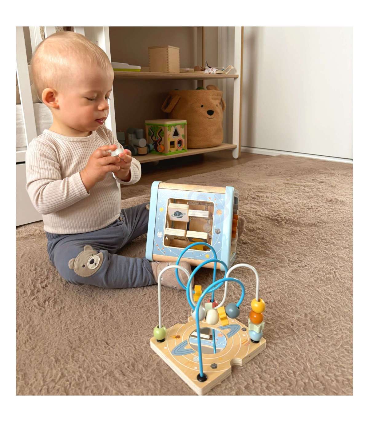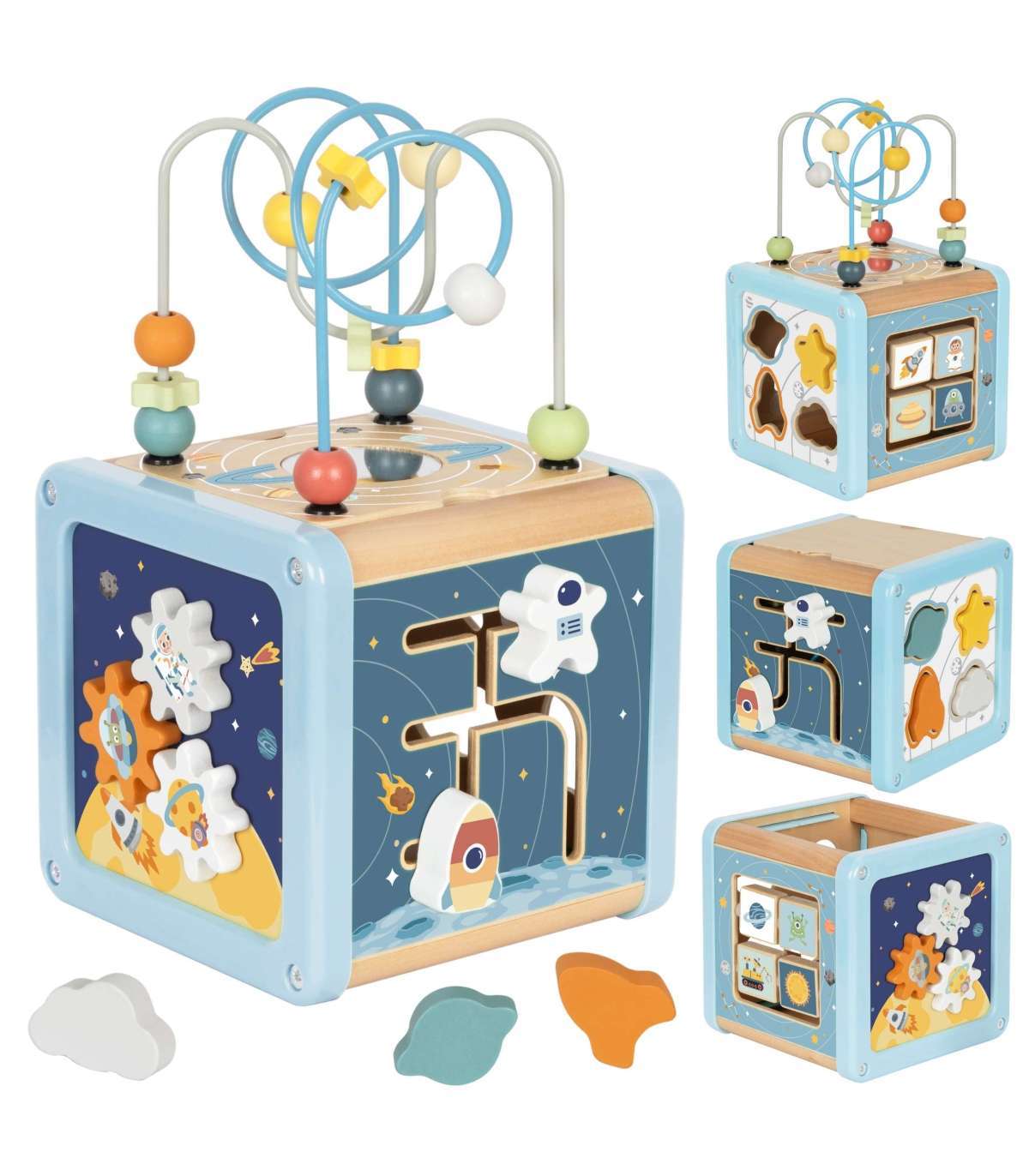 Puidust kosmose tegevuskuubik brändilt Tooky Toy on hariv, komplekt pehmetes pastelltoonides. Tegevuskuubik on mitmekülgne, pakkudes igal küljel erinevaid interaktiivseid paneele. Sellel on hammasrattad, kujundite sorteerimiseks mõeldud klotsid ja liugurid, mis mitte ainult ei ärata lapse uudishimu, vaid arendavad ka tema motoorseid oskusi. Helmeste labürint on suurepärane vahend silm-käe koordinatsiooni parandamiseks lastel. Labürindi osa saab kuubiku sisse peita, muutes hoiustamise lihtsamaks.