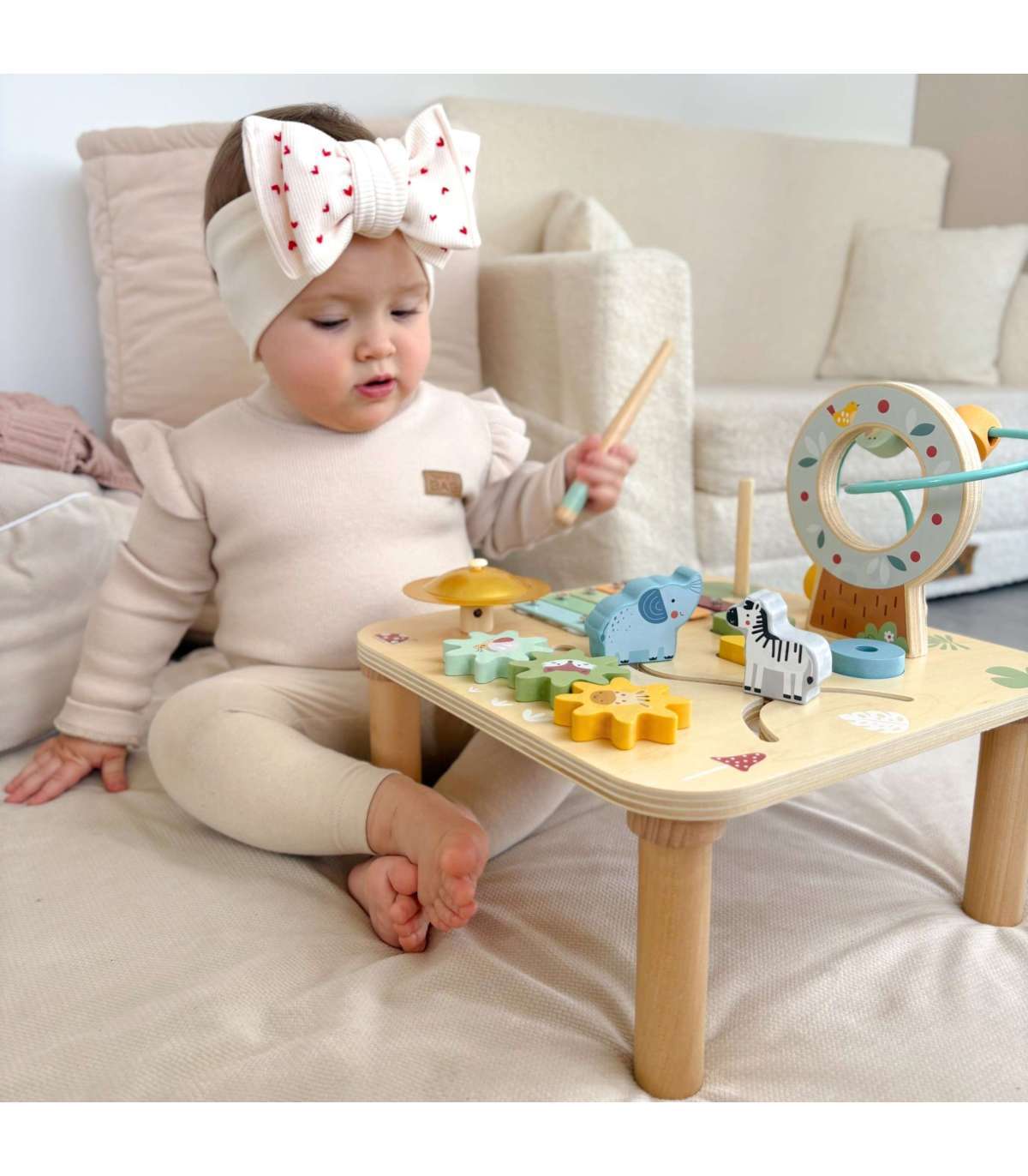 WOOPIE GREEN tegevuslaud on eriline mänguasi, mis ühendab hariduse ja meelelahutuse ning toetab lapse mitmekülgset arengut. Tänu Montessori elementide kasutamisele saavad väikesed lapsed arendada oma motoorseid oskusi, loogilist mõtlemist ja silma‑käe koordinatsiooni, mängides viisil, mis sobib nende vanusele. Ilus pastelsinine toon ja naturaalne puit muudavad laua mitte ainult visuaalselt atraktiivseks, vaid ka ohutuks ja lapsele sõbralikuks.