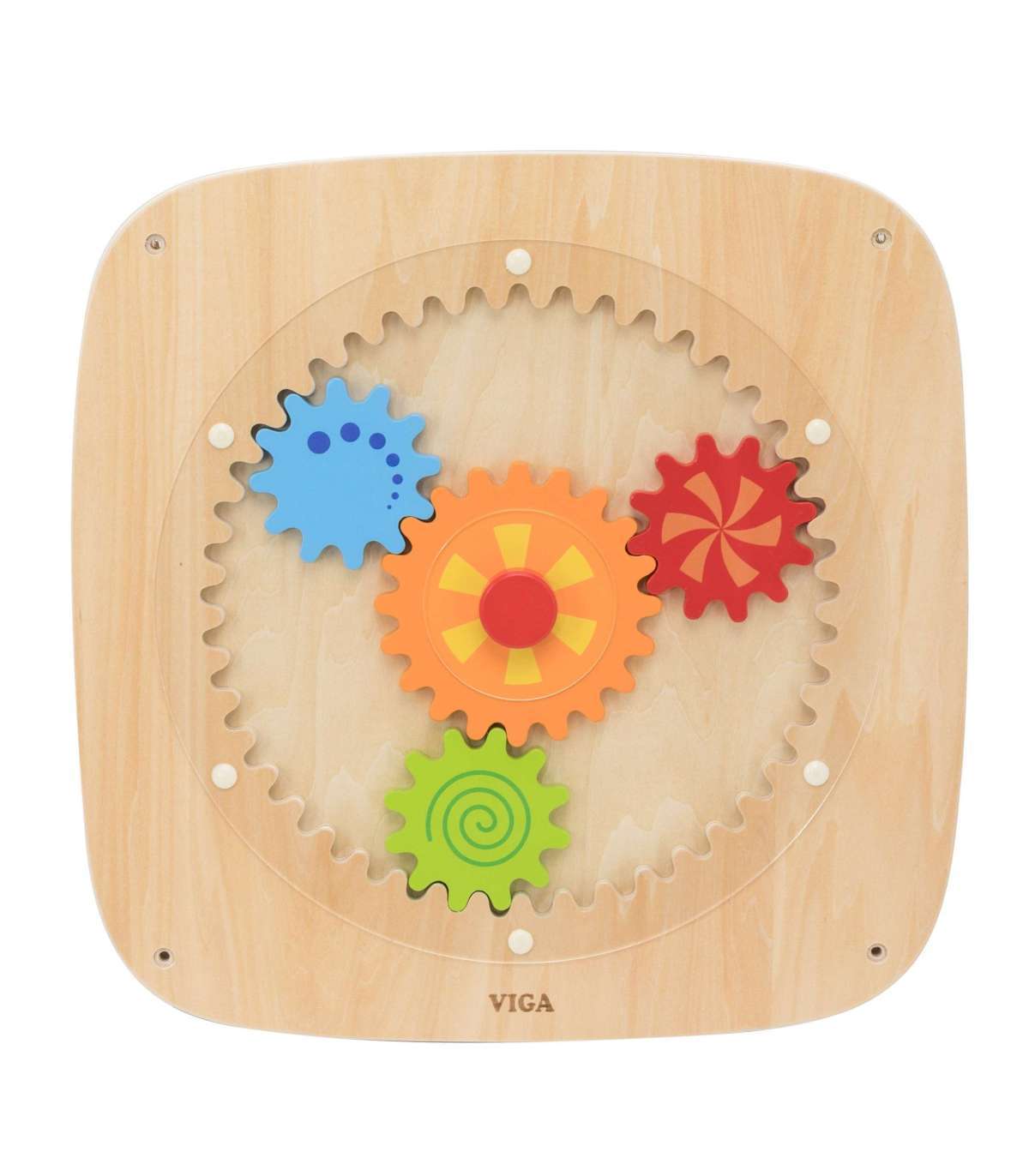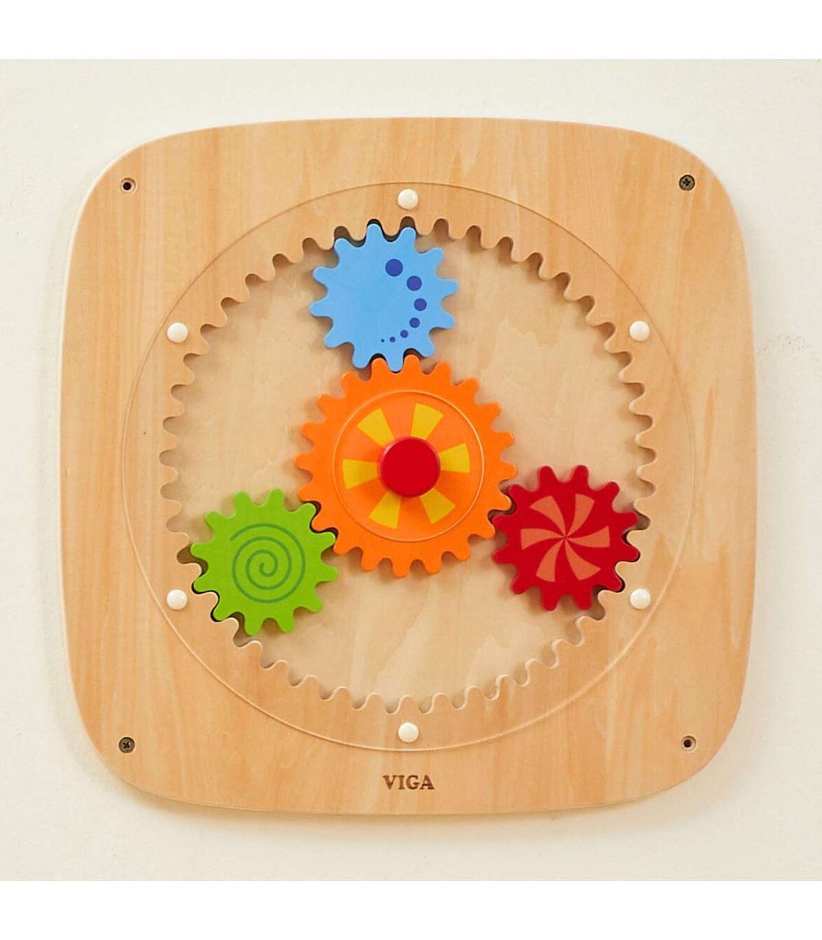 - Puidust seinale kinnitatav tahvel värviliste hammasratastega.