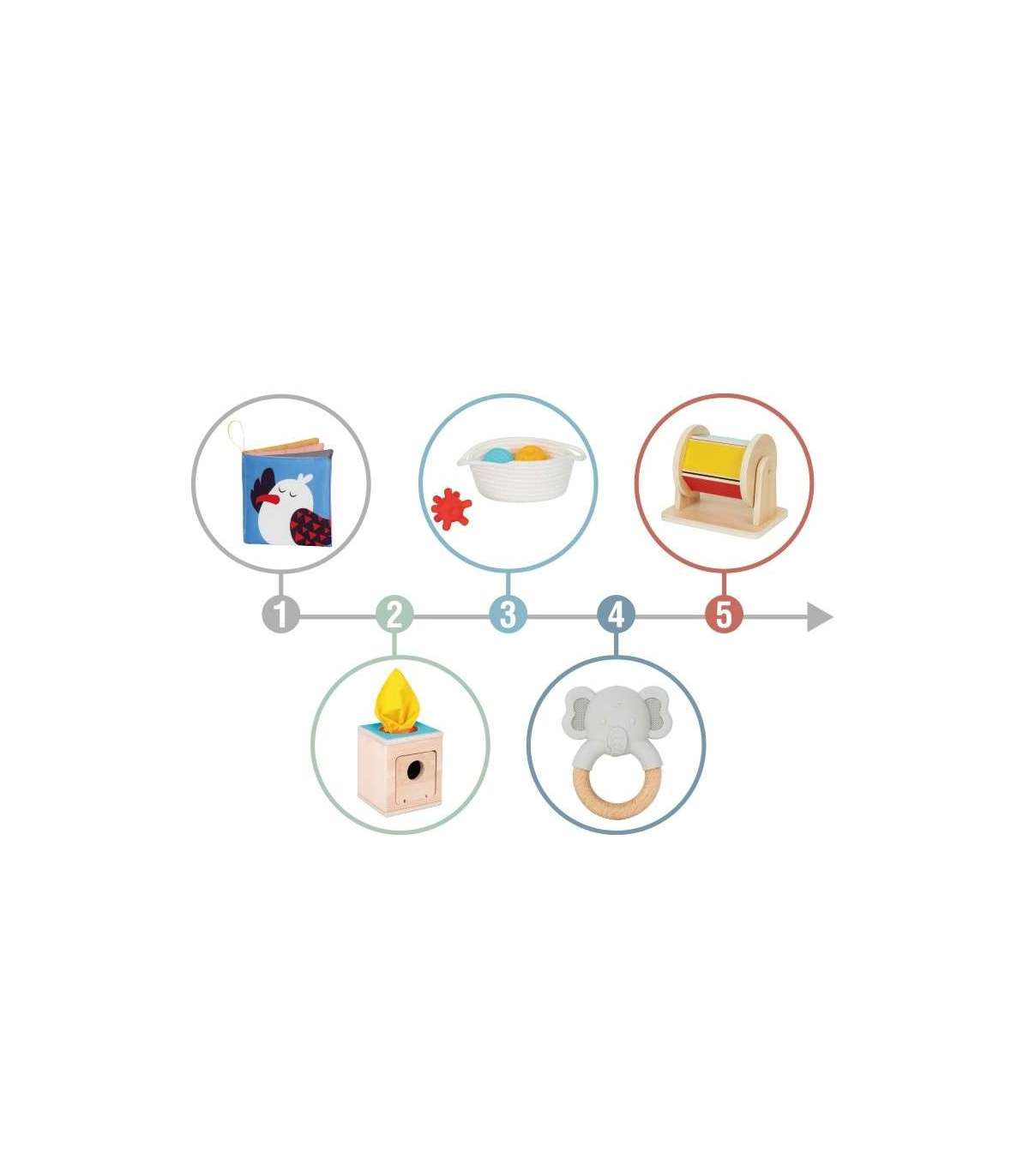 Pudełko edukacyjne firmy Woopie to kompleksowy zestaw stworzony z myślą o zdrowym rozwoju psychomotorycznym Twojego maluszka. Jest to idealny box dla niemowląt w wieku od 5-6 miesięcy, zawierający 5 zabawek sensorycznych i dydaktycznych inspirowanych metodą Montessori. Zabawki stymulują kluczowe zmysły: wzrok, dotyk i słuch, a także wspierają koordynację ręka-oko i logiczne myślenie. Do zestawu dołączony jest szczegółowy poradnik dla rodziców, który podpowiada, kiedy i jak wprowadzać każdą zabawkę, czyniąc ten box doskonałym prezentem dla niemowlaka.
