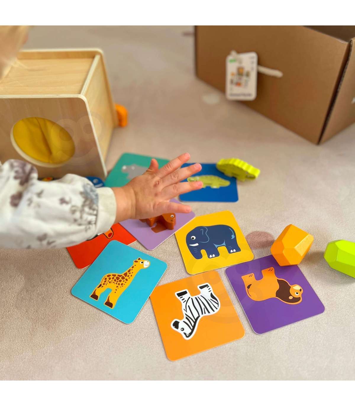 - - Karty edukacyjne ze zwierzętami: Służą do zabawy w dopasowywanie figurki do ilustracji lub jej cienia.