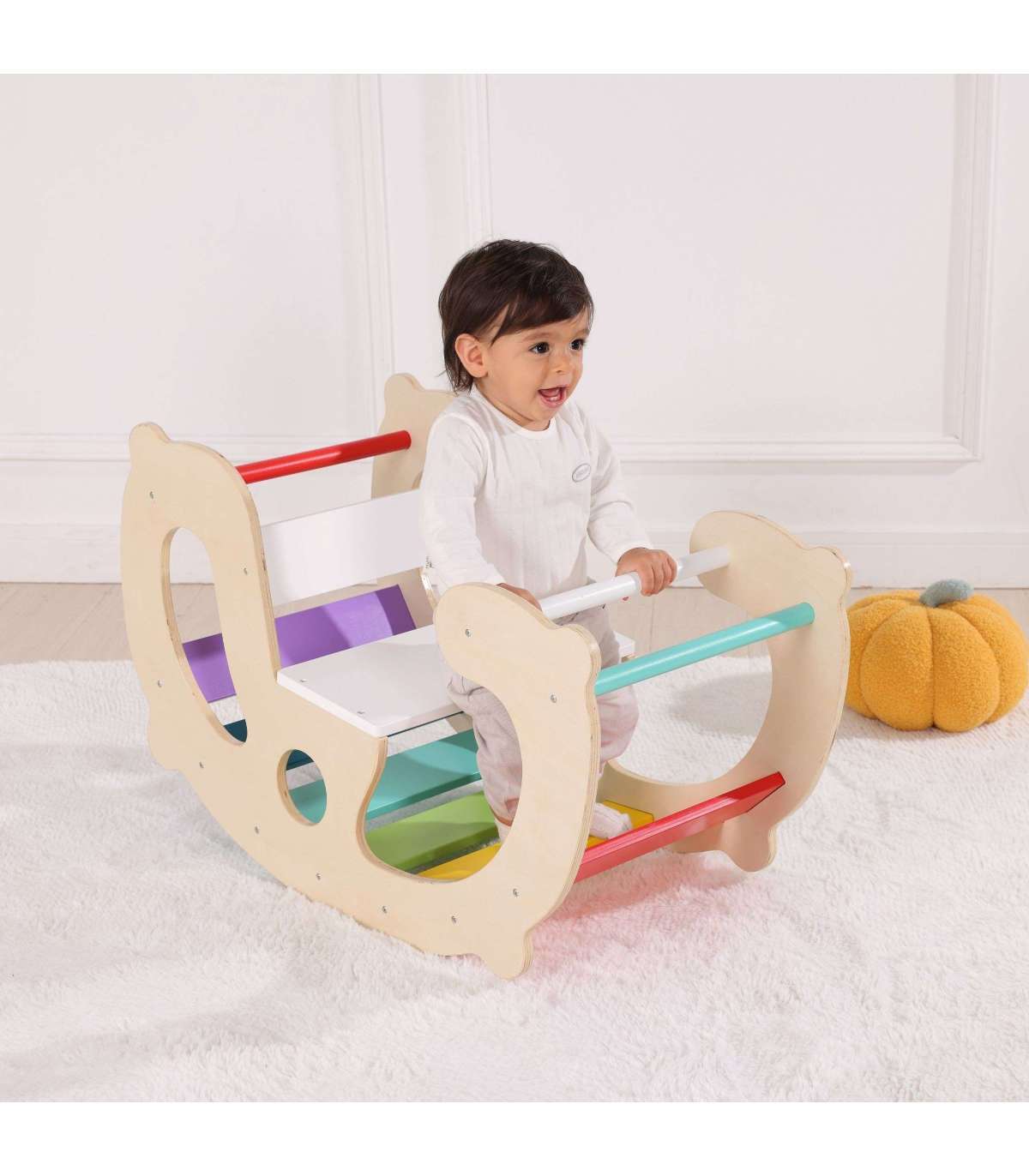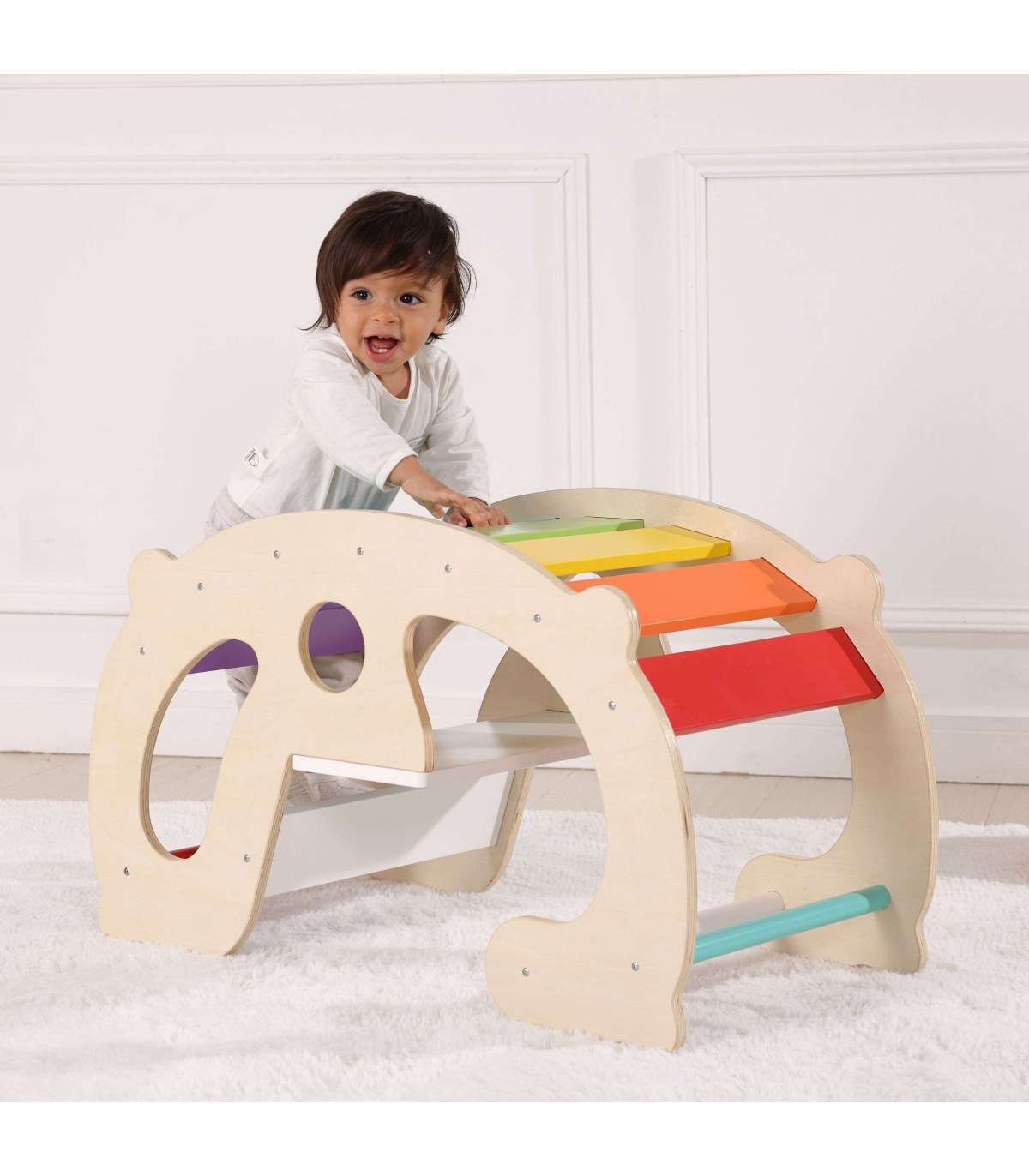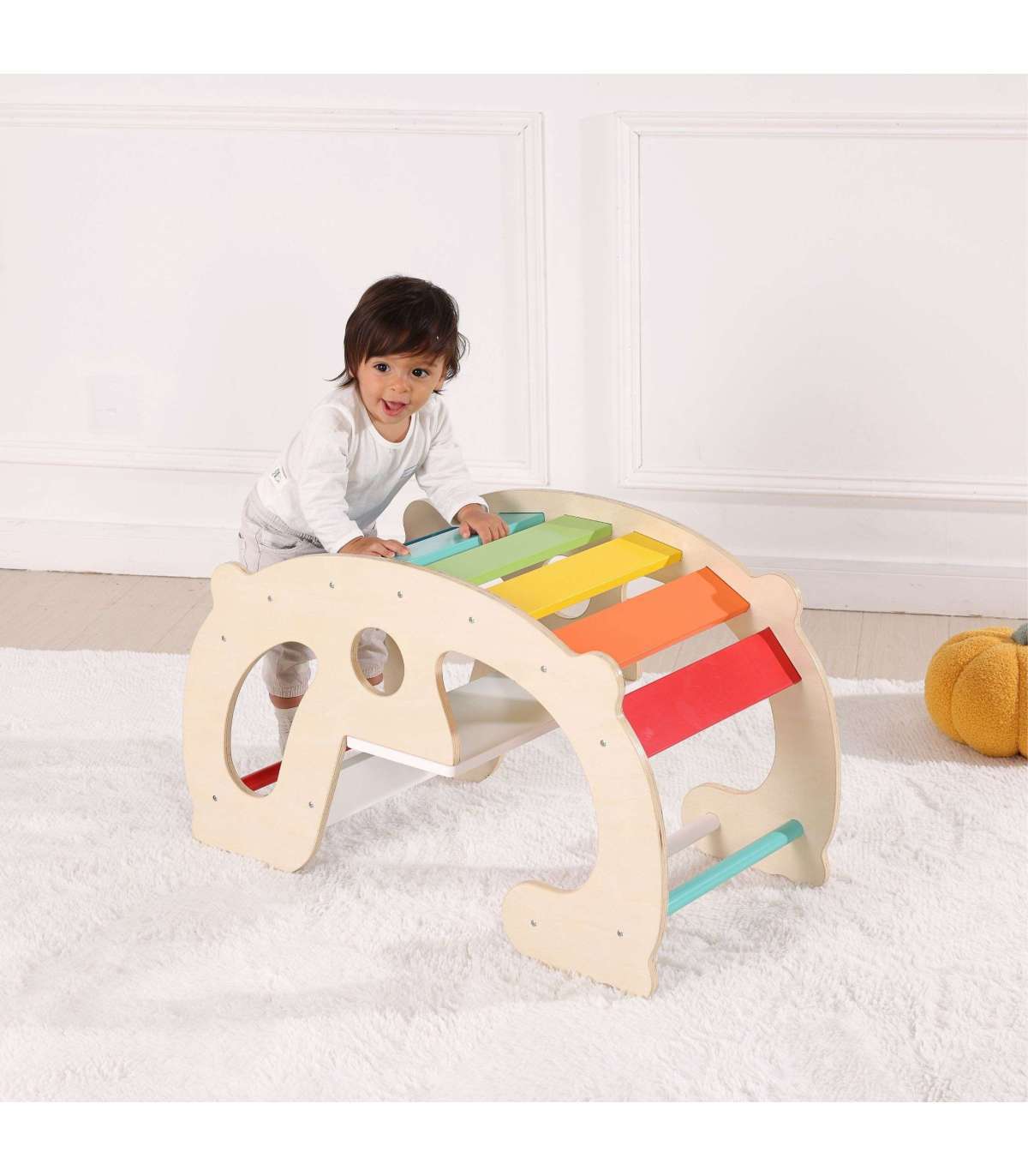 See multifunktsionaalne puidust kiik Woopie Green on üks populaarsemaid Montessori meetodist inspireeritud õppevahendeid! Tänu lihtsale kaarele ehitusele ja värvikirevatele vikerkaareplaatidele muutub see lapse motoorika ja kujutlusvõime arendamiseks maagiliseks vahendiks. See võib toimida kiigena, tasakaalusalusena ja tunnelina, mida saab läbida, ning isegi istme või mängulauana. Looduslik puit koos erksate värvidega loob turvalise ruumi, kus väikesed lapsed saavad katsetada liikumist, õppida tundma oma keha piire ja kasvatada enesekindlust.
