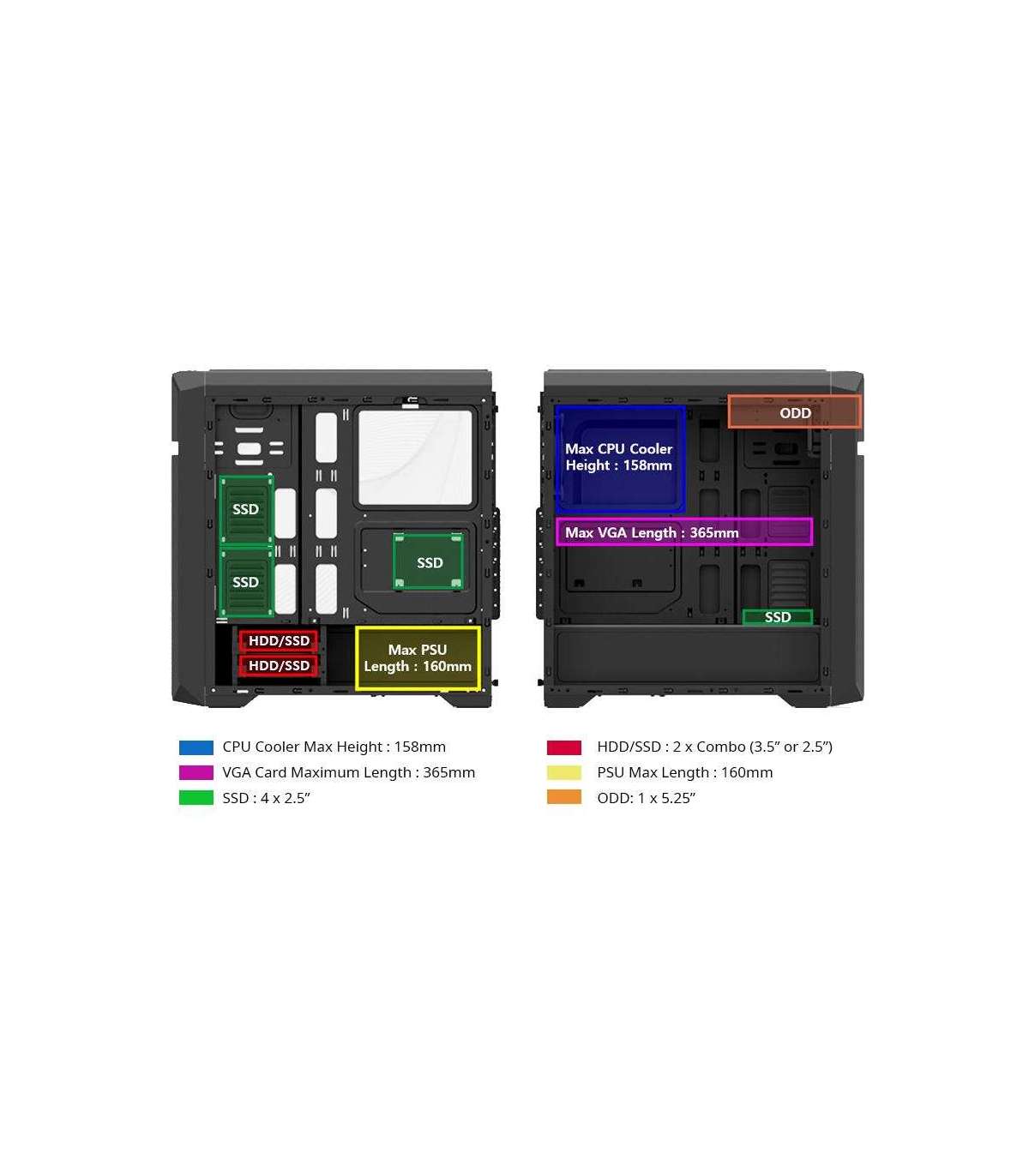 Draivipesad 2 x kombineeritud (3,5 ”või 2,5”) / 4 x 2,5 ”SSD / 1 x 5,25 ODD