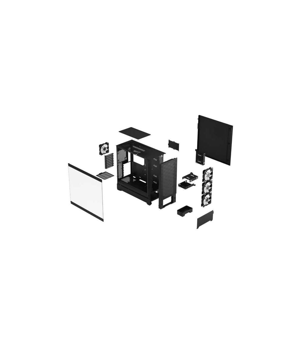 - Top (perforated plastic), PSU (nylon), Front (perforated steel)