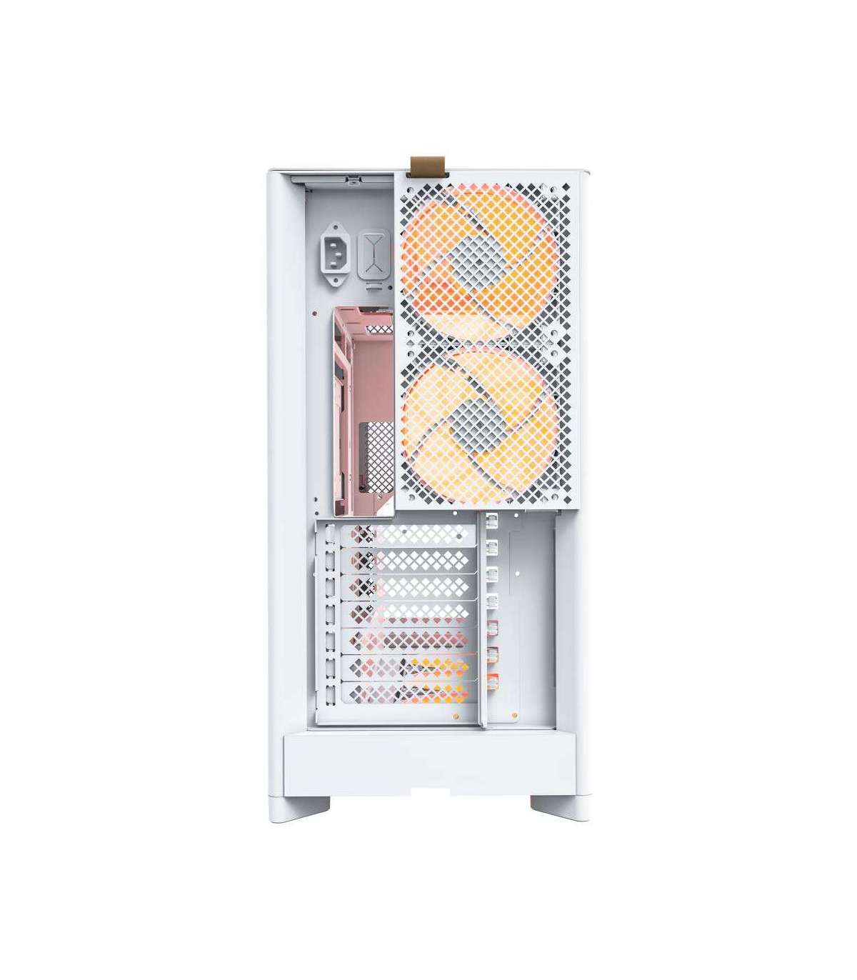 Корпус реализует вертикальную вентиляцию по принципу дымохода: воздух поступает снизу и выводится через верх. Два задних вентилятора расположены в оптимизированном положении, что улучшает отвод тепла. Благодаря внешнему монтажу радиатора и смещению вентиляторов наружу, внутреннее пространство освобождается для еще большего количества охлаждающих решений.