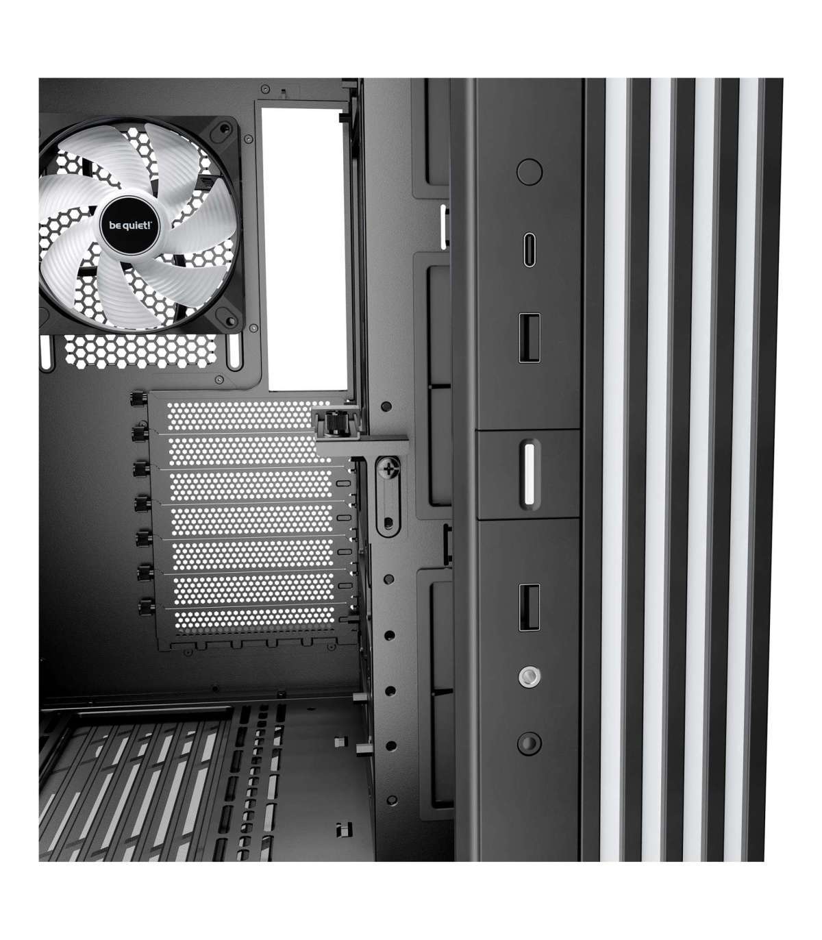 Light Base 600 DX Black features a flexible VGA holder that subtly prevents your GPU from sagging. The best part: This holder works in any orientation and with a horizontally or vertically installed graphics card. The result is a clean look even if you use big and heavy graphics cards.