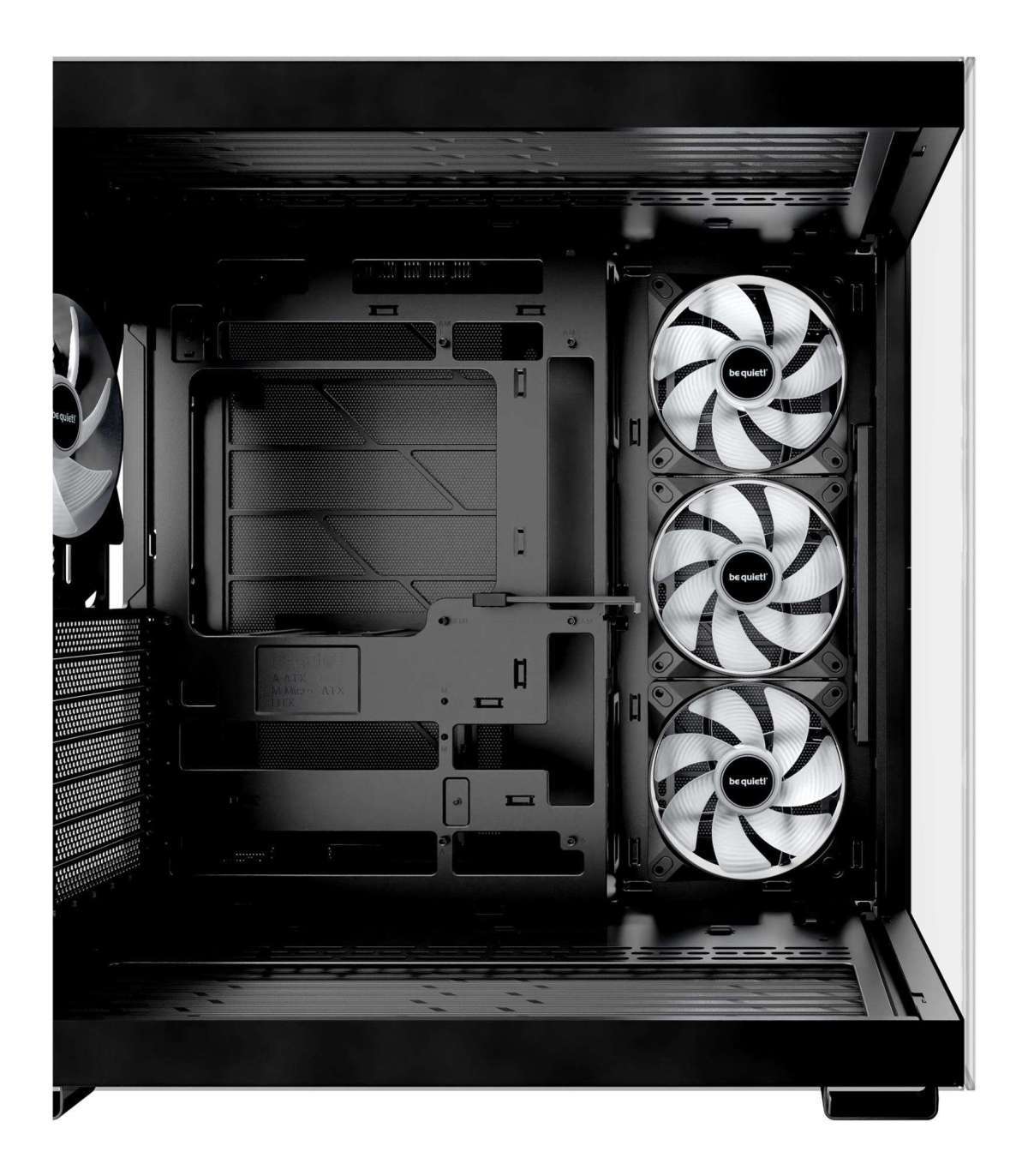 Light Base 600 DX Black features no preinstalled fans. However, up to 10 fans can be installed in total, making Light Base 600 DX Black extremely versatile. With its spacious design, it can hold up two 360mm radiators simultaneously, an ATX motherboard and even the most powerful graphics cards. Thanks to the dual chamber design, drives and cables are neatly tucked in the back and do not get in the way of airflow.