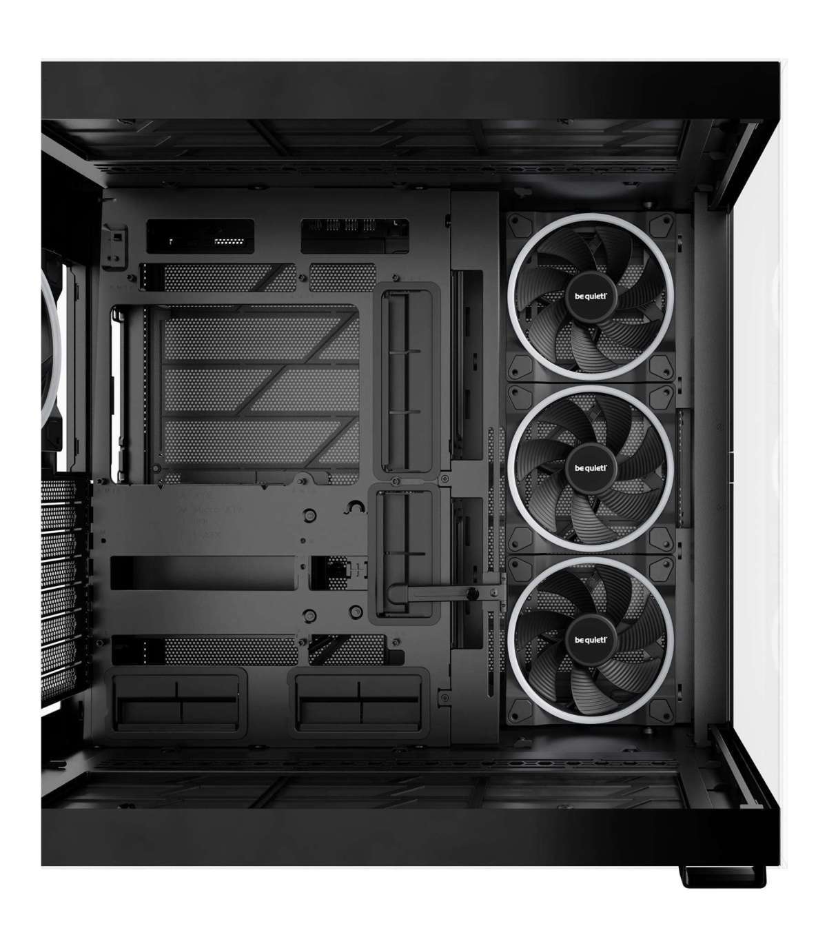 Light Base 900 FX Black comes with 4 pre-installed Light Wings fans. One fan is installed as rear exhaust, 3 Light Wings 140mm PWM fans with reversed fan blades are pre-installed on the side mounting. The reverse fans make sure your system is still an eye-catcher when installed as a side intake. Their 7 airflow-optimized fan blades not only reduce noise-generating turbulences but also ensure that this fan provides the performance that is needed, even in demanding configurations.