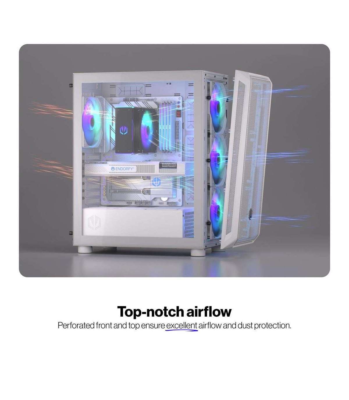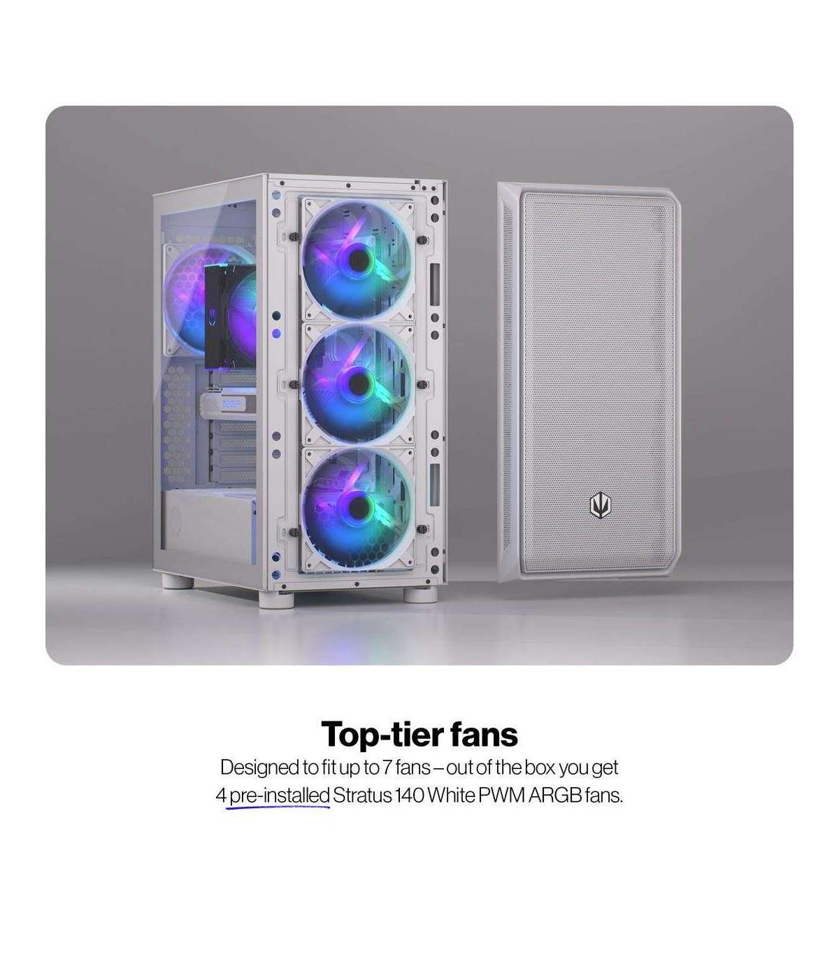 Arx 500 White ARGB is a sleek, airy white case compatible with ATX and smaller motherboards. Designed to house top-tier components, it supports radiators up to 360 mm and up to seven fans — including four pre-installed, whisper-quiet Stratus 140 White PWM ARGB units that deliver both high-performance cooling and vibrant backlighting. Perforated panels ensure optimal airflow while also protecting against dust buildup.
