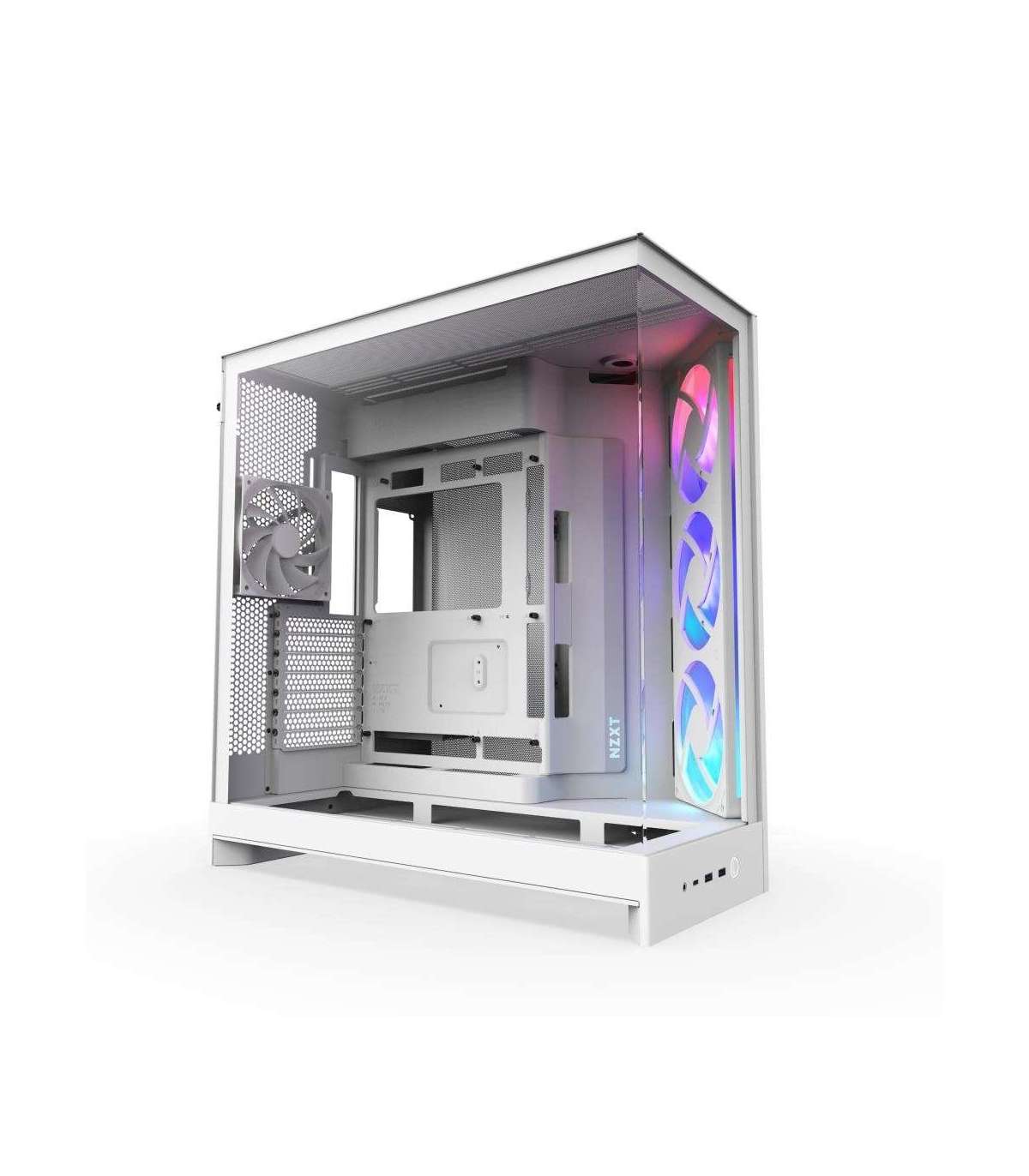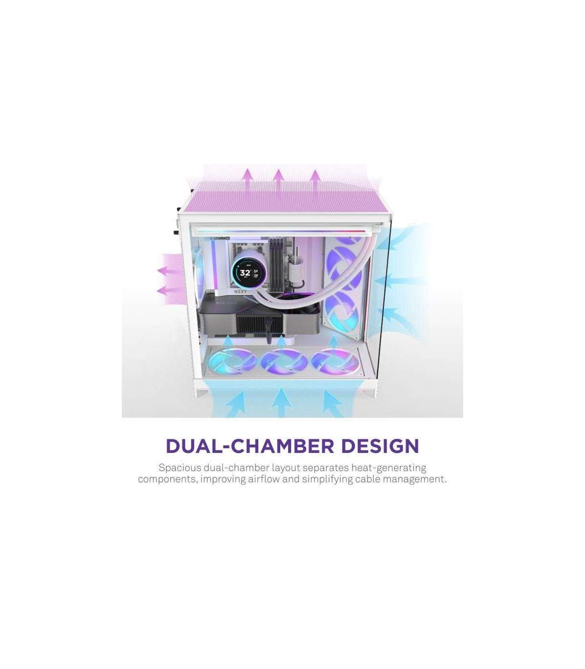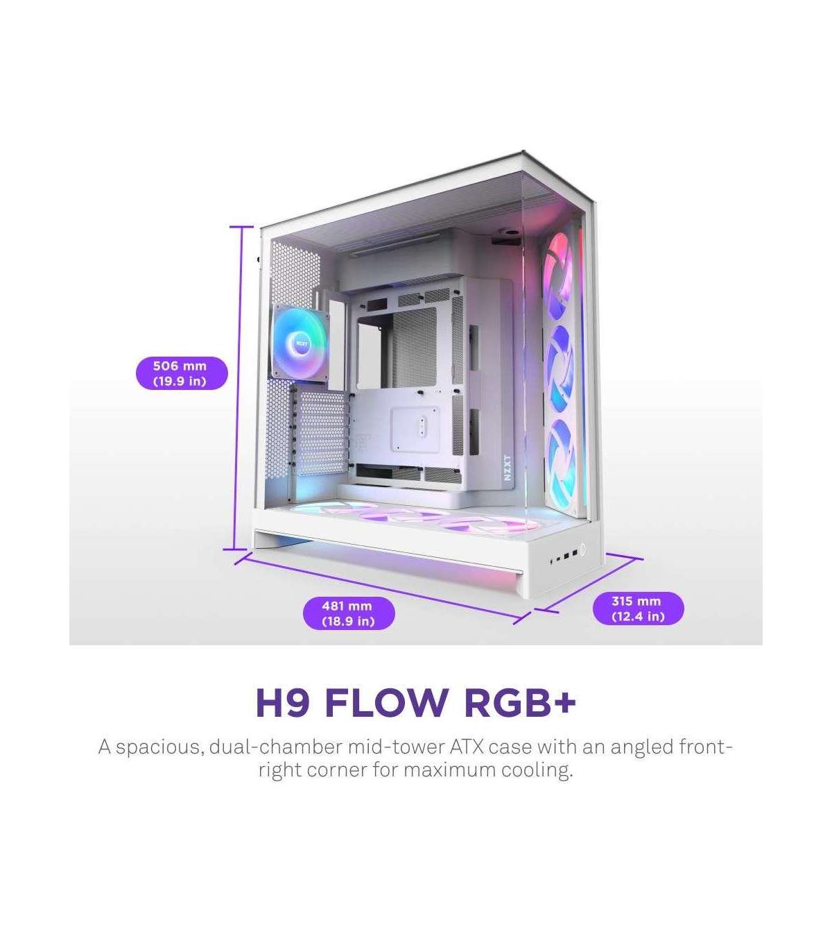 The H9 Flow is a spacious, dual-chamber case built for high-performance builds, featuring extensive cooling support and wraparound glass panels for an uninterrupted view of your build.