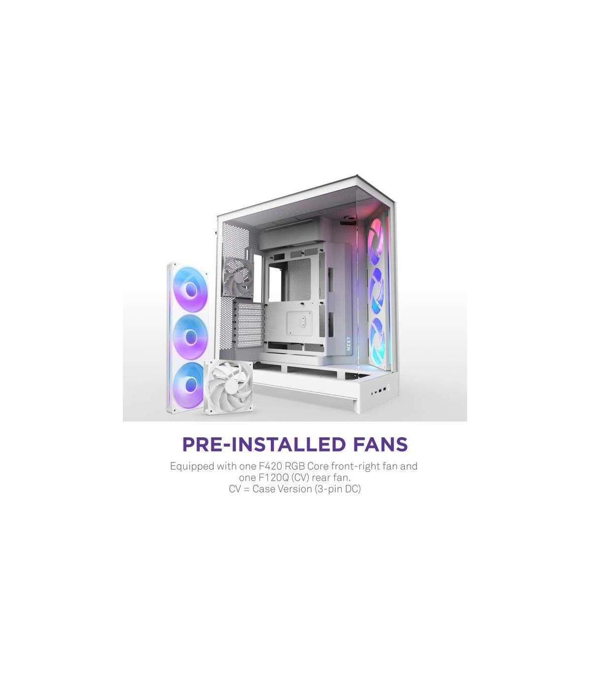- Pre-Installed Fans: Includes one F420 RGB Core single-frame fan unit in the front-right and one F120Q (CV) fan in the rear. CV = Case Version (3-pin DC)