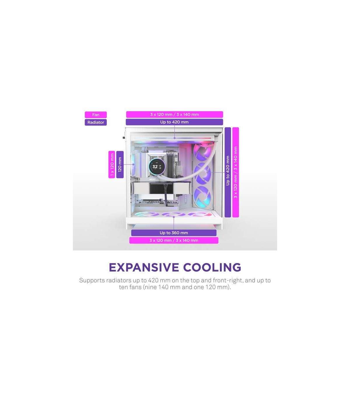 Holds up to 420 mm radiators on the top and front-right panels for versatile cooling.