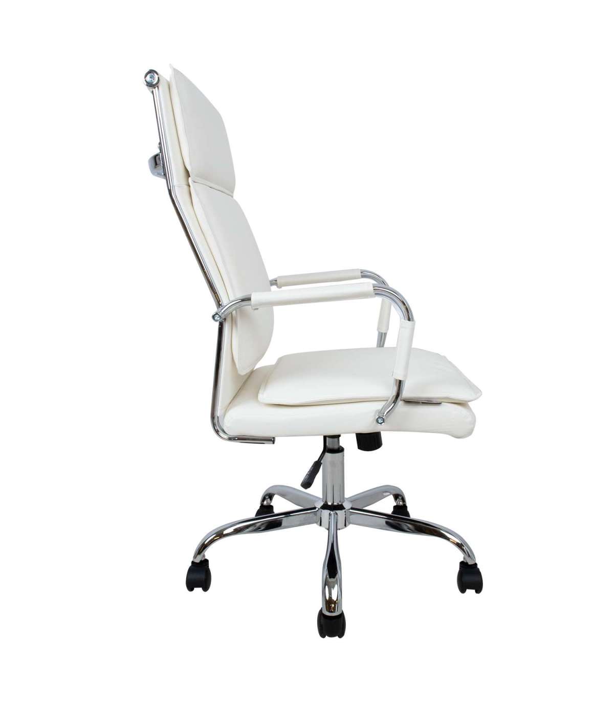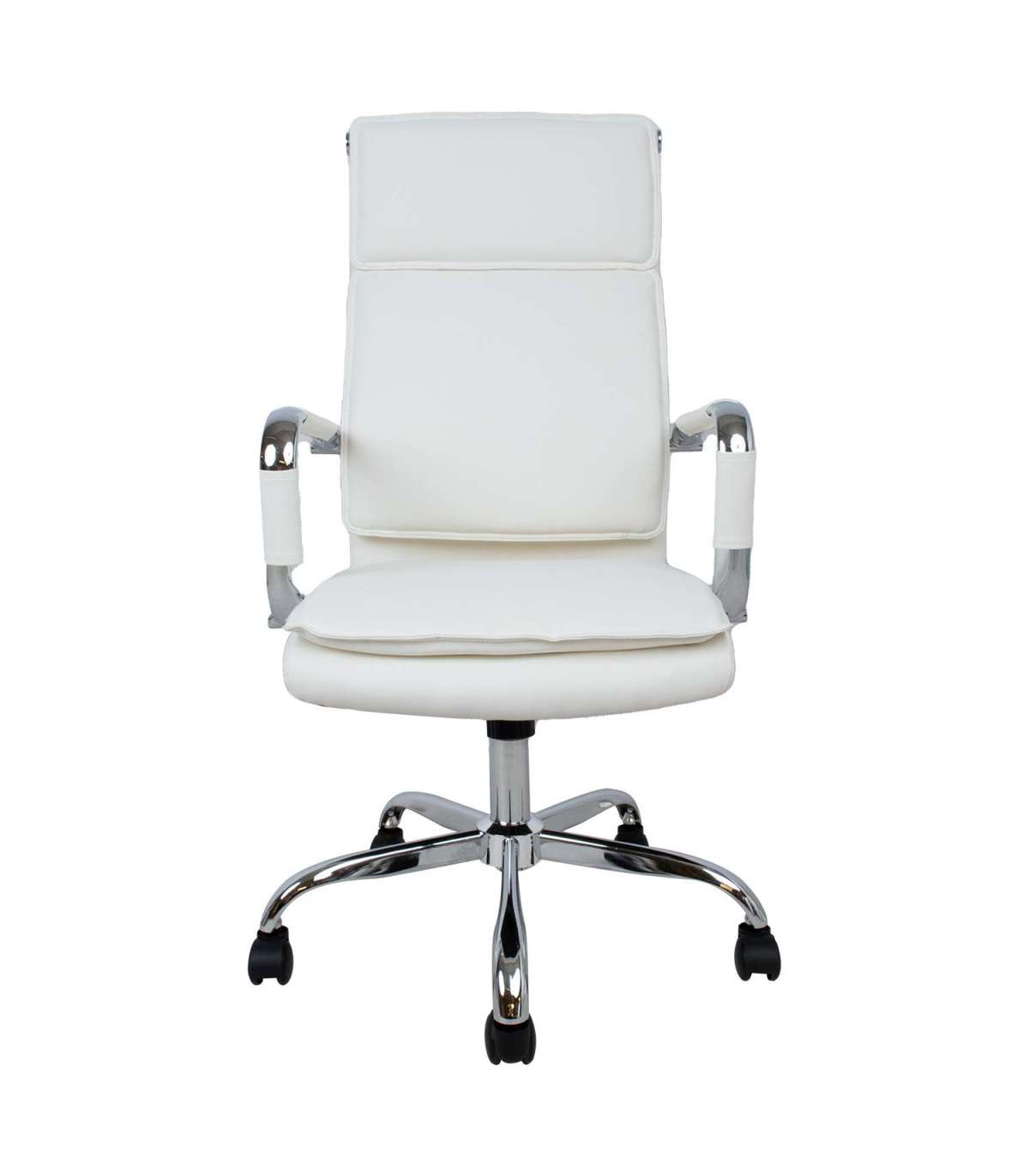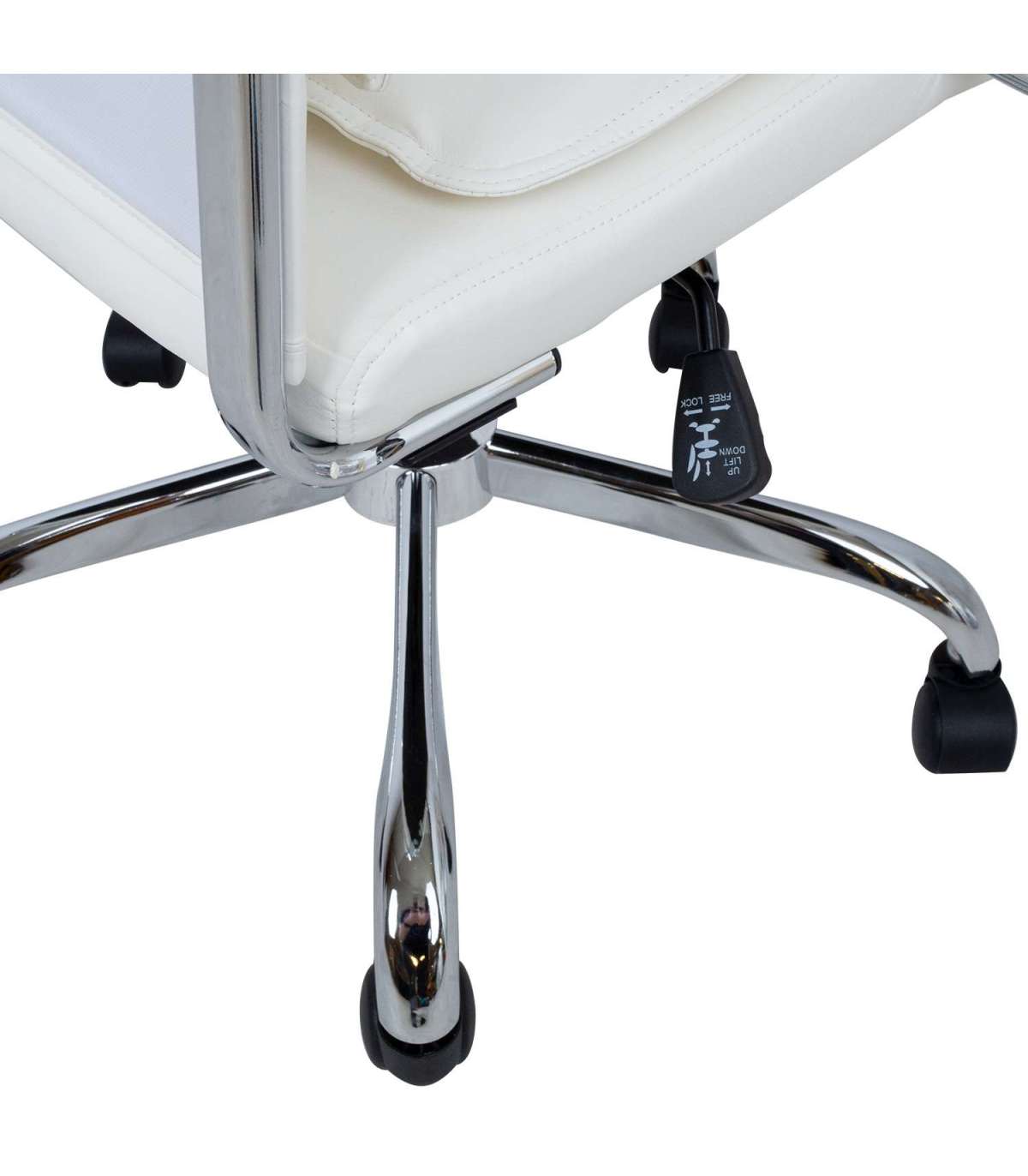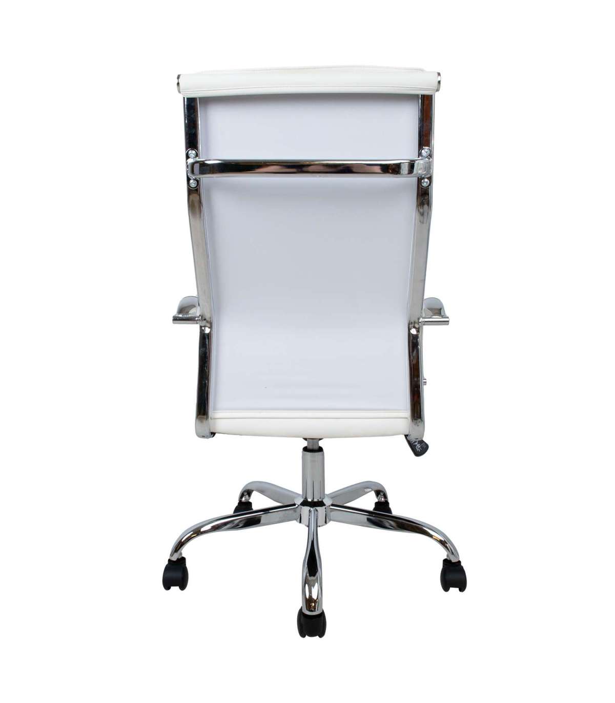 Tooli iste ja seljatugi on kaetud valge kunstnahaga.