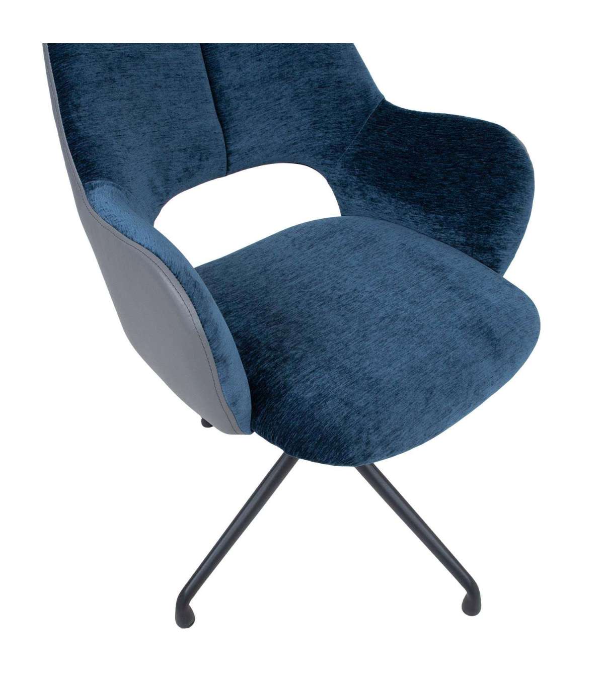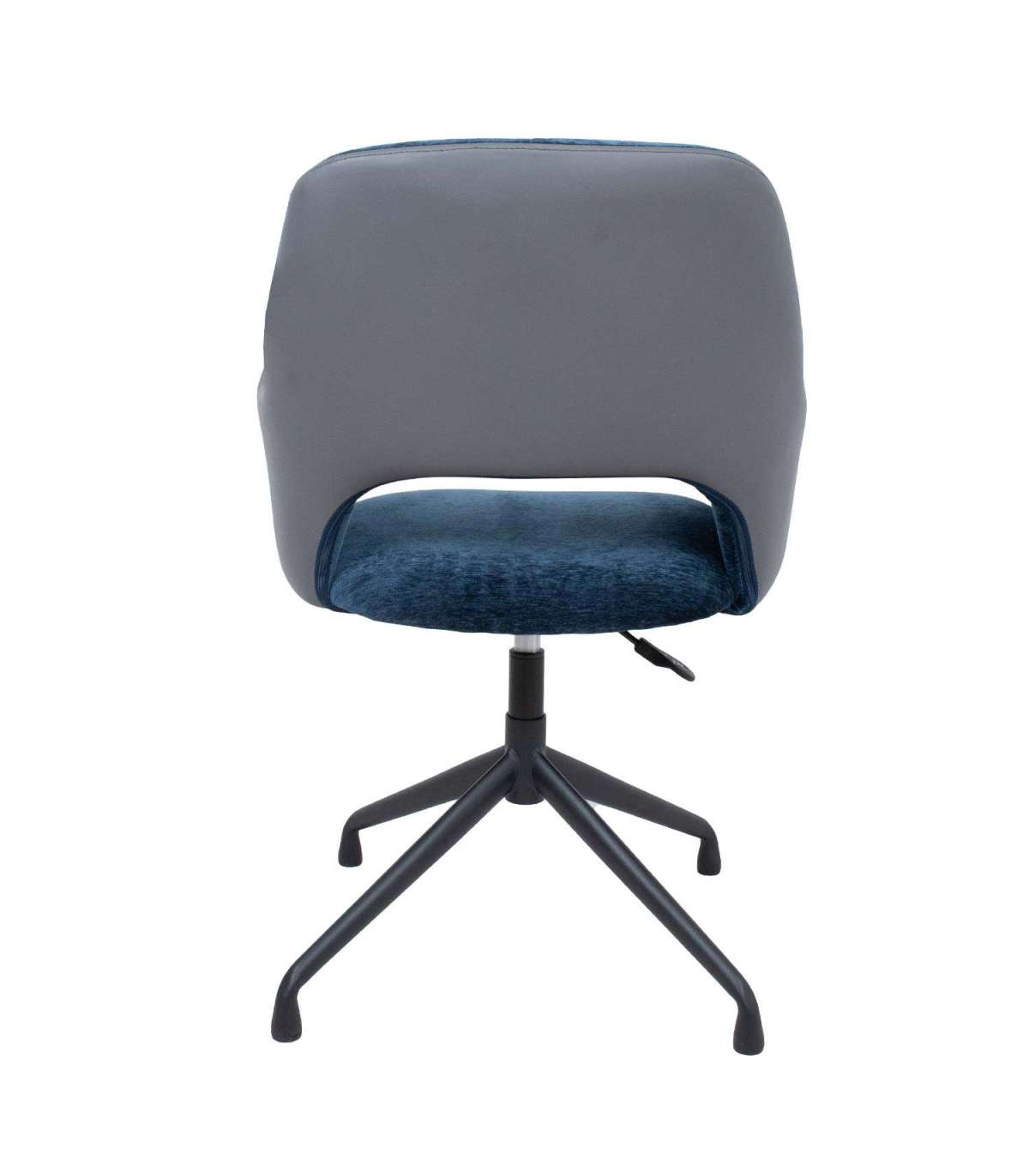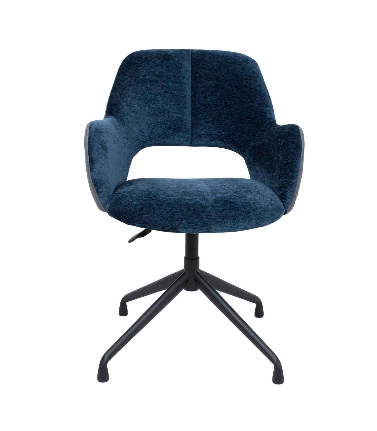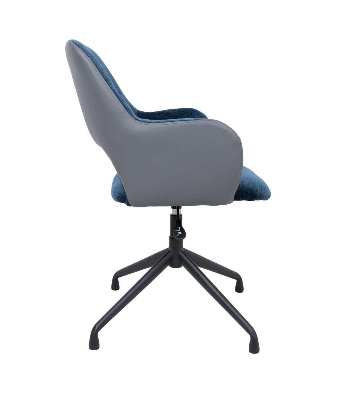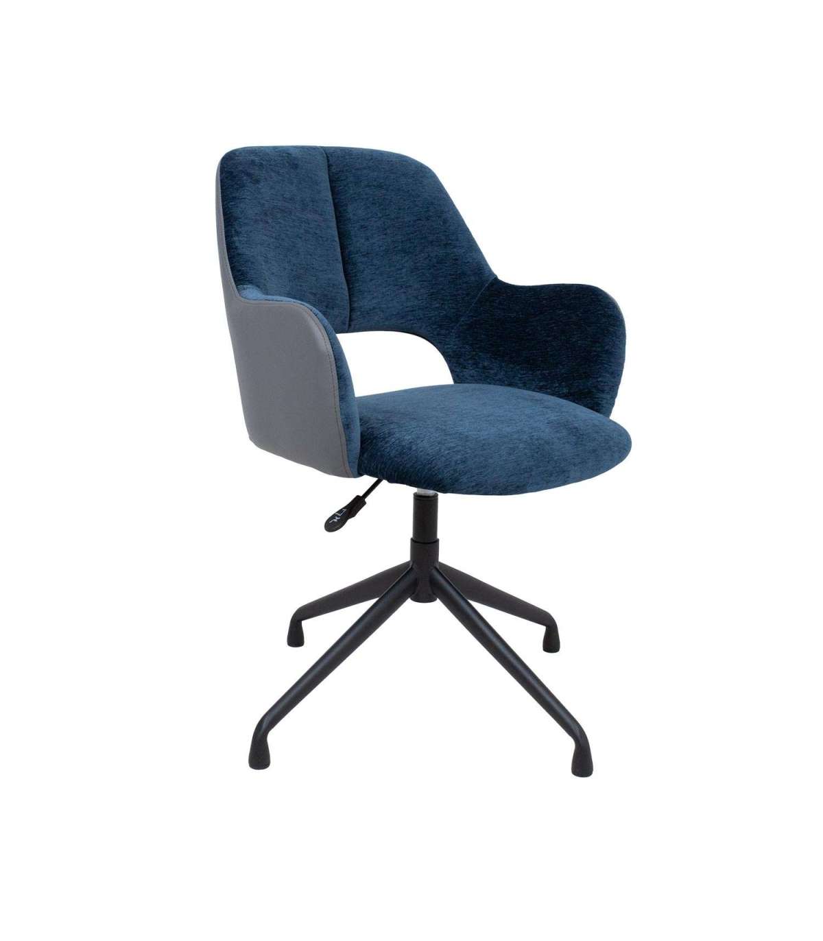 Töötool KENO ilma ratasteta 57x62xH82-88cm, sinine/hall. Tooli iste ja seljatugi on kergelt polsterdatud ja kaetud sinise sametise polüesterkangaga. Seljatoe väliskülg on kaetud halli kunstnahaga. Tooli istme kõrgus on reguleeritav gaasamordi abil. Tooli neljaharuline metallist jalg on viimistletud musta pulbervärviga.