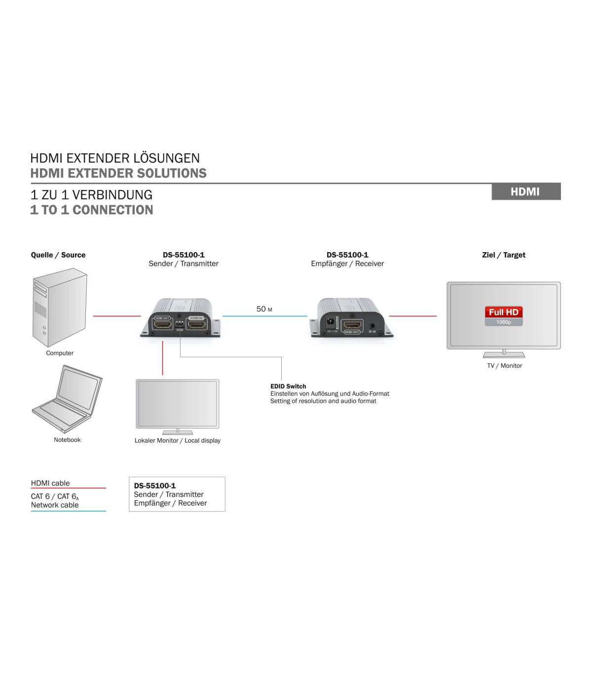 - Extends the maximum length for HDMI cable to up to 50 m via a simple network cable; Highest supported video resolution: 1080p / 60 Hz; Supports CAT 6, CAT 6A, CAT 7 network cables