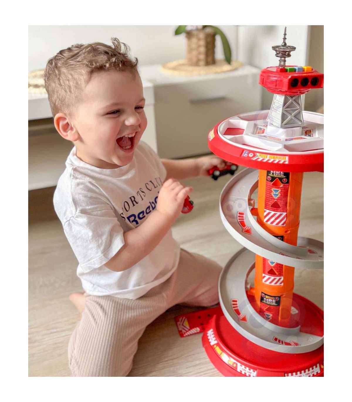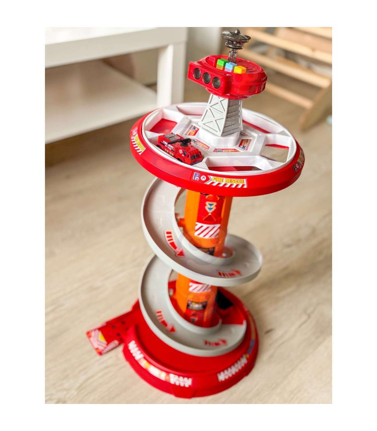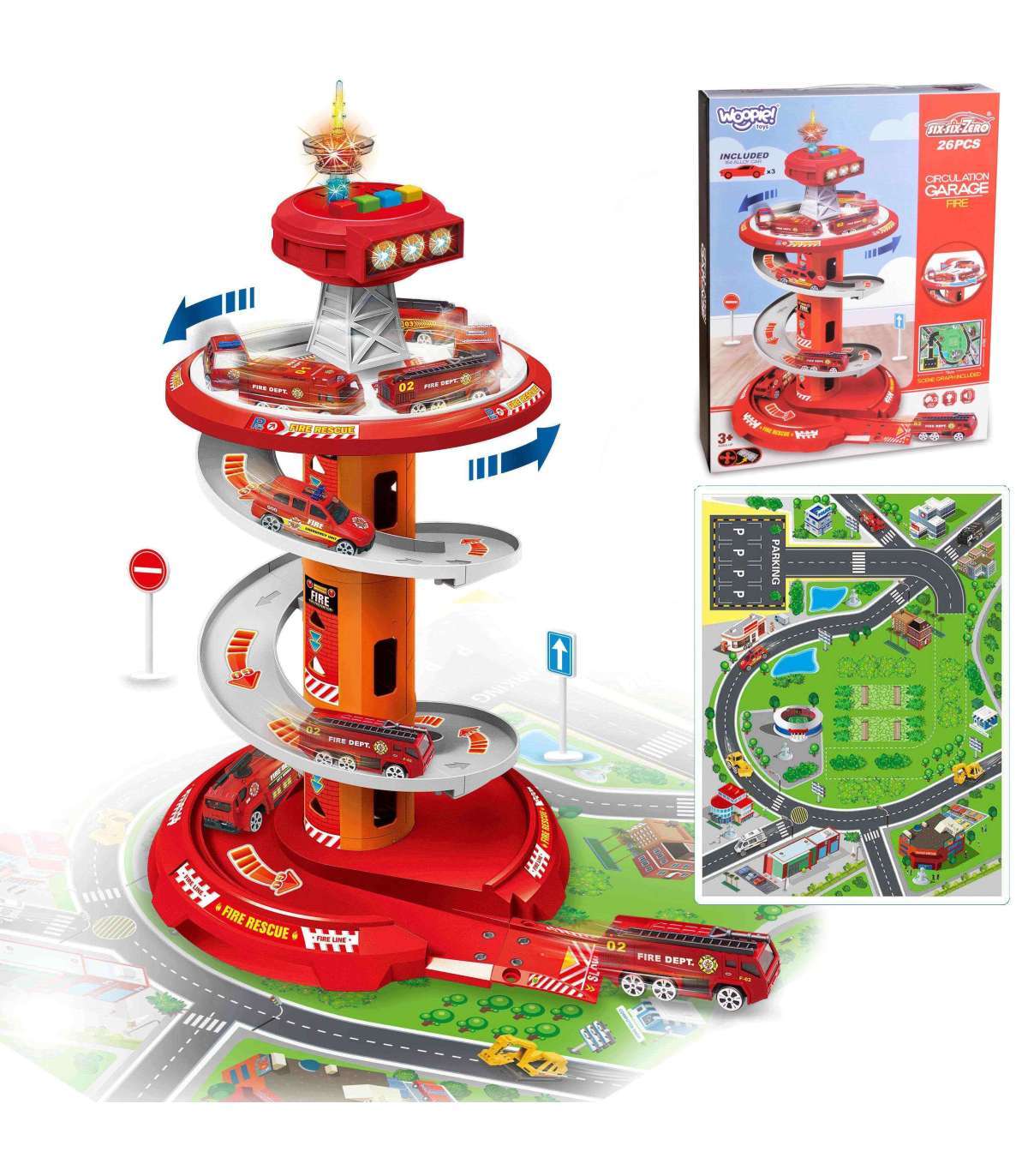 Suurepärane mitmetasandiline pöörlev parkla-garaaž päästeametile firmalt Woopie köidab kindlasti lapse huvi. See mänguasi ergutab iga vormiteenistuste fänni kujutlusvõimet: pärast parklast väljumist läheb see komplekti kuuluvale teele. Autode kiire laskumine erinevatelt tasanditelt on võimalik tänu erilisele looklevale laskumisteele. Lisaks sisaldab komplekt 3 erinevat tuletõrjeautot.