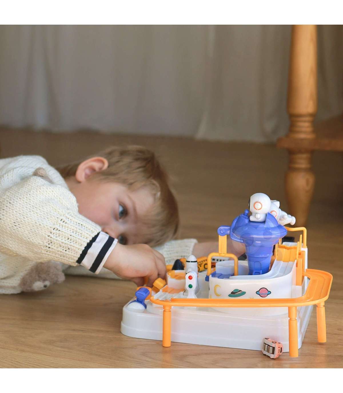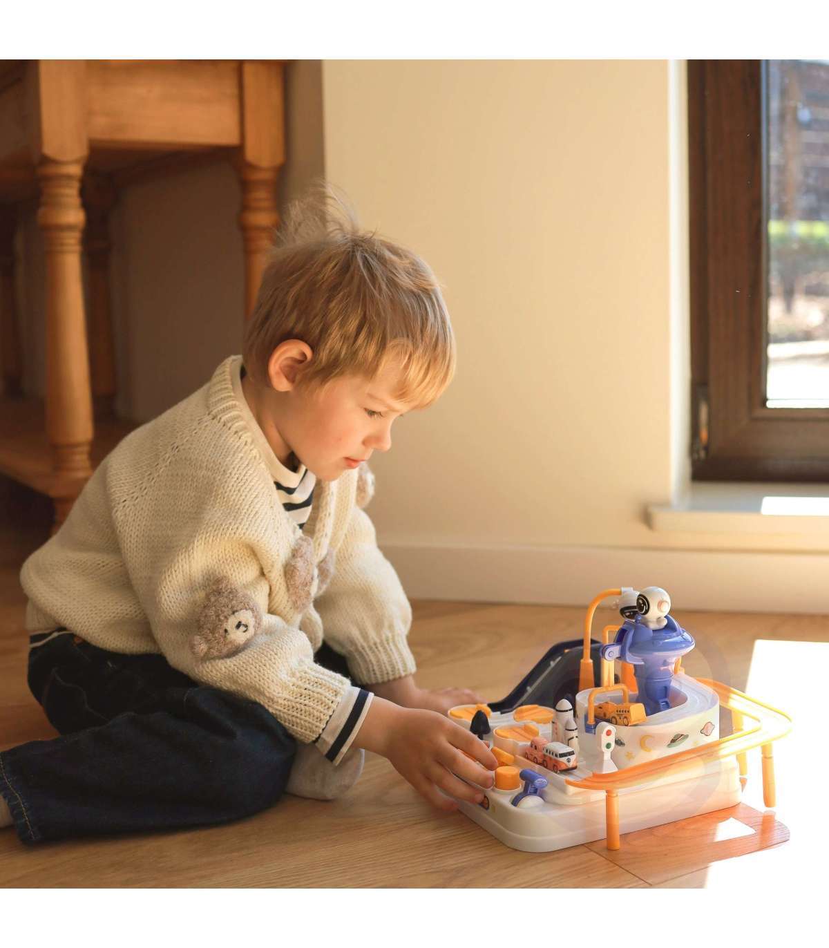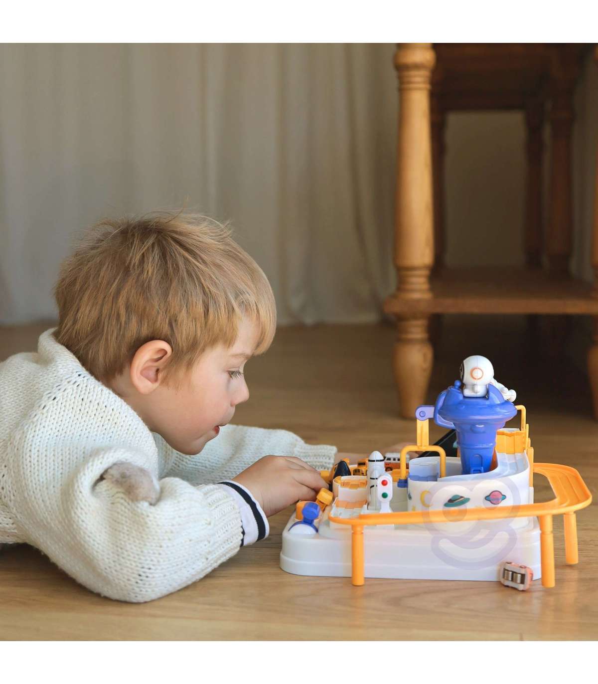 Interaktiivne takistusraja "Astronaudi seiklus" on erakordne kingitus väikestele avastajatele, kes ihaldavad põnevaid seiklusi ja unustamatuid väljakutseid. See on rohkem kui mänguasi — tõeline areen, kus lapsed saavad kehastuda juhtideks ja ületada erinevaid takistusi. Läbimõeldud ehituse ja mitmekesiste elementide tõttu pakub mänguasi unustamatuid hetki täis põnevust ja väljakutseid. See on ideaalne vahend kujutlusvõime ja käsitööoskuste arendamiseks, samal ajal pakkudes palju lõbu. Autode rada pakub mitte ainult sõiduvõimalust, vaid ka dünaamilisi, interaktiivseid elemente, mida juhitakse nuppude ja pöördnuppudega. See on põnev mäng, mis nõuab keskendumist ja osavust. Komplektis on kolm autot, mis võivad lapse kujutlusvõimest lähtudes rada vabalt avastada. Sõidukid mitmekesistavad mängu või võimaldavad lastel rajal võistelda. Raja läbimine tundub lihtne, kuid arvukad elemendid nagu käigud või lahtikäivad sillad muudavad reisi adrenaliinirikkaks.