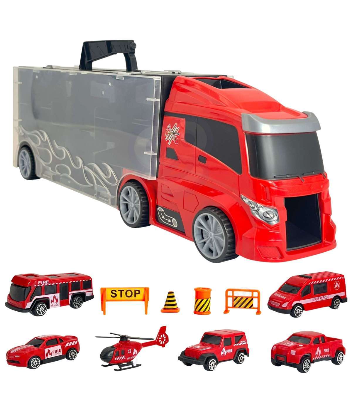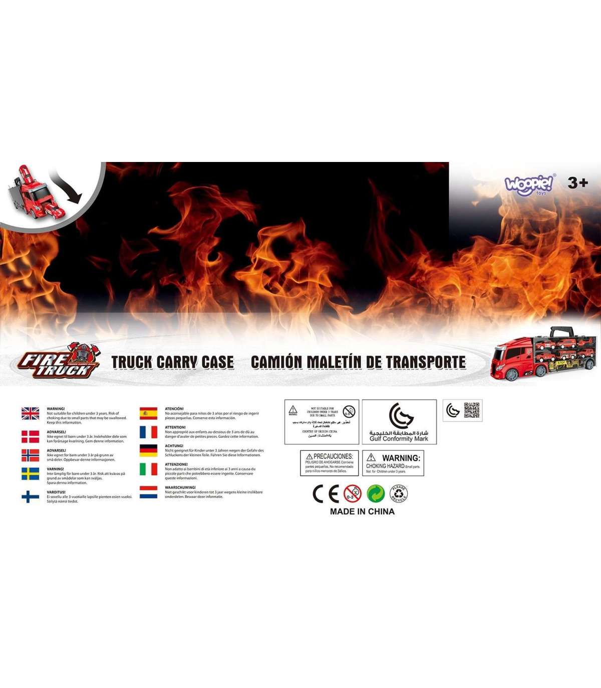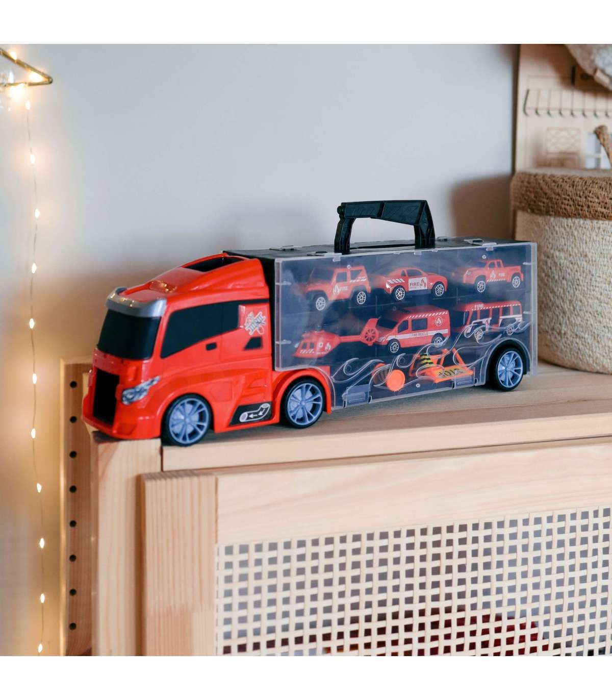 Tuletõrjeauto 3-ühes kaubamärgilt WOOPIE on ideaalne mänguasi igale väiksele päästeautode, transpordi ja tegevuse fännile! Komplekt koosneb suurest TIR-haagisest, mis mahutab kuni 4 tuletõrjeautot, helikopteri ja lisahoiatustahvleid, mis lisavad mängule realismi. Tänu haagisel paiknevale lansseerijale saavad lapsed autod välja tõsta ja neid lennutada erinevatele kaugustele. Haagis on 40 cm pikk, mistõttu mahutab see kõik sõidukid ja tarvikud. Komplekt arendab suurepäraselt lapse kujutlusvõimet, innustades looma enda mängustsenaariume. Tänu hoiatusmärkidele saavad nad õppida teeohutuse põhitõdesid, muutes mängu nii harivaks kui kaasahaaravaks.