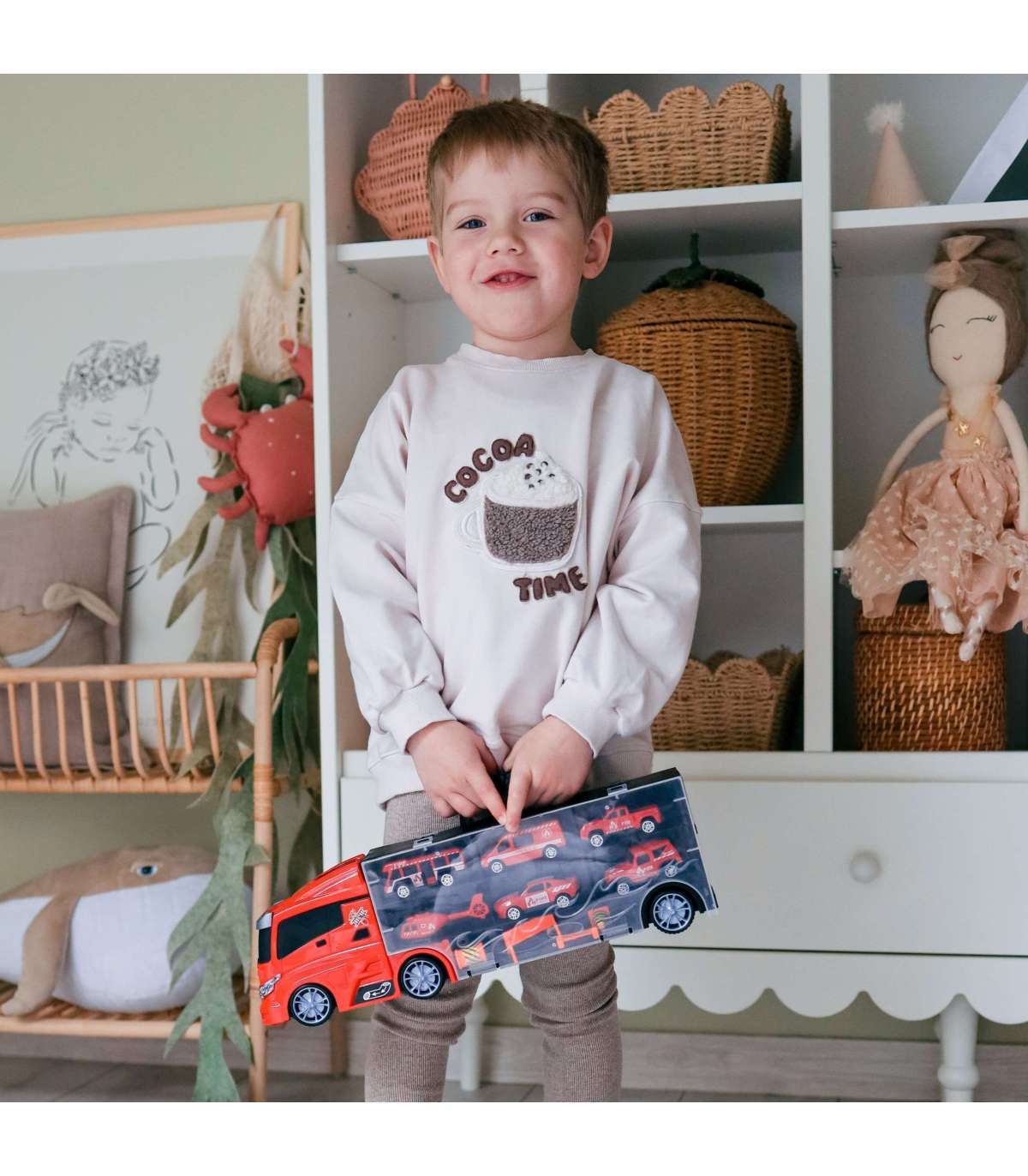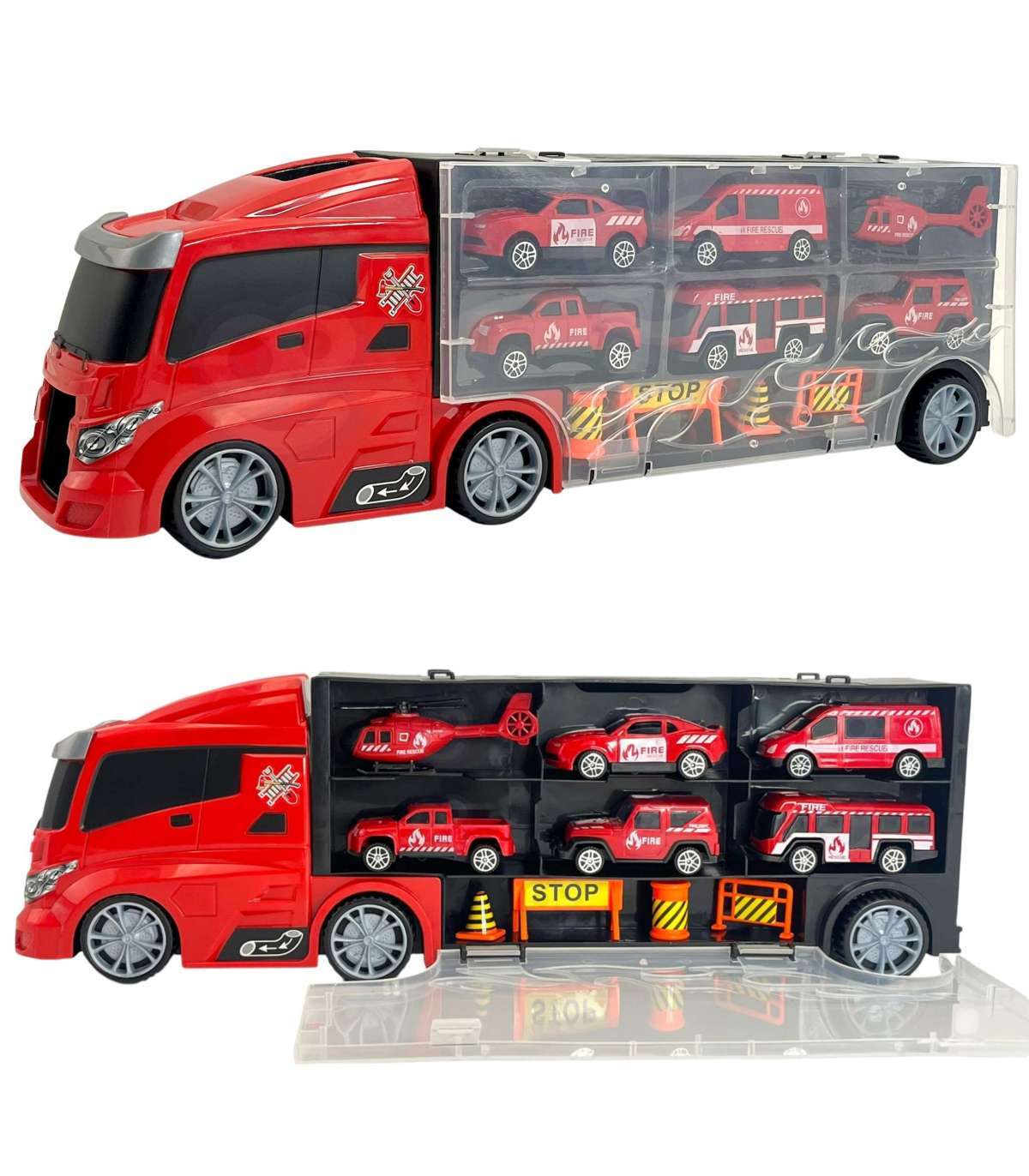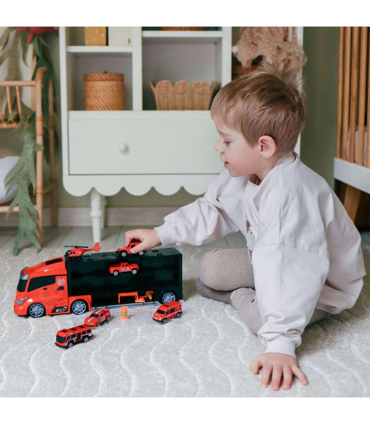 Tuletõrjeauto 3-ühes kaubamärgilt WOOPIE on ideaalne mänguasi igale väiksele päästeautode, transpordi ja tegevuse fännile! Komplekt koosneb suurest TIR-haagisest, mis mahutab kuni 4 tuletõrjeautot, helikopteri ja lisahoiatustahvleid, mis lisavad mängule realismi. Tänu haagisel paiknevale lansseerijale saavad lapsed autod välja tõsta ja neid lennutada erinevatele kaugustele. Haagis on 40 cm pikk, mistõttu mahutab see kõik sõidukid ja tarvikud. Komplekt arendab suurepäraselt lapse kujutlusvõimet, innustades looma enda mängustsenaariume. Tänu hoiatusmärkidele saavad nad õppida teeohutuse põhitõdesid, muutes mängu nii harivaks kui kaasahaaravaks.