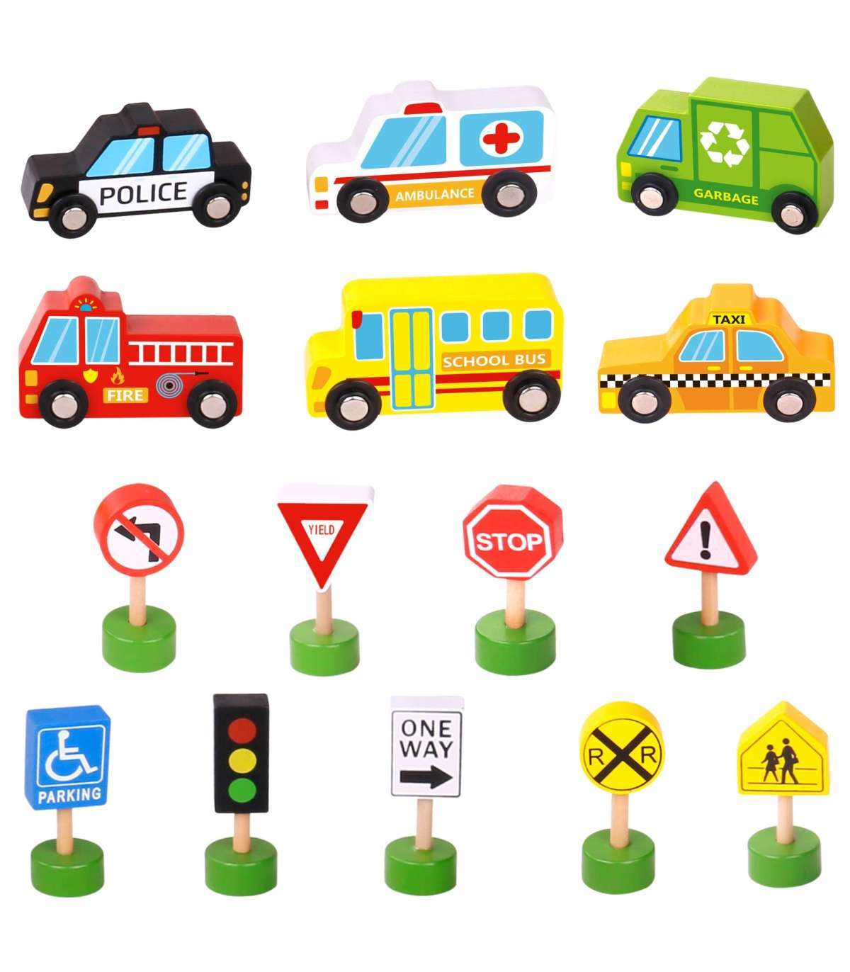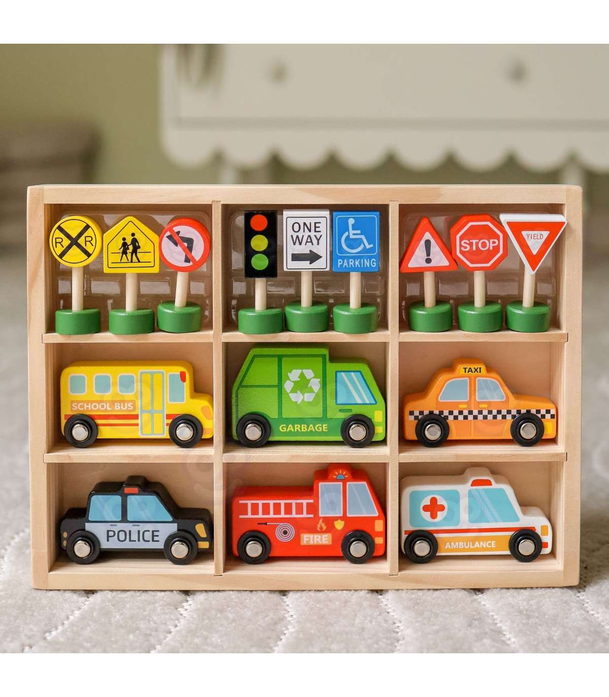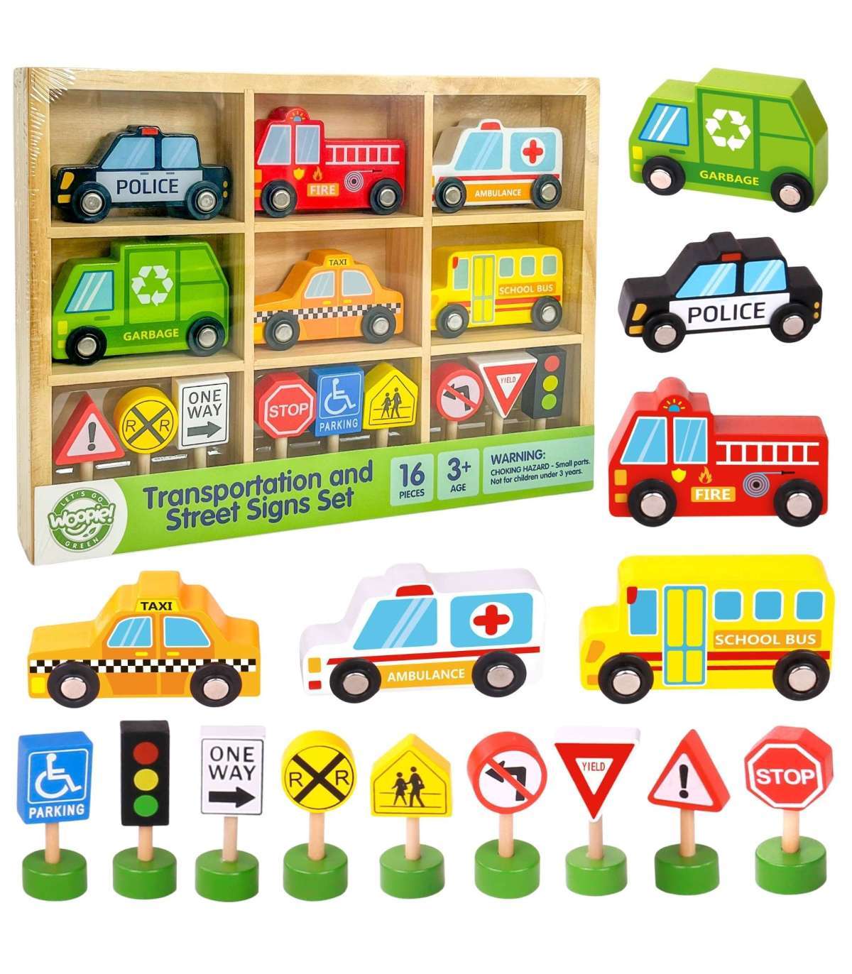 WOOPIE GREEN Puidust sõidukite ja liiklusmärkide komplekt, 15 osa