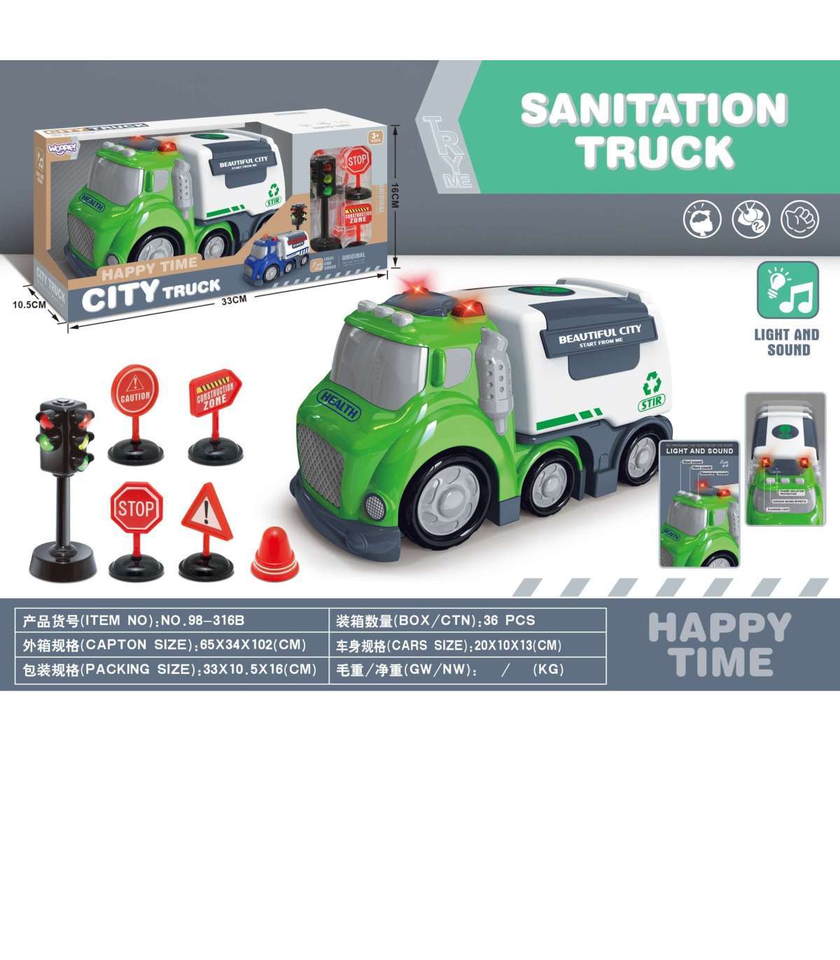 Sanitation Truck mudelist CITY TRUCK on ideaalne mänguasi igale väikesele auto- ja linnaspetsiaalsete sõidukite fännile. Komplekti kuulub realistlikult kujutatud prügiauto, valmistatud vastupidavast plastikust, varustatud valgus- ja heliefektidega, mis aktiveeruvad katusel oleva nupu vajutamisel. Mänguasjal on aksessuaarid nagu vilkur, liiklusmärgid ja liikluskoonus.