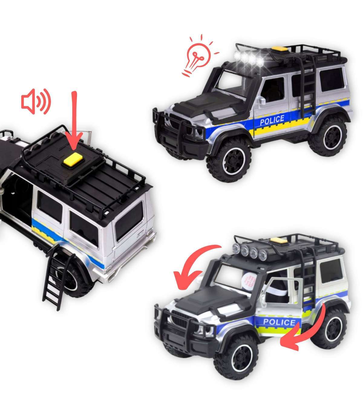 Wyrusz na emocjonującą akcję policyjną z realistycznym zestawem samochodu terenowego i przyczepy do przewozu koni od marki WOOPIE! Czarno-niebieski pojazd wykonany z wysokiej jakości tworzywa zachwyca szczegółami i dbałością o detale. Efekty świetlne i dźwiękowe sprawiają, że zabawa nabiera prawdziwego charakteru służb specjalnych. Otwierane drzwi oraz odpinana przyczepa pozwalają na tworzenie niezliczonych scenariuszy zabawy. To idealny zestaw dla małych fanów policji, motoryzacji i kreatywnej zabawy w akcje ratunkowe!