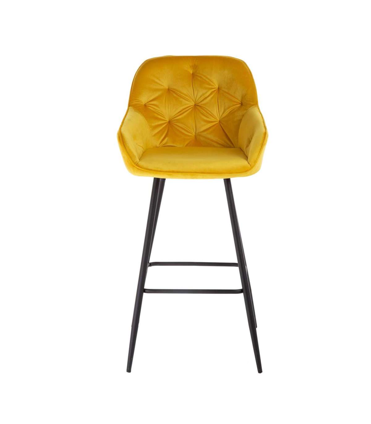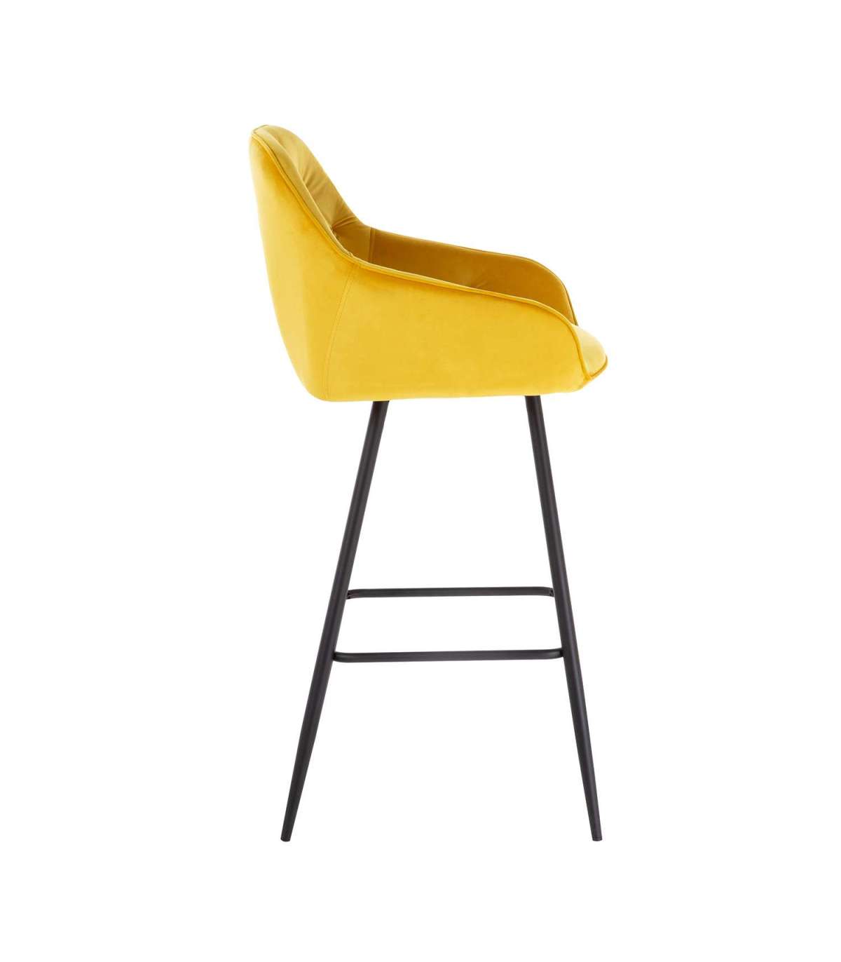 Baaritool BRITA, kollane samet. Mugava vormiga painutatud vineerist iste on kergelt polsterdatud ja kaetud sametkangaga. Kattematerjal: 100% polüester, 260g/m². Martindale 25 000. Tooli jalad ja alusraam on valmistatud metallist ja viimistletud musta pulbervärviga. Tooli üldmõõdud on 53x55xH109cm, istme laius 38cm, istme sügavus 43cm, istme kõrgus 75cm. Seljatoe kõrgus 37cm, jalatoe kõrgus 29cm. Kaalupiirang 120kg.