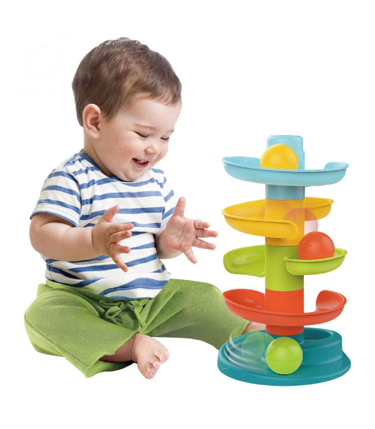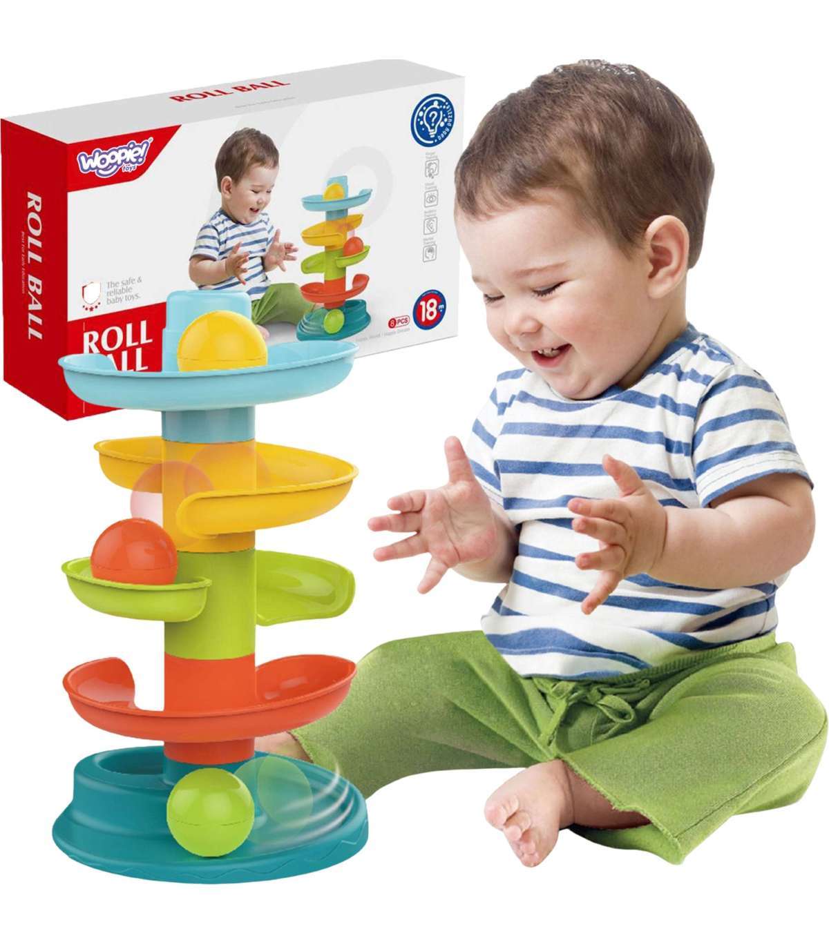 Woopie pallirada on spiraaltorn, mis pakub lõputut lõbu. See komplekt koosneb 5 värvilisest osast, mida väikelaps saab hõlpsasti üksteise peale laduda. Pallid veerevad kõige kõrgemast liugseadmest alla kuni põhjani. Pallirada on varustatud 3 kergesti haaratava palliga eri värvides, mis liikumisel tekitavad heli. Suurus sobib väikestele kätele ja aitab arendada silma-käe koordinatsiooni.