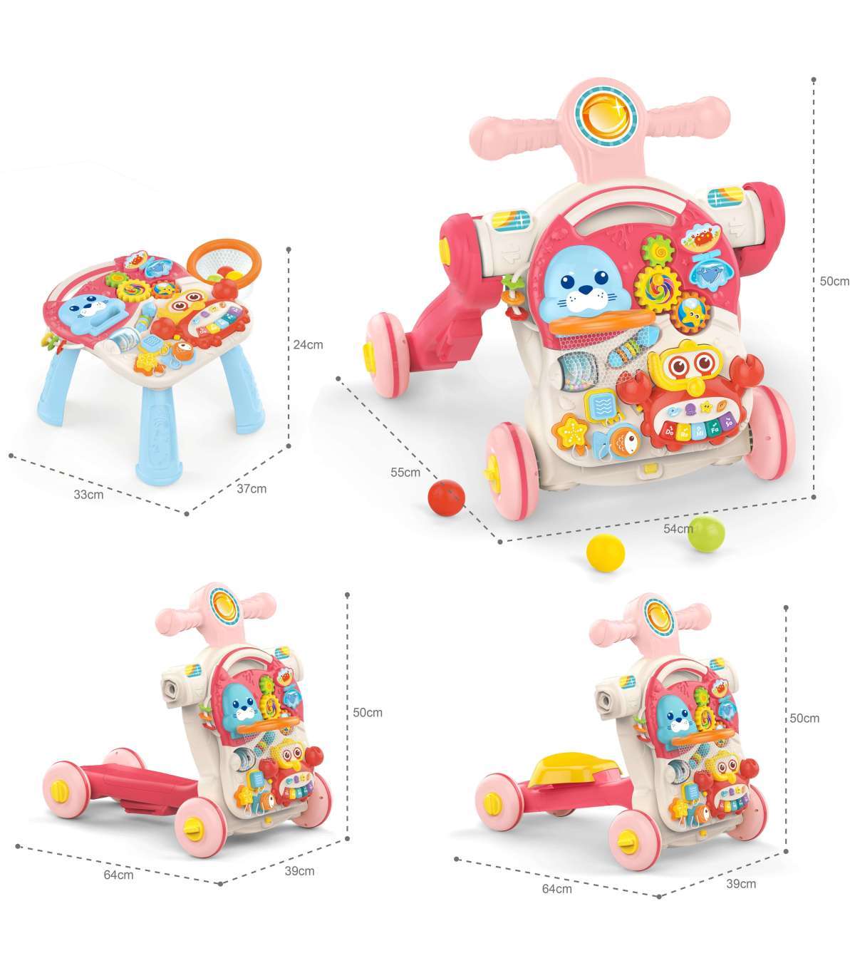 - õppe-mänguasi 4-ühes: tõukemänguasi, tõukeratas, sõiduk, laud