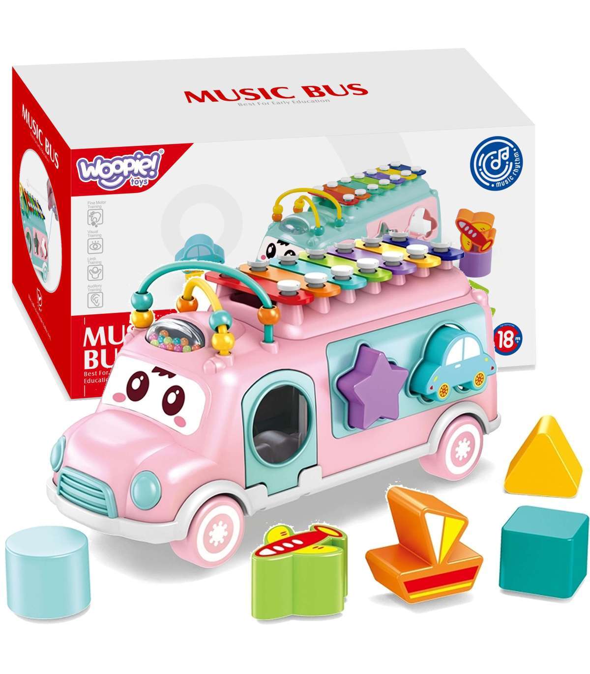 Roosa muusikaline sorteerimisauto tsümbalitega brändilt Woopie on armas pastelltoonides auto, mis rõõmustab iga väikest last. See pakub palju võimalusi suhtlemiseks ja meelte stimuleerimiseks ning arendab ka lapse motoorseid ja loogilisi oskusi. Autol on palju elemente manipuleerimiseks ja avastamiseks. Laps saab kasutada kaasasolevat vasart, et mängida auto katusele kinnitatud värviliste tsümbalitega. Auto külgedel on erineva kujuga avad; mänguasja juurde kuuluvad värvilised klotsid, mis sobivad nendesse avaustesse. Laps saab mängida klotside sobitamist vastavatele kujudele, mis aitab arendada käe-silma koordinatsiooni ja värvitunnetust. Katusel olevad helmed, mida laps saab liigutada, treenivad lapse osavust ja keskendumist.
