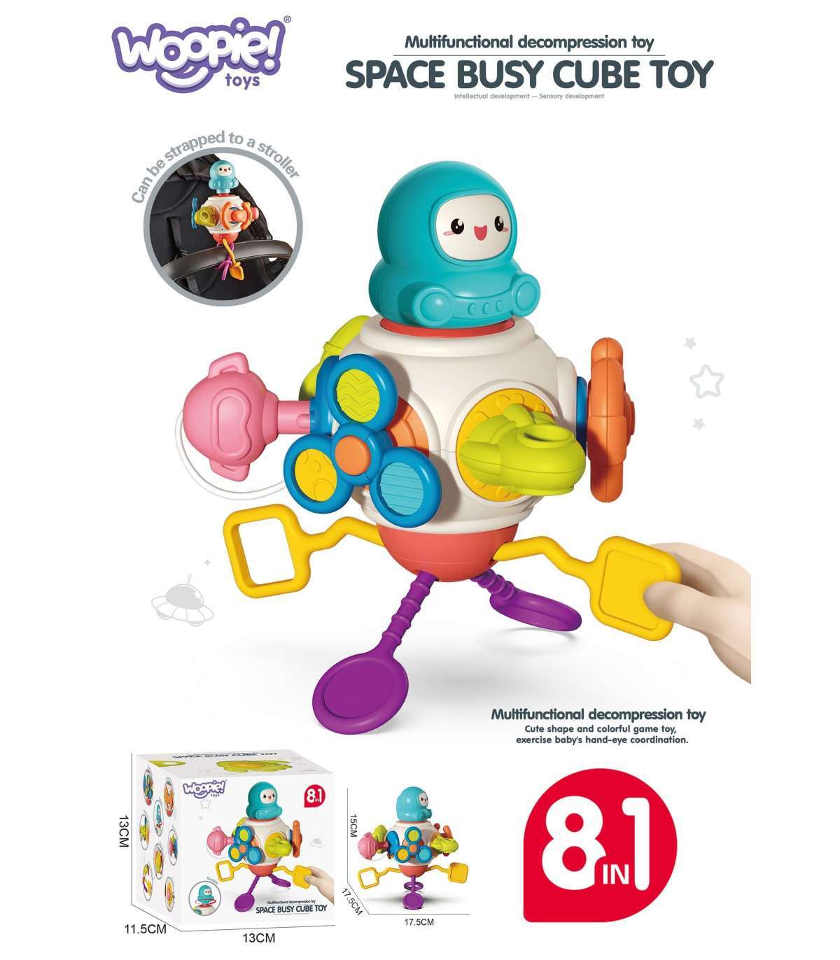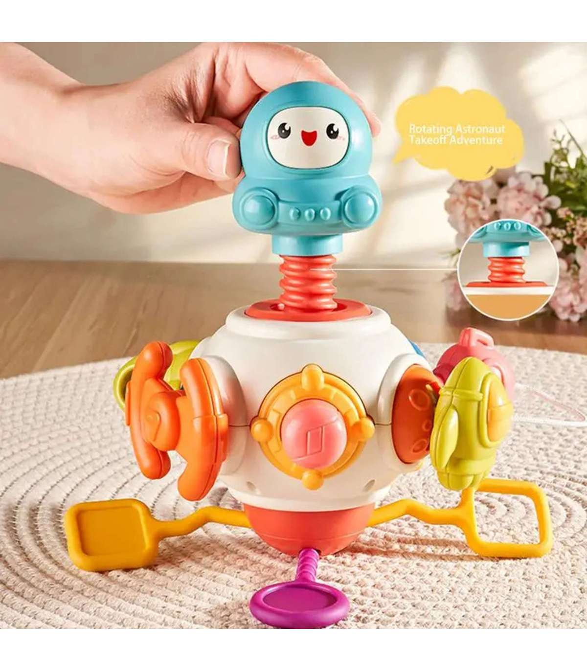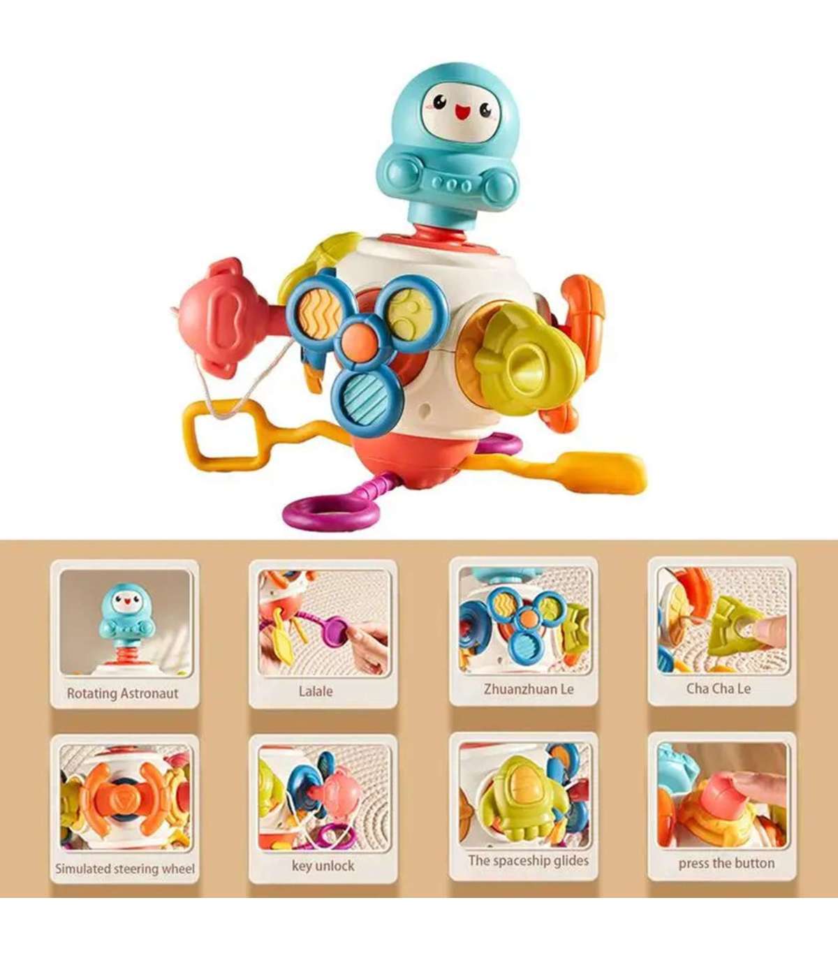 - See sisaldab palju erinevaid elemente, mis stimuleerivad lapse meeli, nagu pöörlev astronaud või spinner.