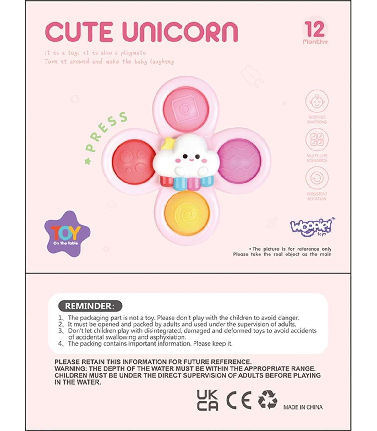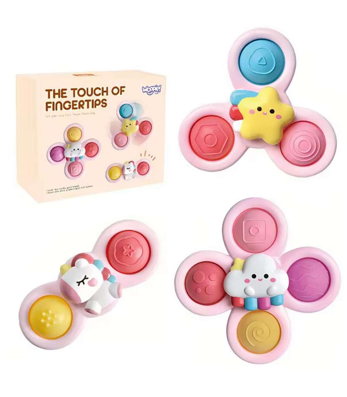 Armas spinnerite komplekt brändilt WOOPIE avaldab lapsel suurt muljet. Komplektis on 3 tk. spinnerit: Ükssarvik, Täht, Pilv. Laps saab spinnerid igale poole kaasa võtta ja kleepida tänu kummist iminappadele. Spinnerit saab kinnitada nii aknale sõidu ajal kui ka vanni vanniskäigu ajal (mänguasja võib märjaks teha). Spinnerite laagrid tagavad pikaajalise pöörlemise. Eemaldatavad osad võimaldavad neid omavahel vabalt ühendada. Mänguasjadel on kummiosad erinevate pindadega, mis arendavad lapse meeli ja aitavad stressi vähendada. Mäng arendab käeosavust ja parandab käe-silma koordinatsiooni. Need mänguasjad võivad toimida lõõgastumise ja stressi vähendamise vahendina, aidates saavutada rahu ja lõõgastuse seisundit.