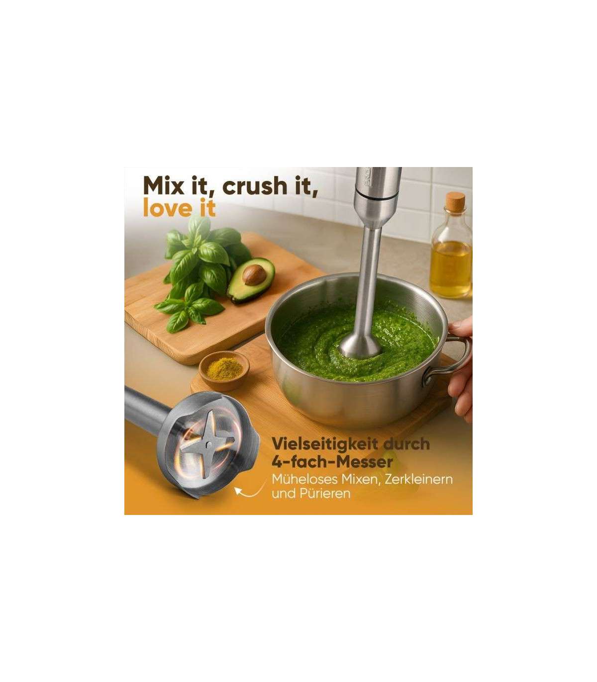 4-kordne roostevabast terasest tera lihtsaks ja kiireks segamiseks, hakkimiseks ja püreestamiseks
