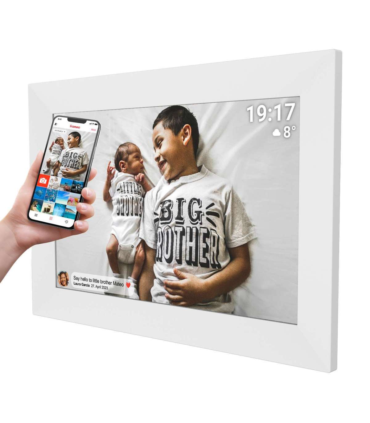 Laadige rakendus oma nutitelefoni alla ja seejärel lükake fotod ja videod FRAMEO pildiraamile – see sobib suurepäraselt, kui annate Frameo mõnele pereliikmele jne.