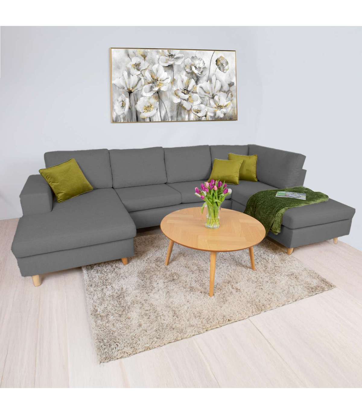 Suur U-kujuline nurgadiivan võlub oma selge ja neutraalse disainiga ning sobitub suurepäraselt erinevas stiilis sisekujundusega. Mõnusate pehmete patjadega diivan on parim koht lõõgastumiseks ja mahutab vajadusel palju istujaid.