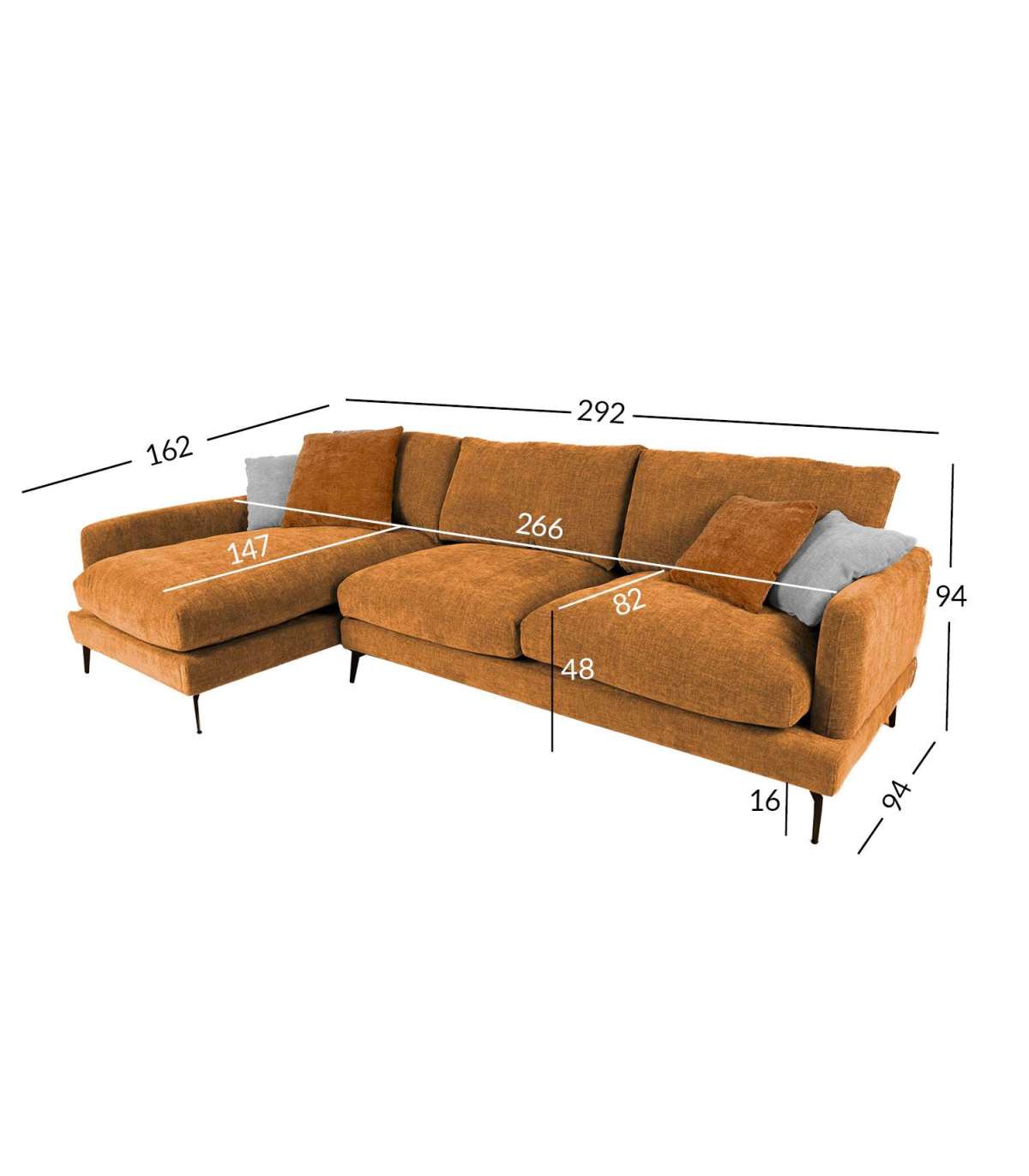 Diivani üldmõõdud on 292x162/94xH94cm. Istme laius 266cm, istme sügavus 82/147cm, istme kõrgus 48cm.