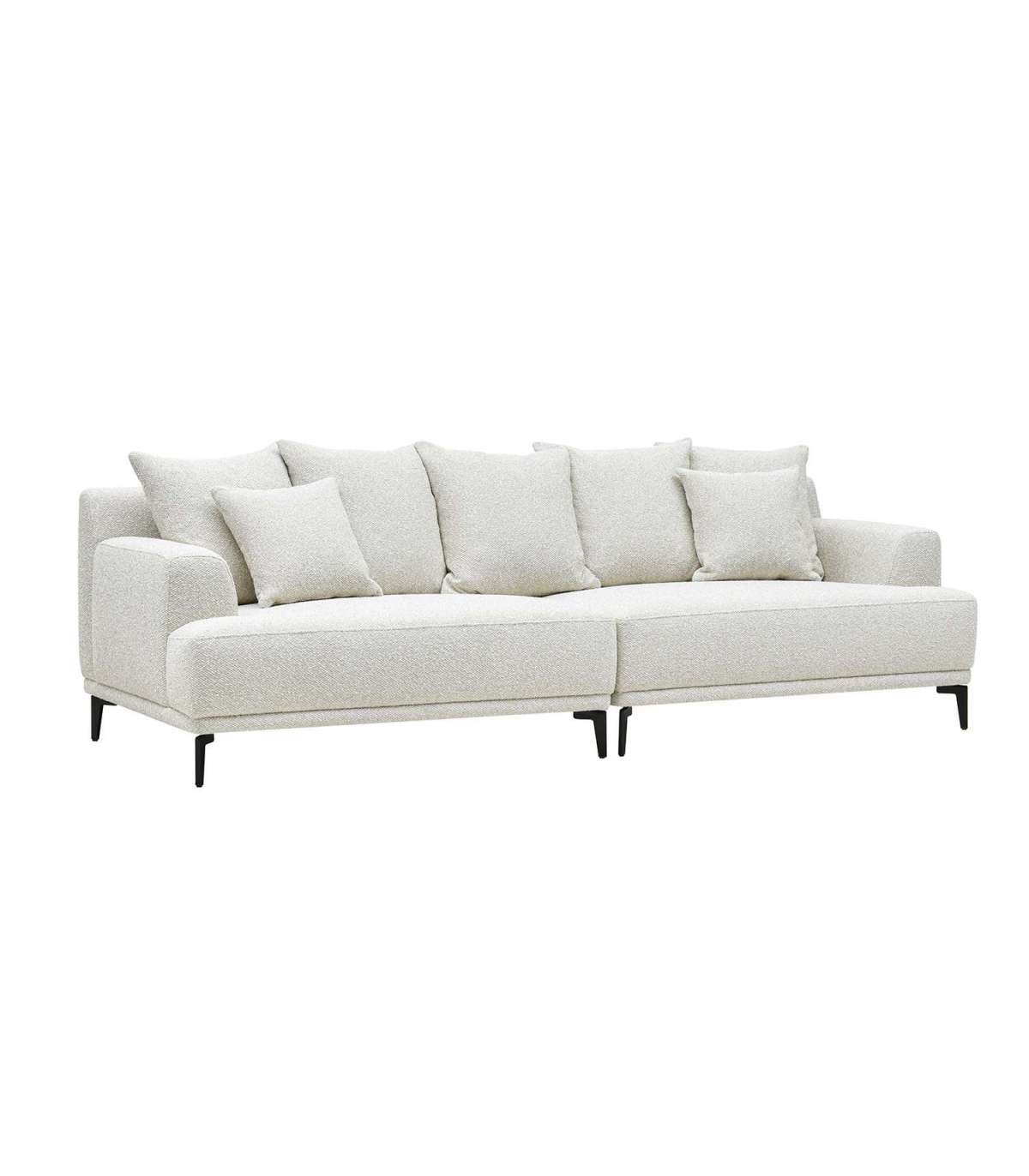Diivan MAGNOLIA 4-kohaline, helebee˛. Luksuslik, efektse kangaga kaetud hele diivan on tõeline pilgupüüdja. Lahtised seljatoepadjad mõjuvad kutsuvalt ja pakuvad suurepärast mugavust. Diivani karkass on valmistatud männipuidust. Iste on polsterdatud kvaliteetse polüuretaanvahuga. Istmepõhjale annavad vajaliku toe ja elastsuse kvaliteetsed terasest sik-sak vedrud. Lahtised seljatoepadjad on täidetud mahulise polüesterkiuga. Seljatoepatjade mõõdud on 54x54cm / 5tk ja 42x42cm / 2tk. Diivan on üleni kaetud vastupidava, jämedakoelise struktuuriga polüesterkangaga. Diivani üldmõõdud on 264x96xH76cm. Istme laius 219cm, istme sügavus 60/75cm, istme kõrgus 45cm. Käetoe kõrgus maast 63cm, käetoe laius 18cm. Diivanil on mustad metallist jalad H15cm.