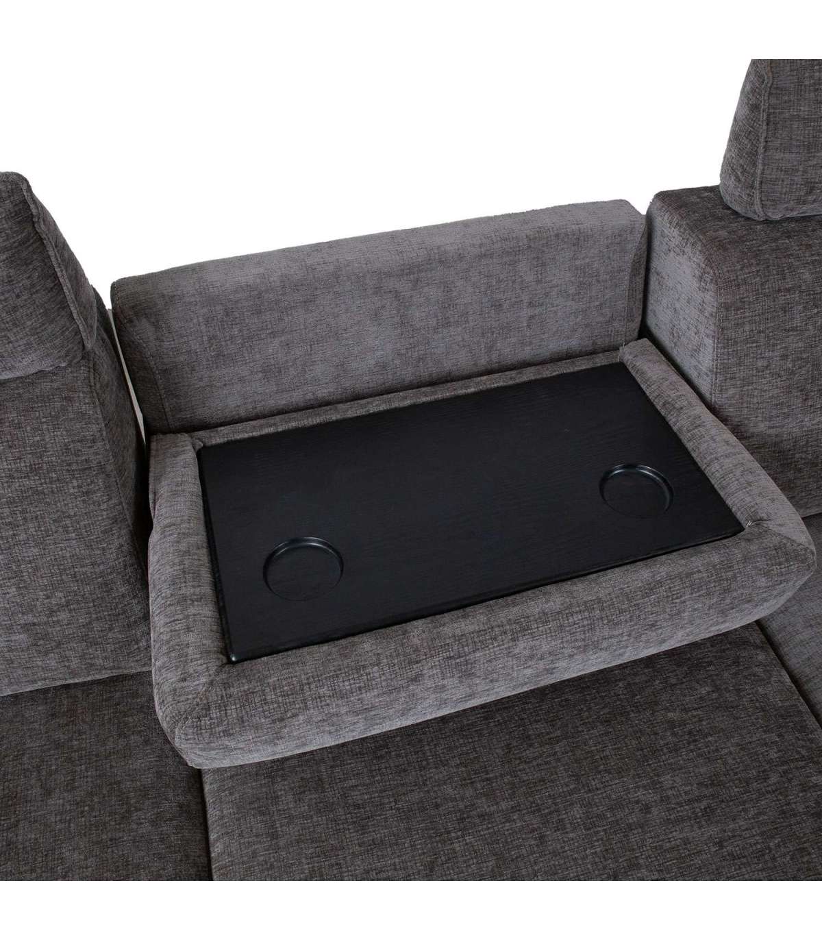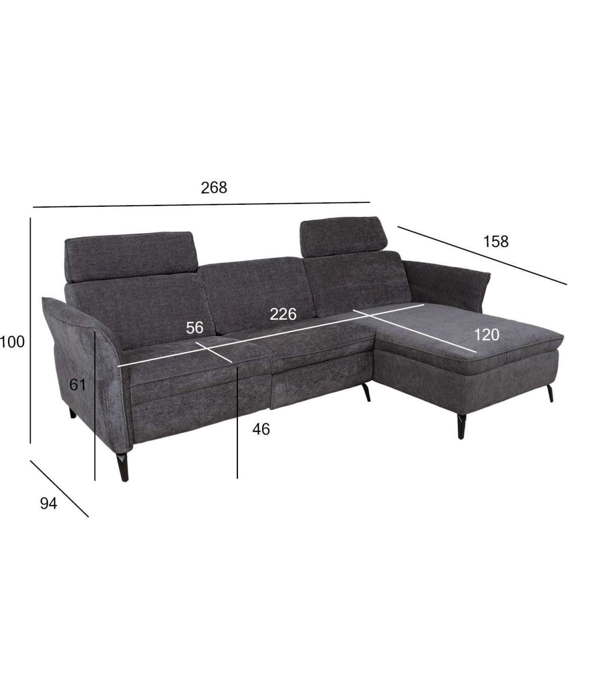 Nurgadiivan DAYTON PN, elektriline recliner, tumehall. Kaasaegse pehme mööbli juures on funktsionaalsus sama oluline, kui välimus ja mugavus. Diivani peatoed liiguvad üles-alla manuaalse mehhanismi abil. Vasakpoolse istme jalatoe asend on reguleeritav elektrilise mehhanismiga. Reguleerimisnupud asuvad istme ja käetoe vahel. Keskmise istme seljatoe saab muuta käepäraseks topsihoidjatega abilauaks. Lauaplaadi mõõdud on 58x32cm. Nurgaosa käetoe kõrgus on reguleeritav H60/70cm. Diivani karkass on valmistatud puidust ja vineerist. Polsterduseks on kasutatud polüuretaanvahtu. Diivan on üleni kaetud polüesterkangaga. Diivani üldmõõdud on 268x94/157xH80/100cm. Istme laius 226cm, istme sügavus 56/120cm, istme kõrgus 46cm. Diivanil on metallist jalad H13cm.