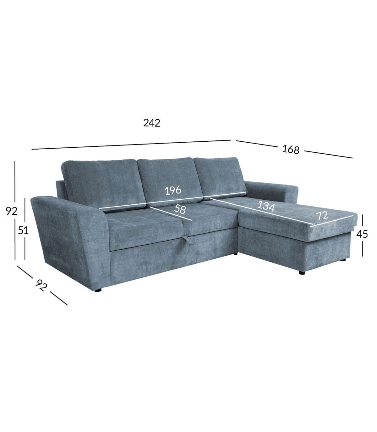 Diivani üldmõõdud on 242x168/92xH92cm. Diivani kõrgus raami ääreni 73cm. Istme kõrgus 45cm. Istme sügavus 58cm. Seljatoepadja mõõdud on 64x48x18cm. Magamisosa mõõdud avatuna 147x196cm. Diivani jalad on mustast plastikust.