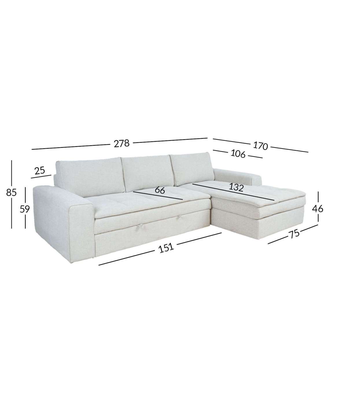 Diivani üldmõõdud on 278x106/170xH85cm. Istme laius 151+75cm, istme sügavus 66/132cm, istme kõrgus 46cm. Käetoe kõrgus maast 59cm, käetoe laius 25cm. Seljatoepadja mõõdud on 75x45x22cm.